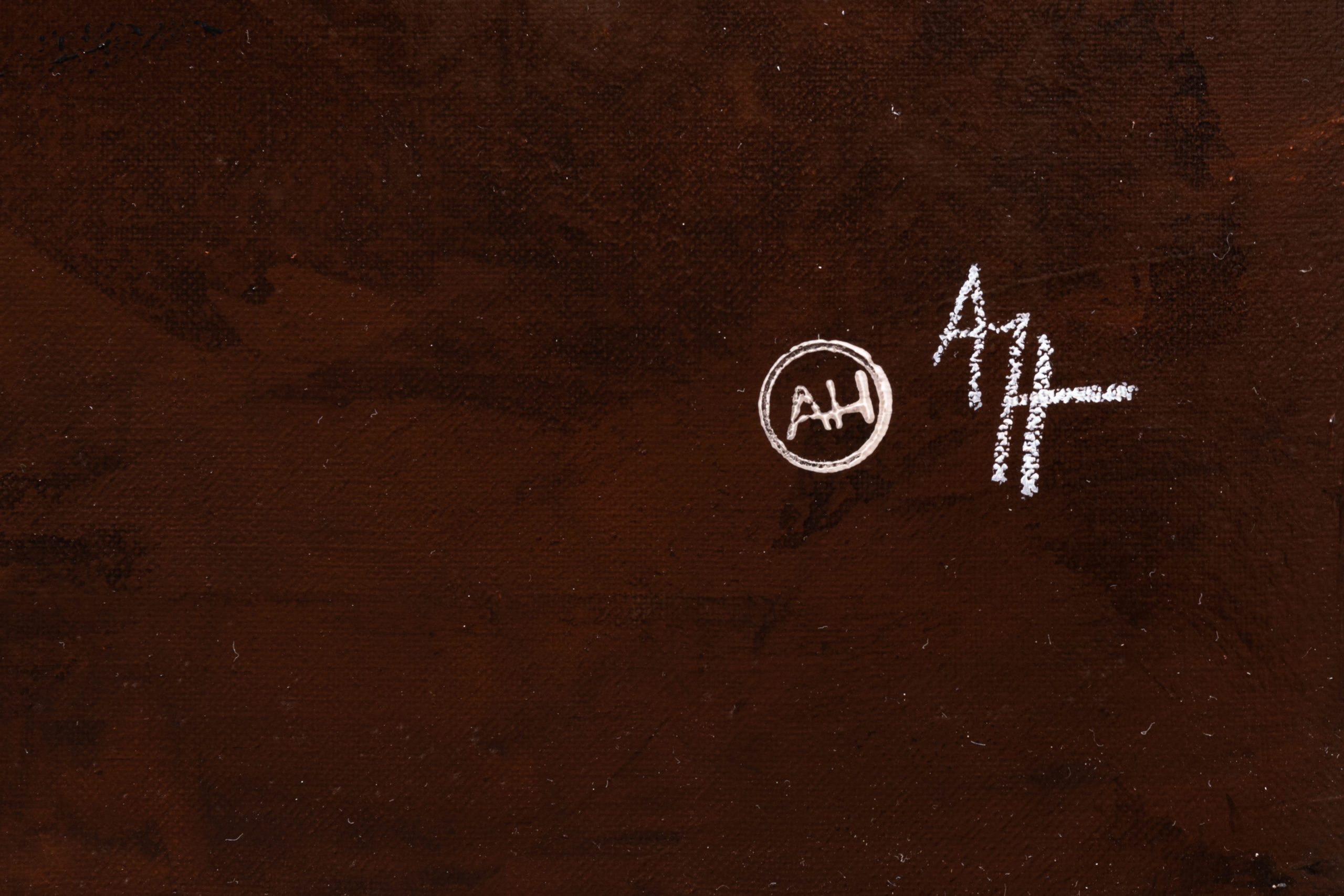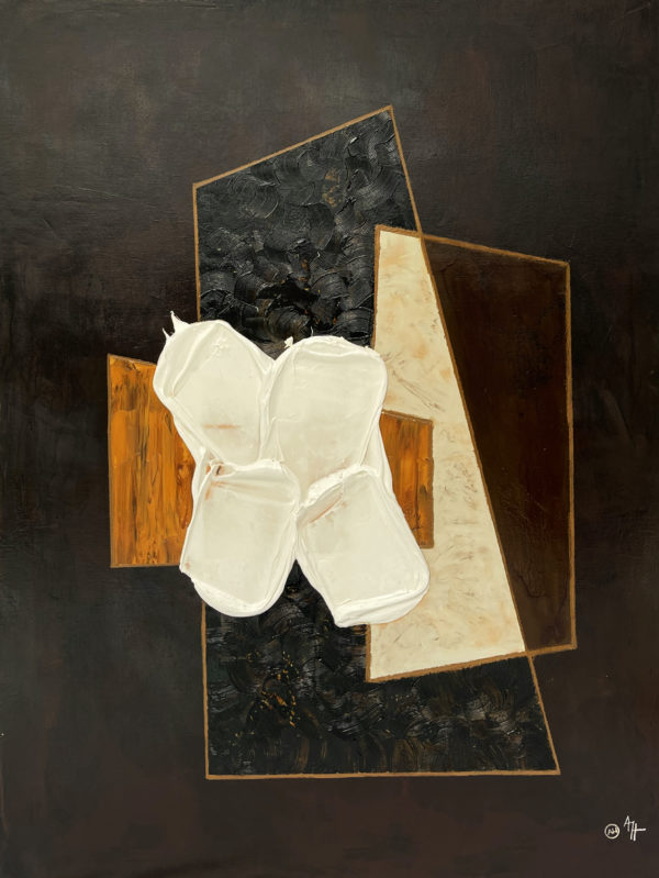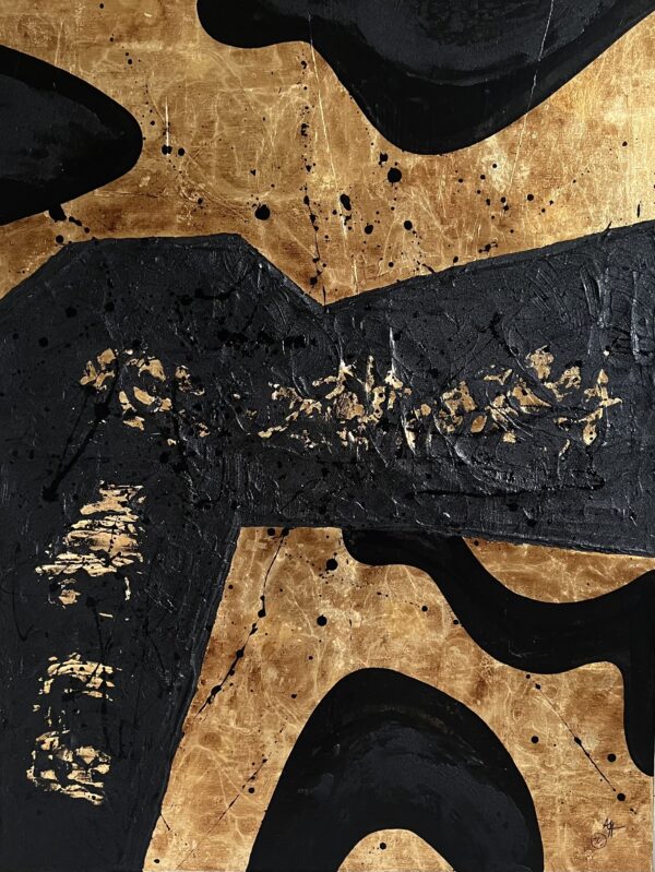 Techniques mixtes sur toile – Encadrement noir (Feuilles d’or et feuilles de cuivre, poudre de lave, laque noire)