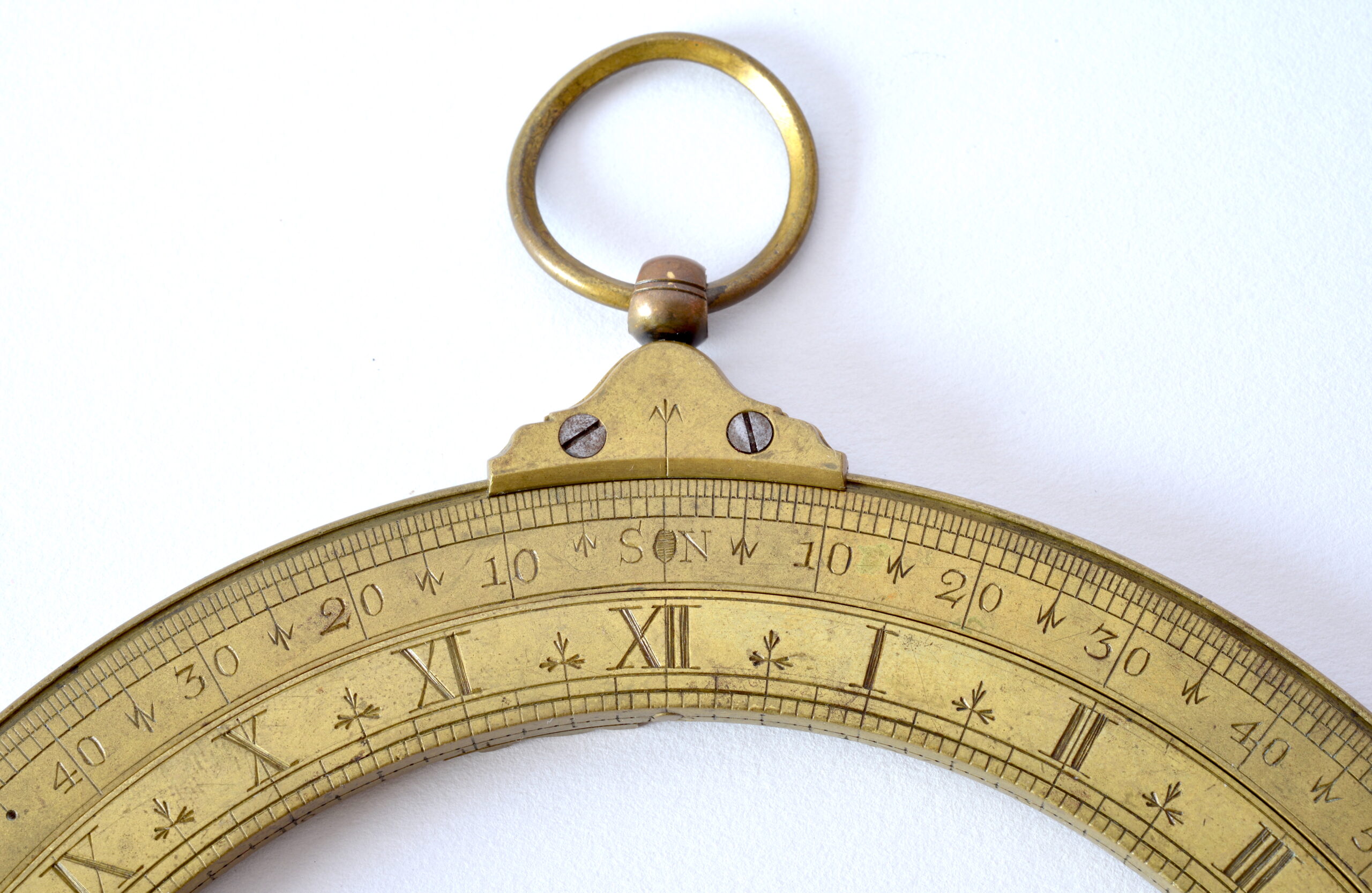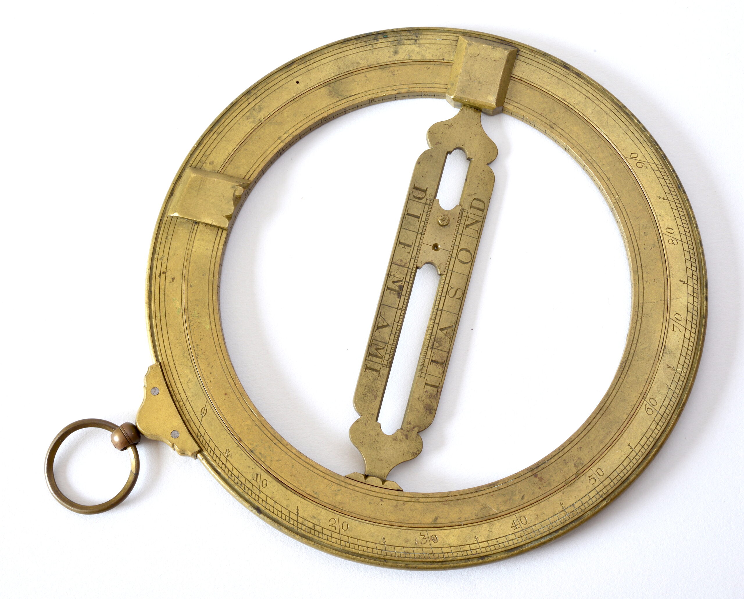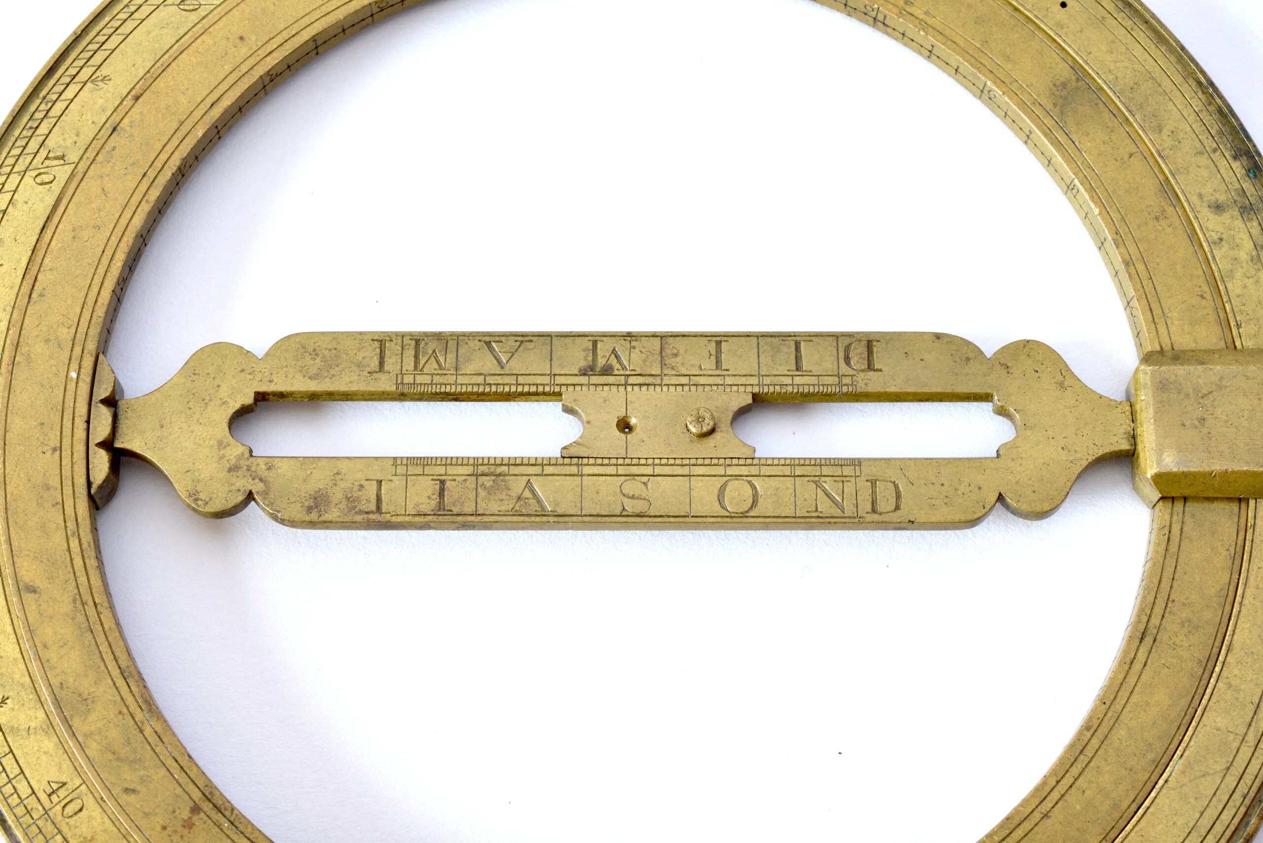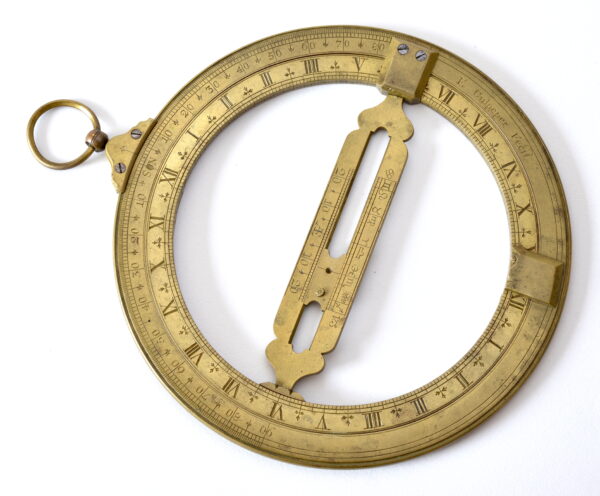 Le cercle méridien, côté signature, porte une échelle des latitudes 90-0-90. De l’autre côté une échelle graduée de 0 à 90 centrée sur le petit trou situé à l’opposé.