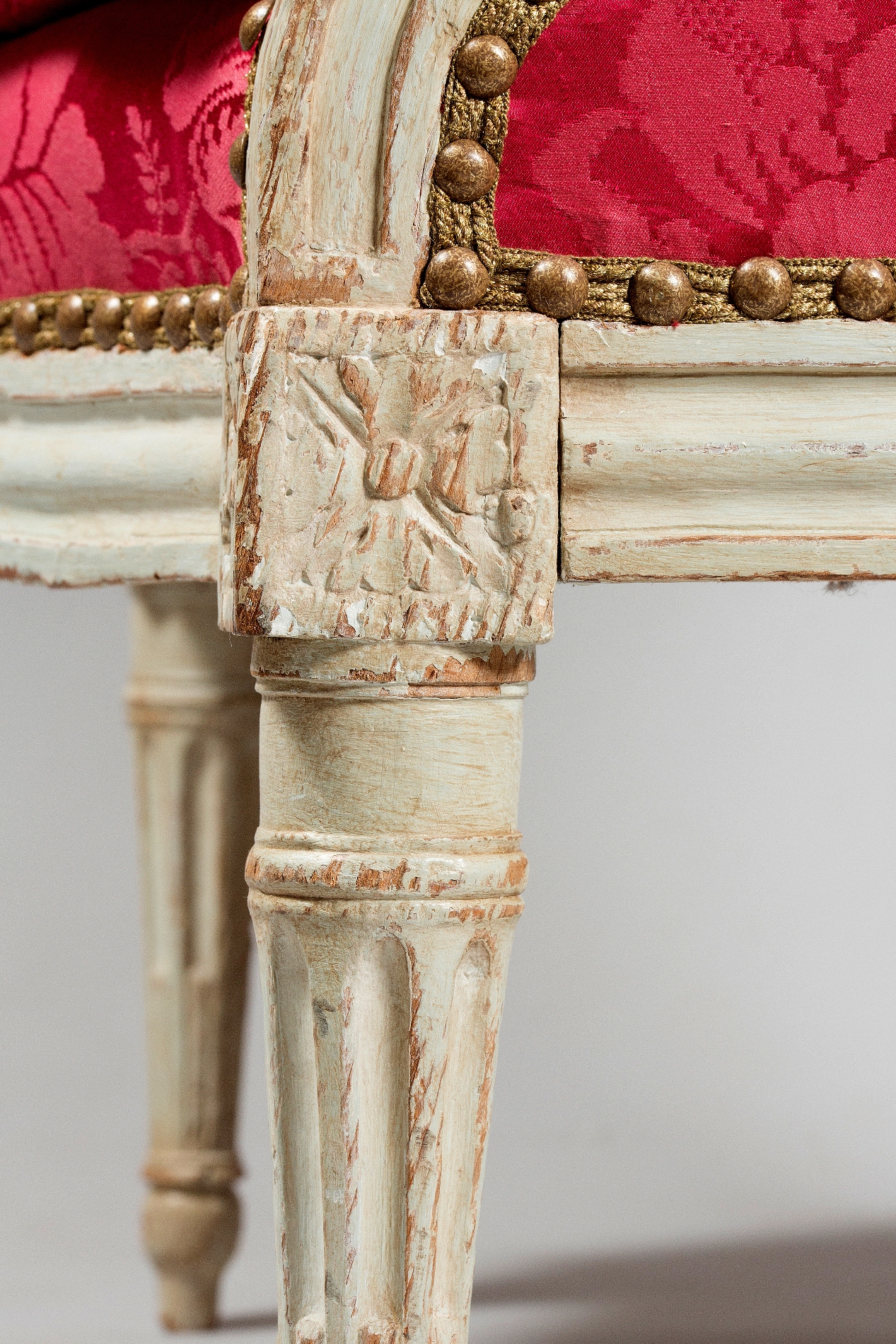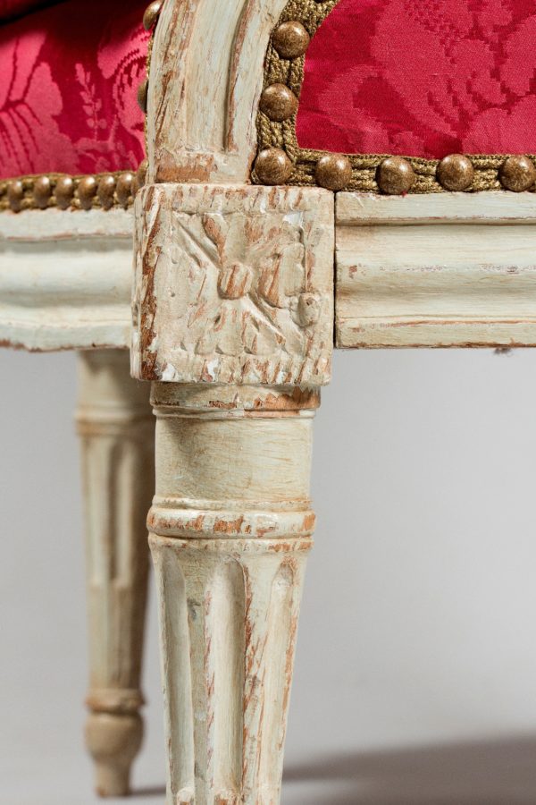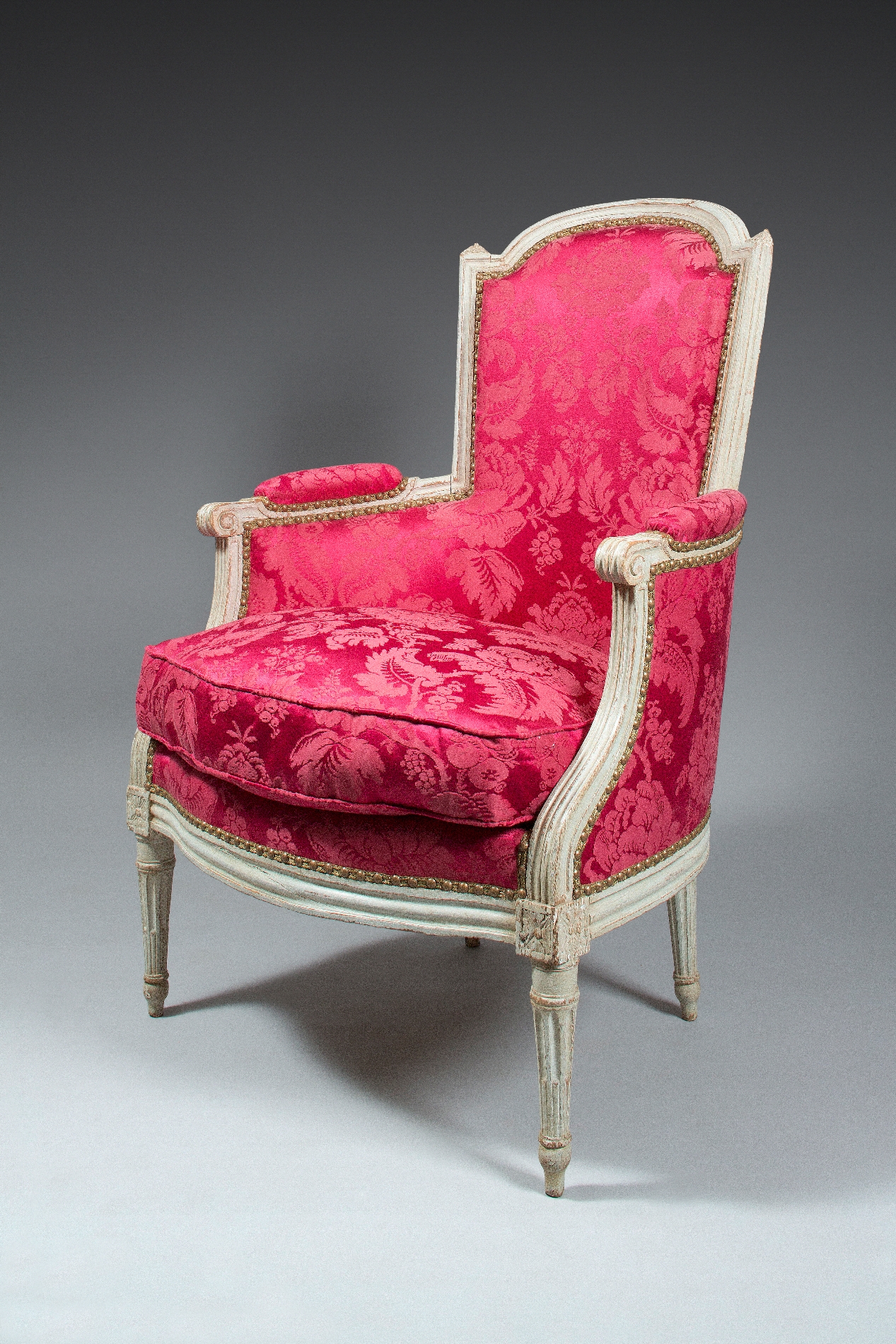 Bergère en hêtre laqué gris à dossier anse de panier, pieds fuselés et cannelés.