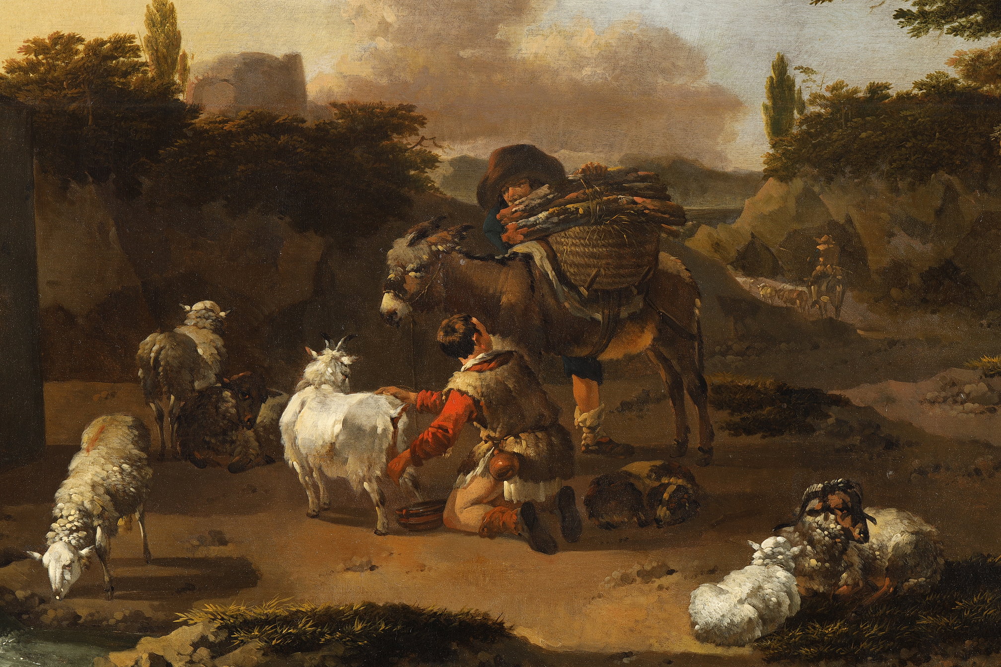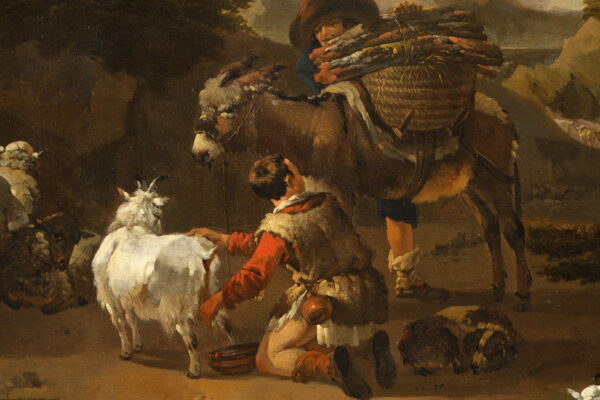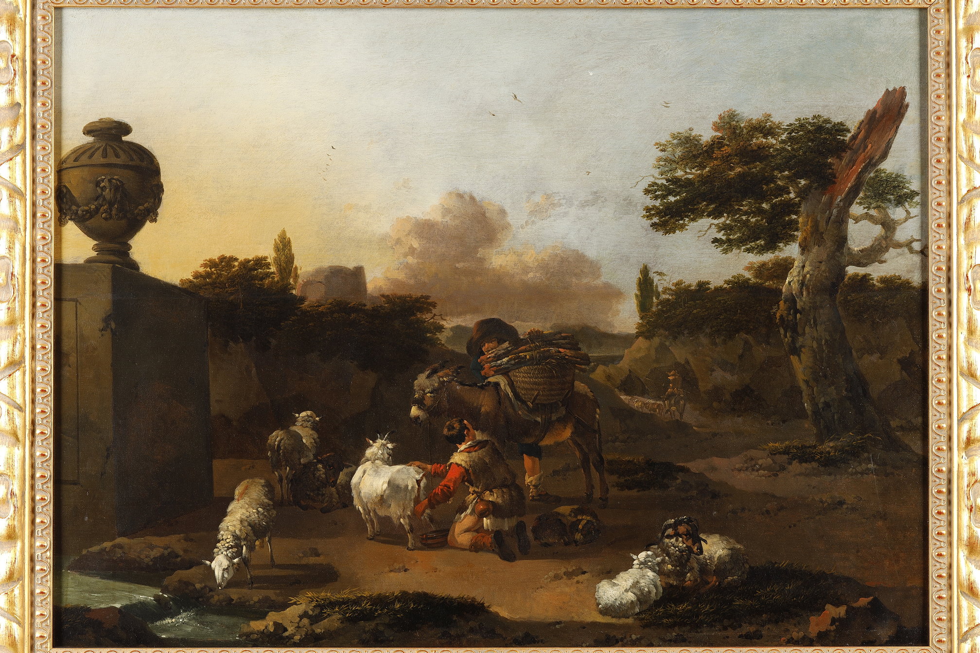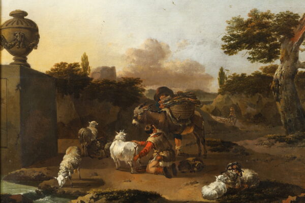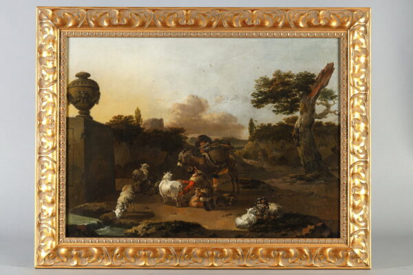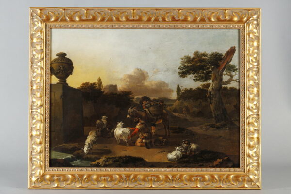 Oil on canvas by the great Flemish painter Jan Frans Soolmaker (1635 – probably around 1686) whose paintings reflect an Italianate style often depicting shepherds and flocks or like an Arcadian scene.