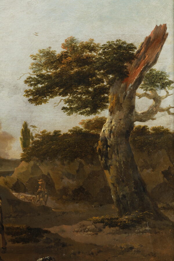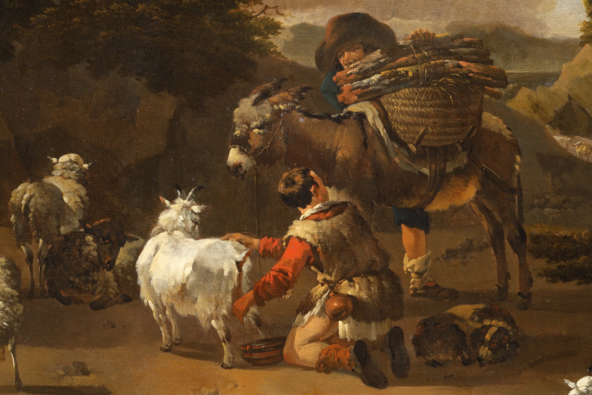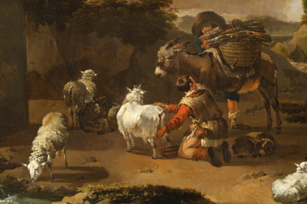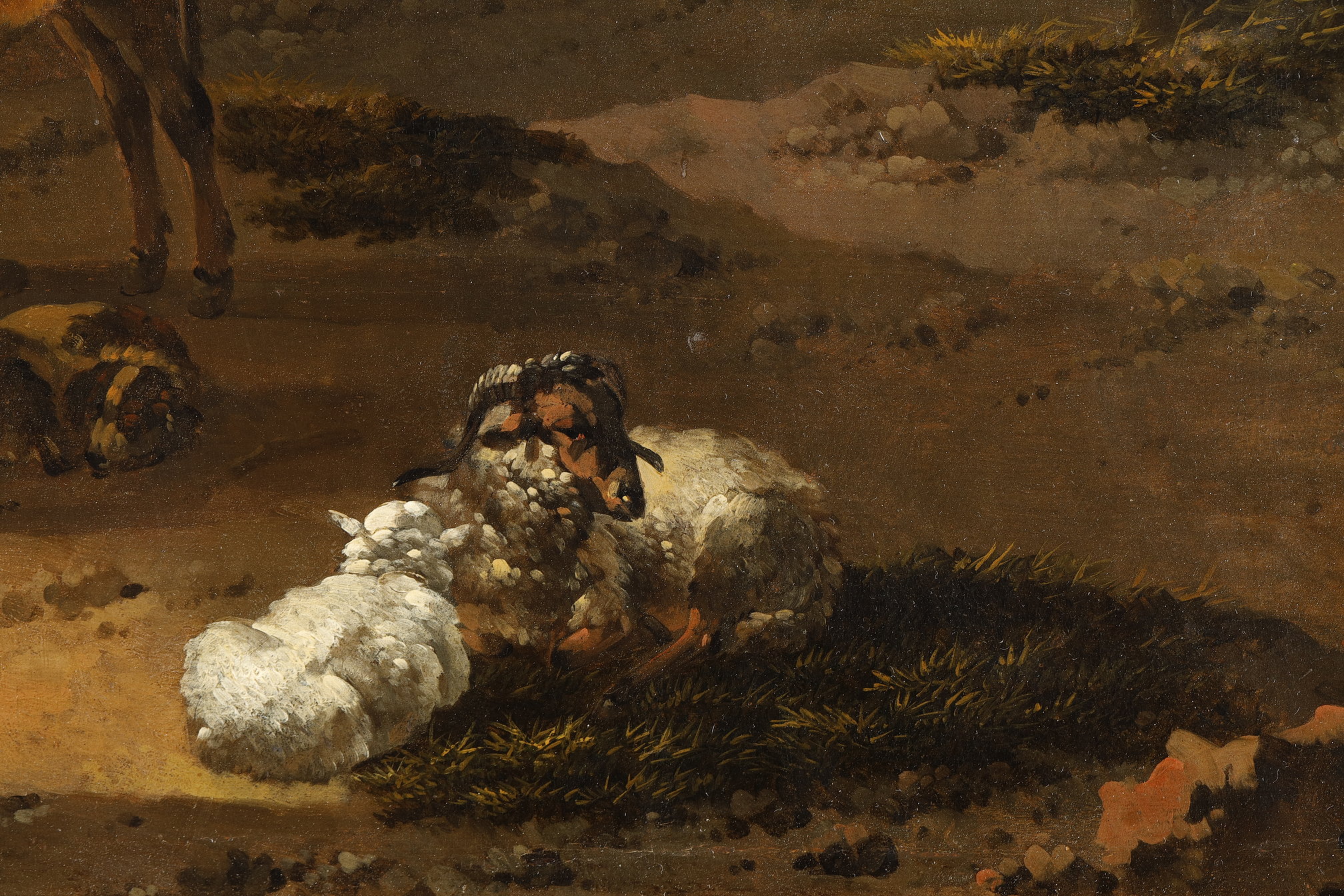 Oil on canvas by the great Flemish painter Jan Frans Soolmaker (1635 – probably around 1686) whose paintings reflect an Italianate style often depicting shepherds and flocks or like an Arcadian scene.