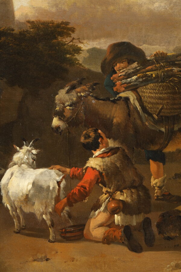 In front of him, on his knees appearing to milk a goat, a young man looks at him. To his right and hidden in its shadow, a sleeping dog contrasts its dark coat with the goat whose light illuminates its white coat.