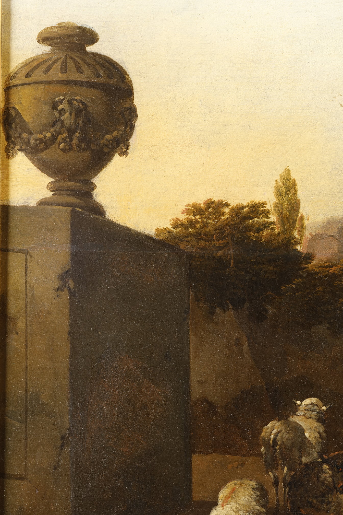 Here, the painting presents in its center two characters surrounded by several animals in a pastoral landscape from which ancient ruins stand out in the background, and in the left part of the painting.