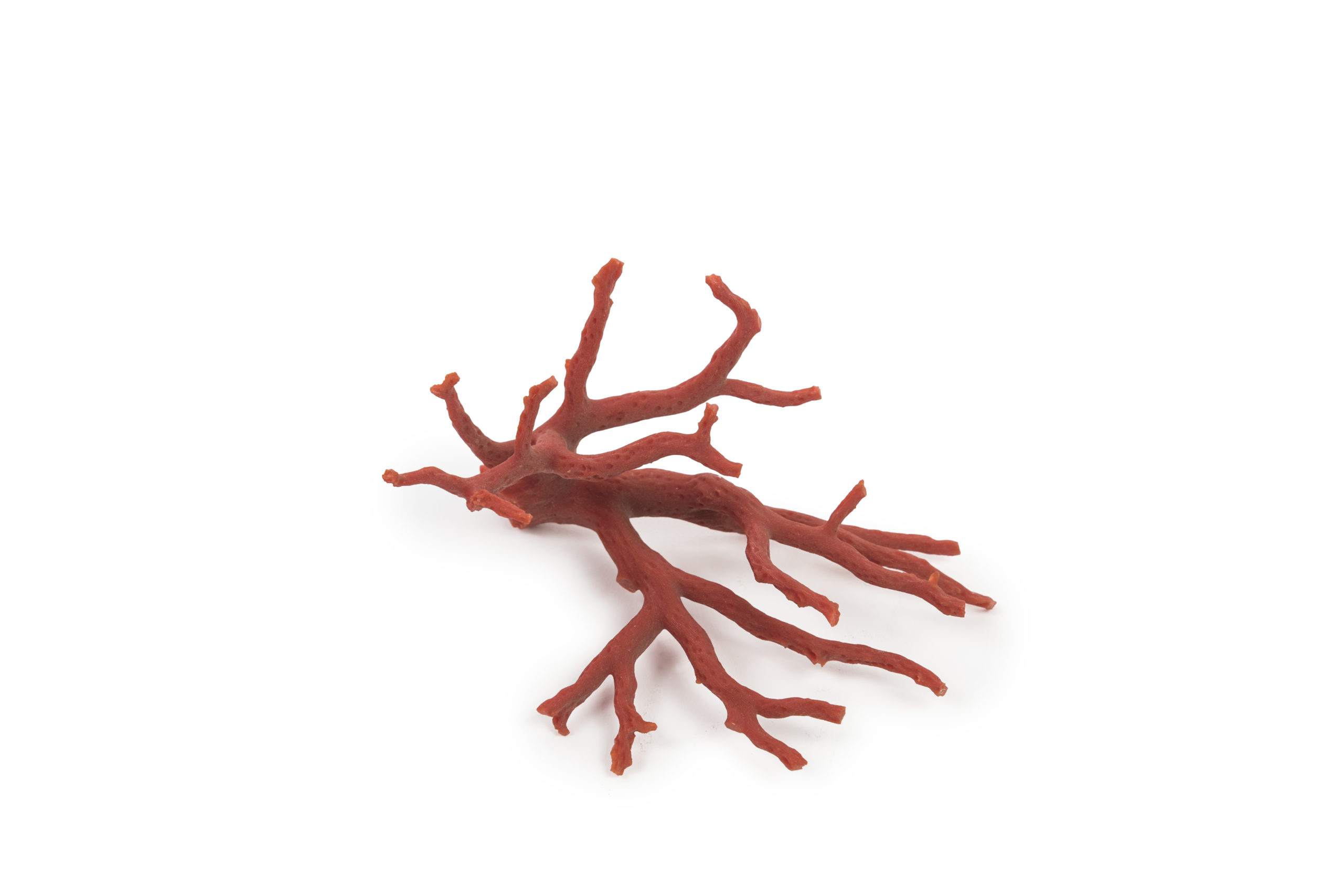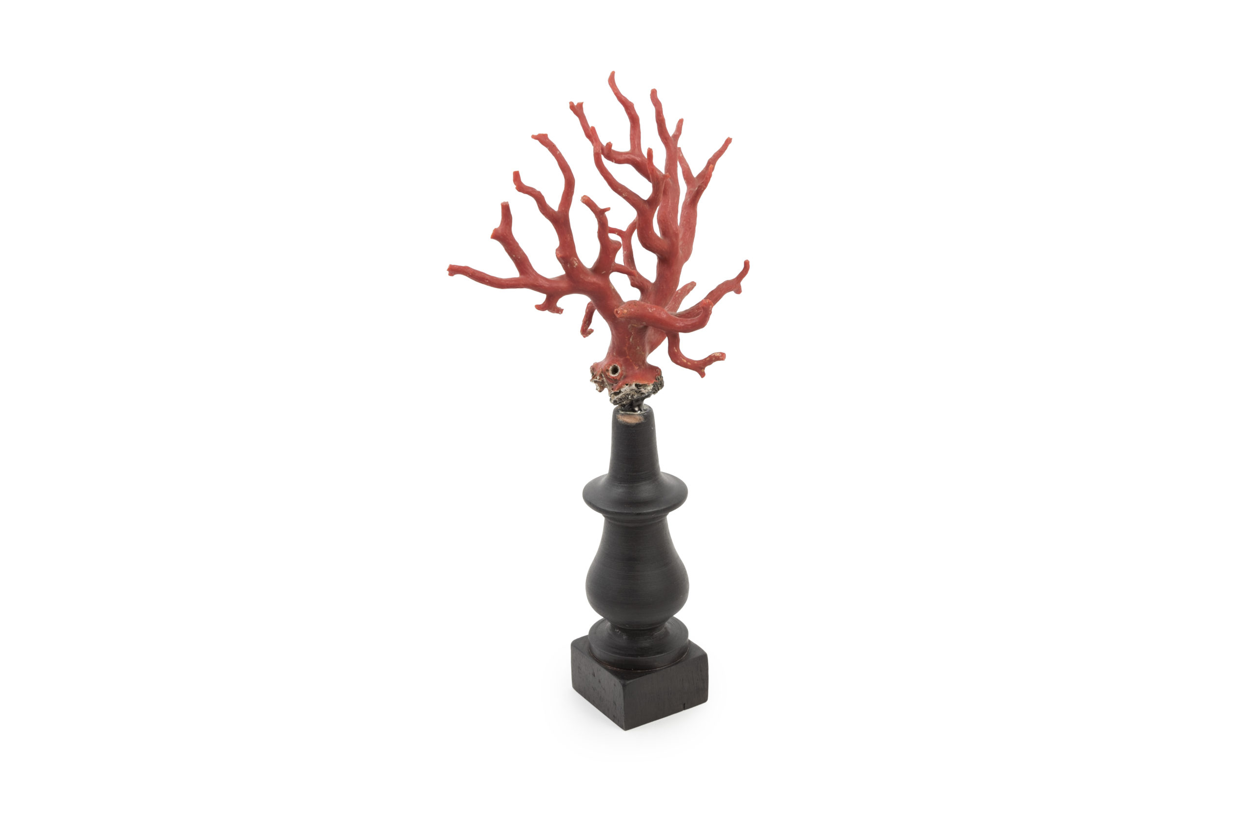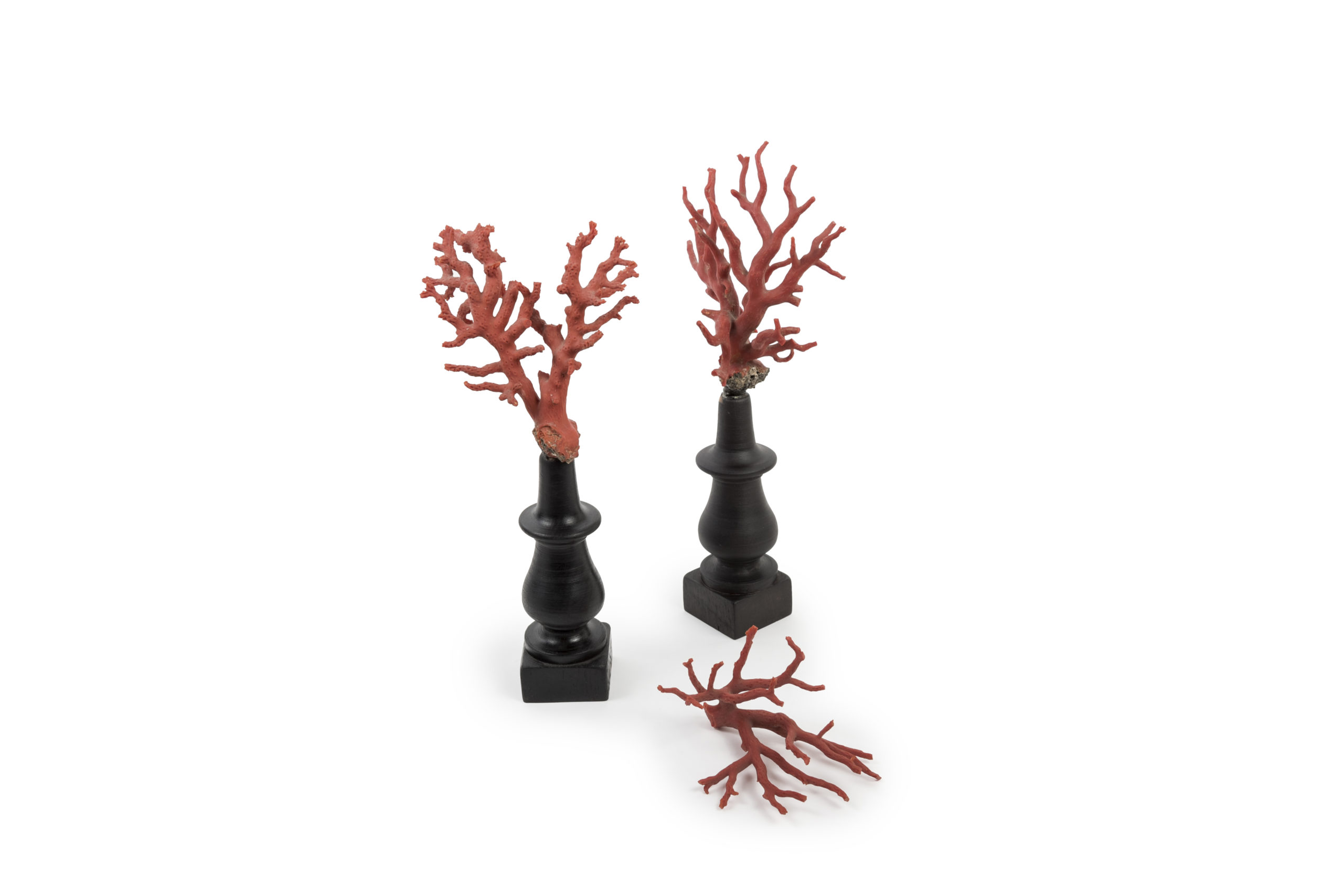 Red corals on dark varnished wooden stands.