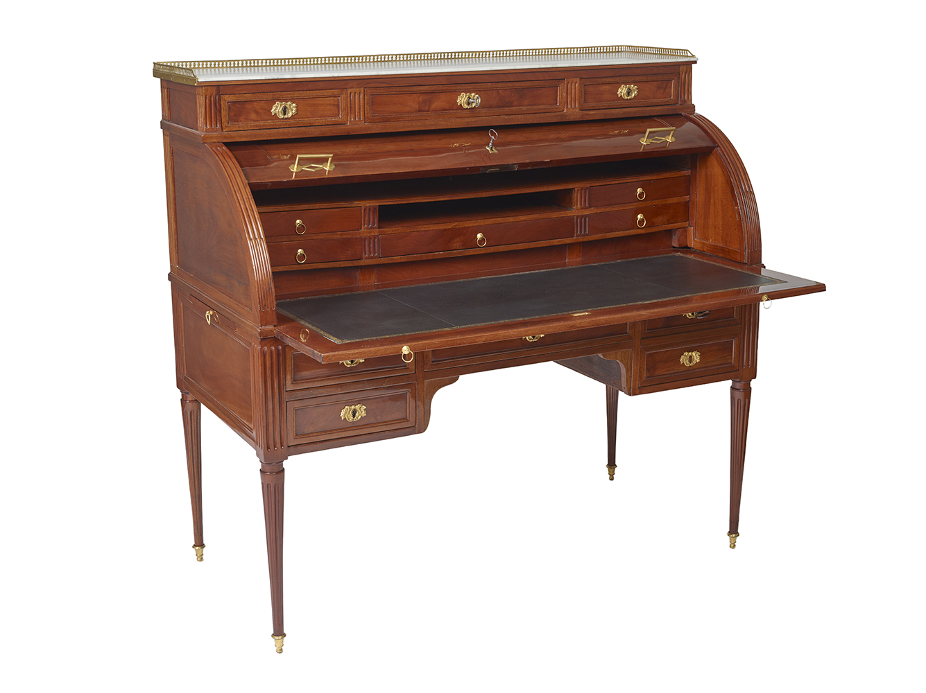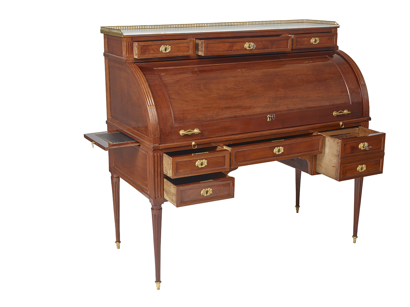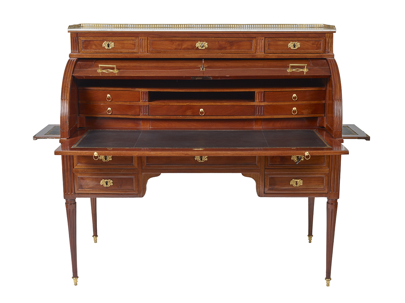 The cylinder reveals lockers and five drawers and the sliding top is covered in leather.