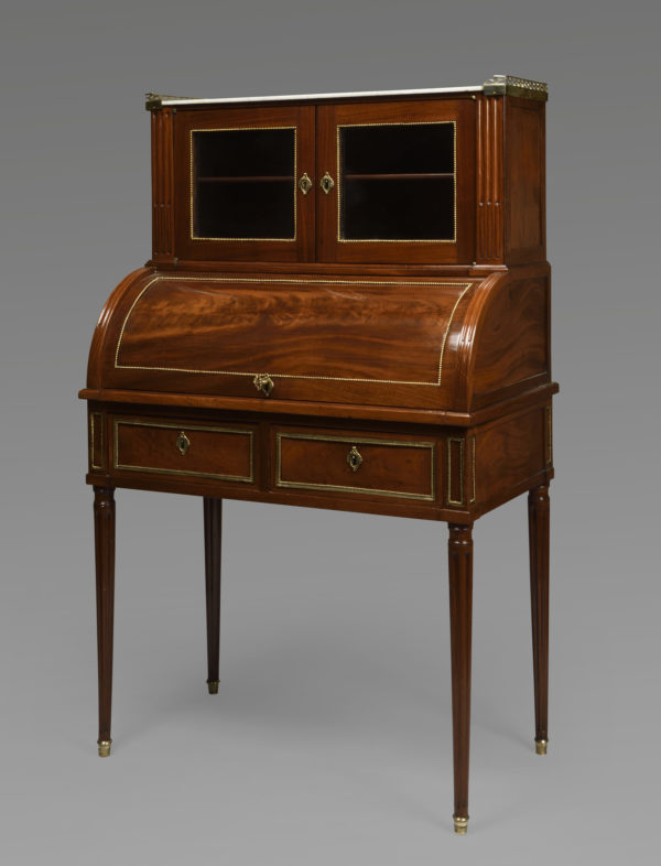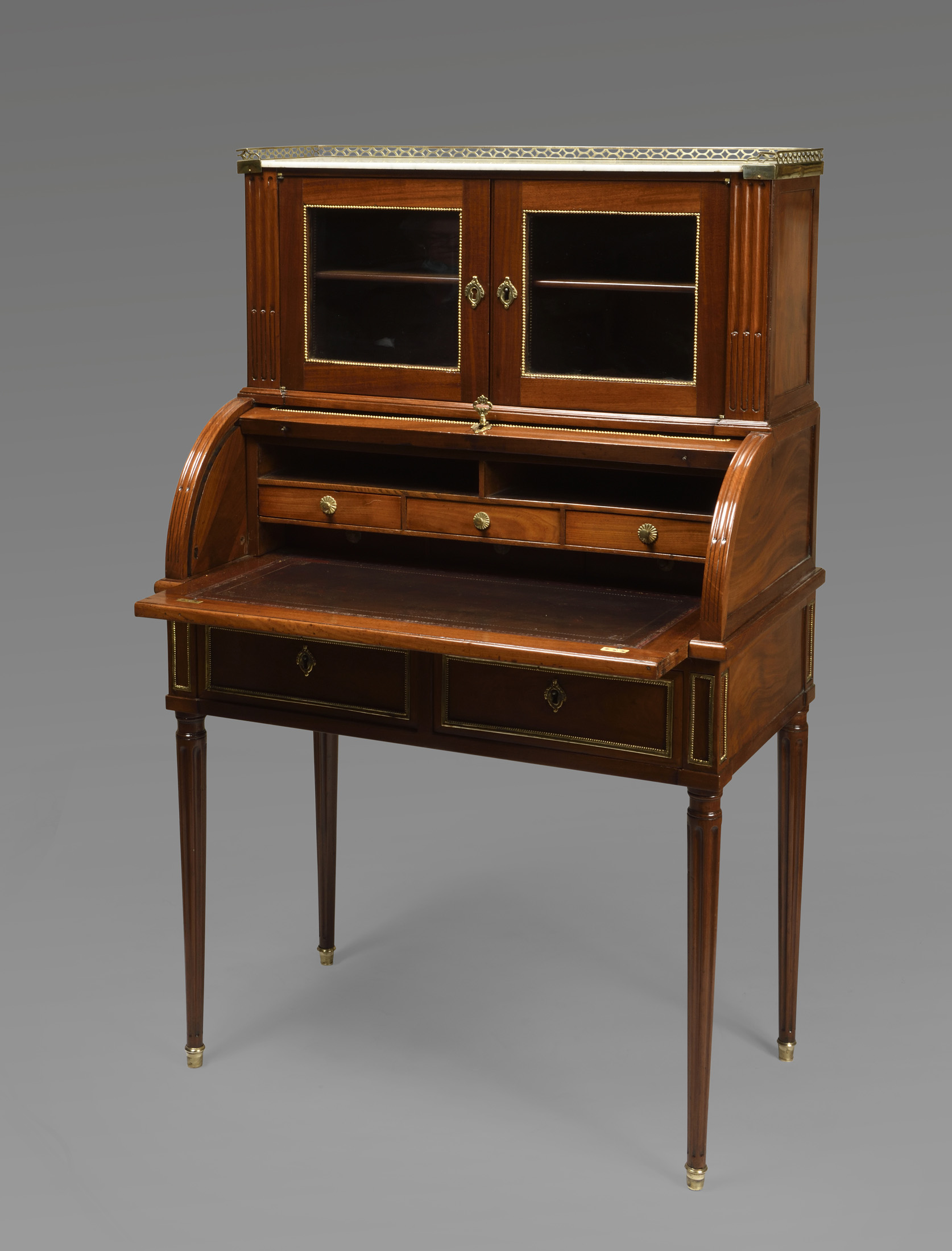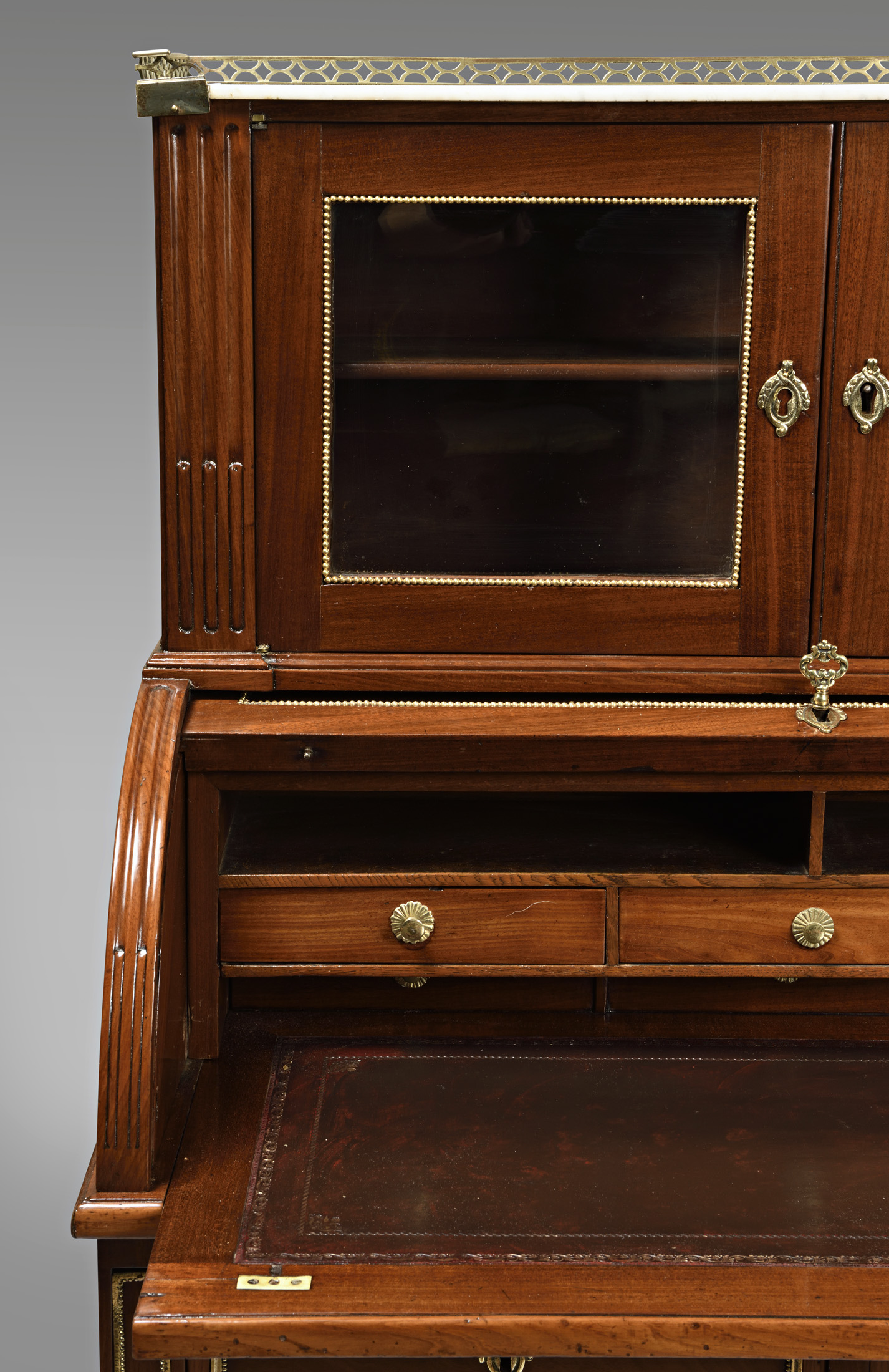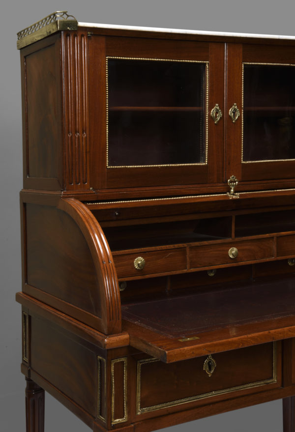 Bureau cylindre en acajou et placage d’acajou, pieds fuselés et cannelés ouvrant par deux portes vitrées dans la partie supérieure. Le cylindre découvre trois tiroirs et une tablette d’écritoire coulissante. Dans la partie inférieure, deux tiroirs en façade, ornementation de bronze et laiton, encadrement perlé, galerie ajourée.
