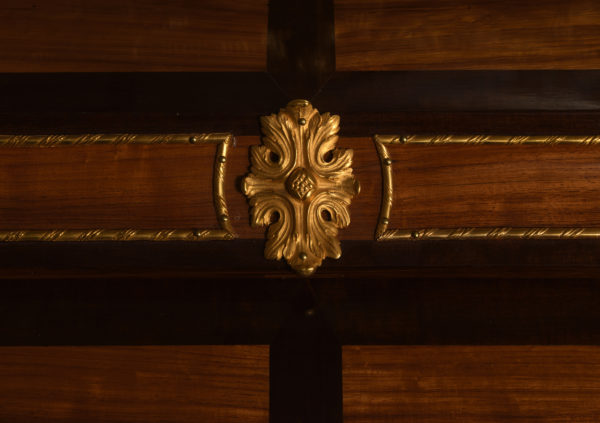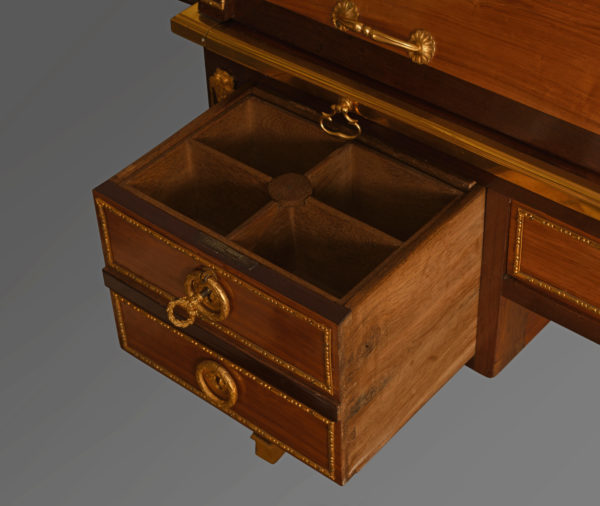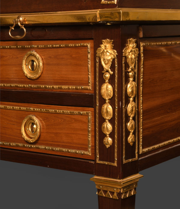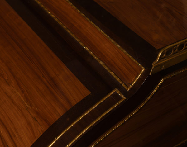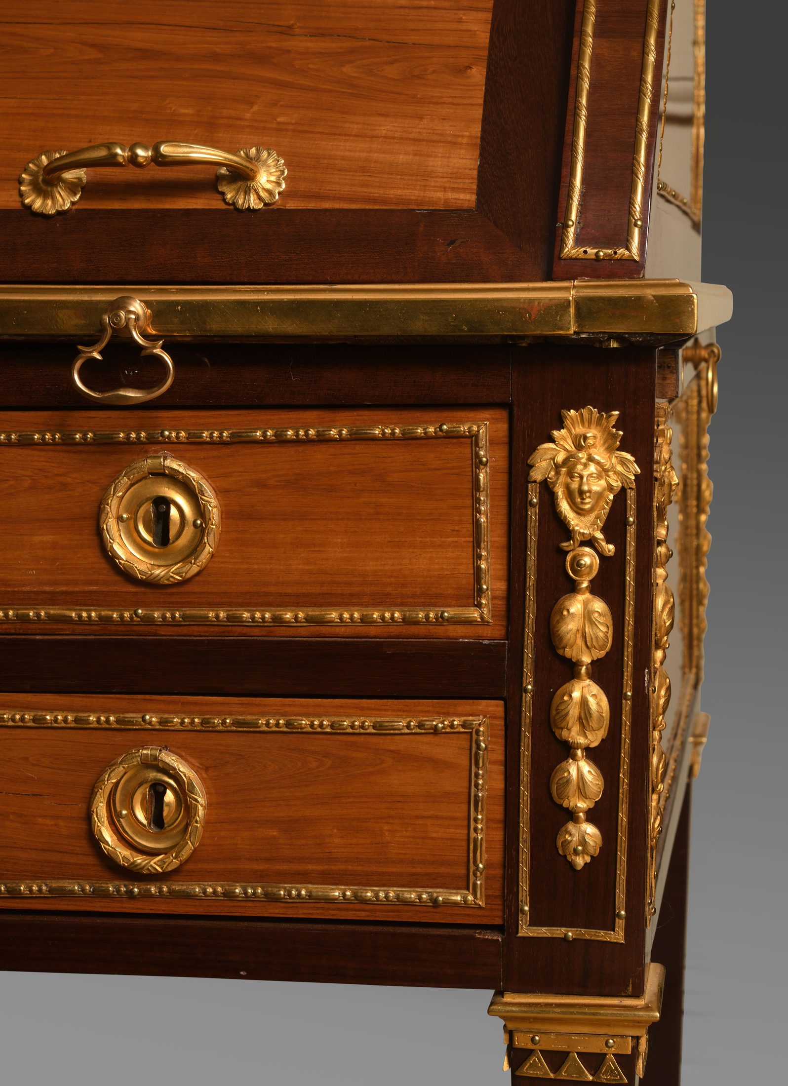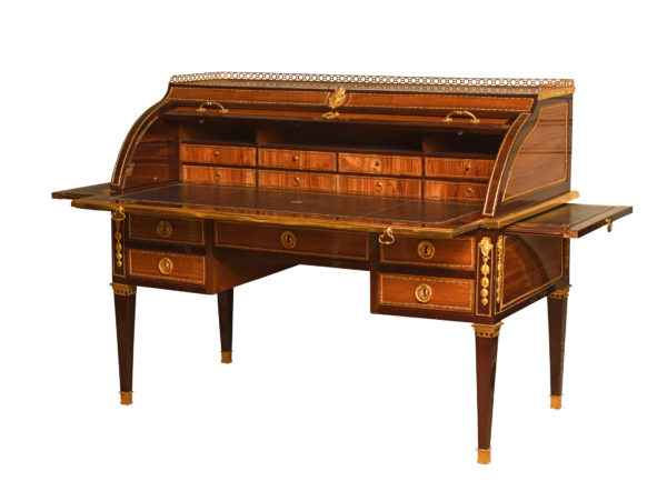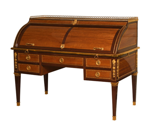 Bureau à cylindre d’époque Louis XVI, marqueté toutes faces en placage de bois de rose et satiné. Pieds gaines. Entrées de serrures, poignées, bagues et sabots en bronze doré et ciselé, surmonté d’une galerie en laiton ajourée. Il ouvre par une large tablette faisant écritoire et deux tirettes latérales recouvertes de cuir, découvrant quatre tiroirs.