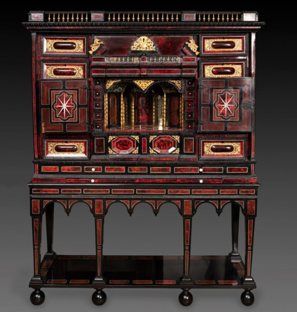 Meuble de collectionneur par excellence, ce cabinet d’apparat avait également un rôle de représentation et reflétait la richesse de son propriétaire. Installé dans les pièces de réception afin d’émerveiller les visiteurs, son contenu étant sécurisé à l’intérieur grâce aux serrures des tiroirs et les portes du milieu fermées a clés.