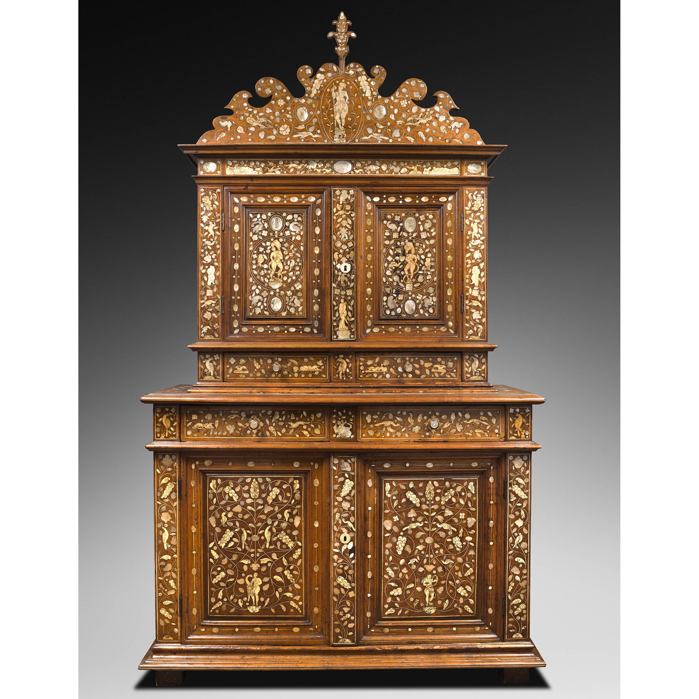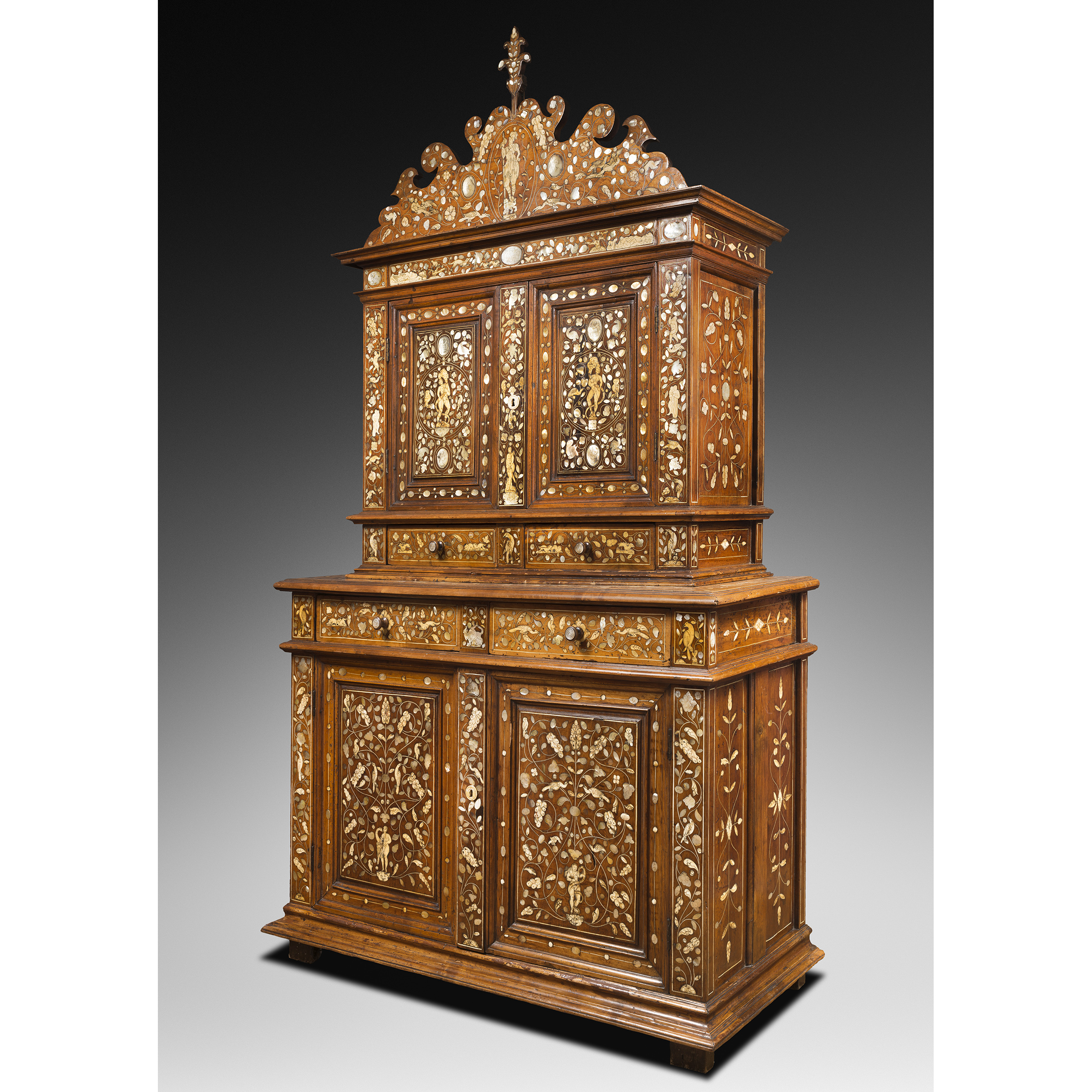Two-bodies dresser, the upper body showing a recess, and opening with four door-leaves and four drawers. The dresser is topped by a fretworked pediment with a vegetal finial. The dresser is adorned with mother-of-pearl and ivory inlays depicting arabesques, animals and allegories. The drawers’ knobs are enriched with ivory and so are the keyholes.