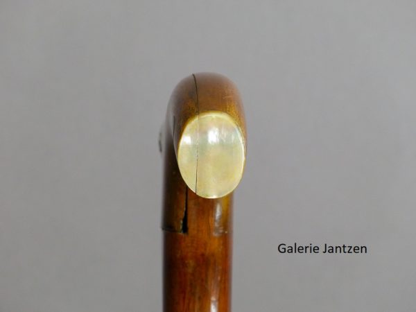 Canne à système boite à musique à lames vibrantes incorporée dans le pommeau de forme Opéra en bois dont les deux extrémités sont décorées par une plaquette en nacre. La férule en ivoire se démonte en la tirant. Elle renferme une tige qui permet de remonter le mécanisme de la boite à musique. La tige doit être délicatement vissée dans le petit trou situé au milieu du pommeau. Une fois mise en place, la tige est tournée plusieurs fois dans le sens des aiguilles d’une montre jusqu’au blocage pour remonter le mécanisme de la boite à musique. Pour lancer la musique, un bouton poussoir a été placé au-dessous du pommeau.
