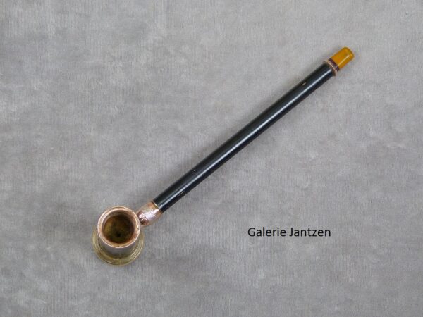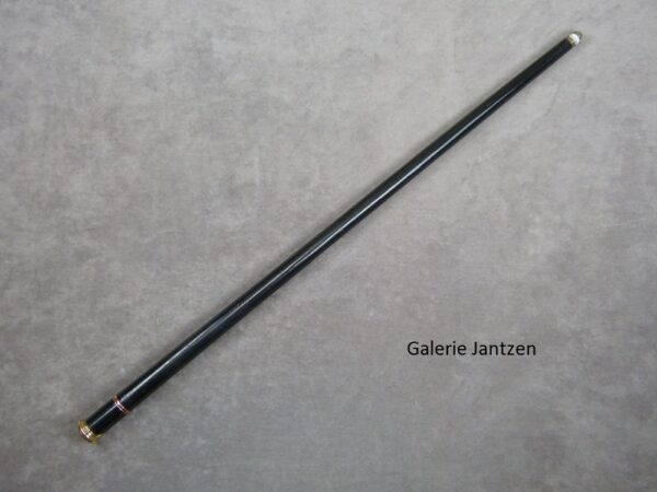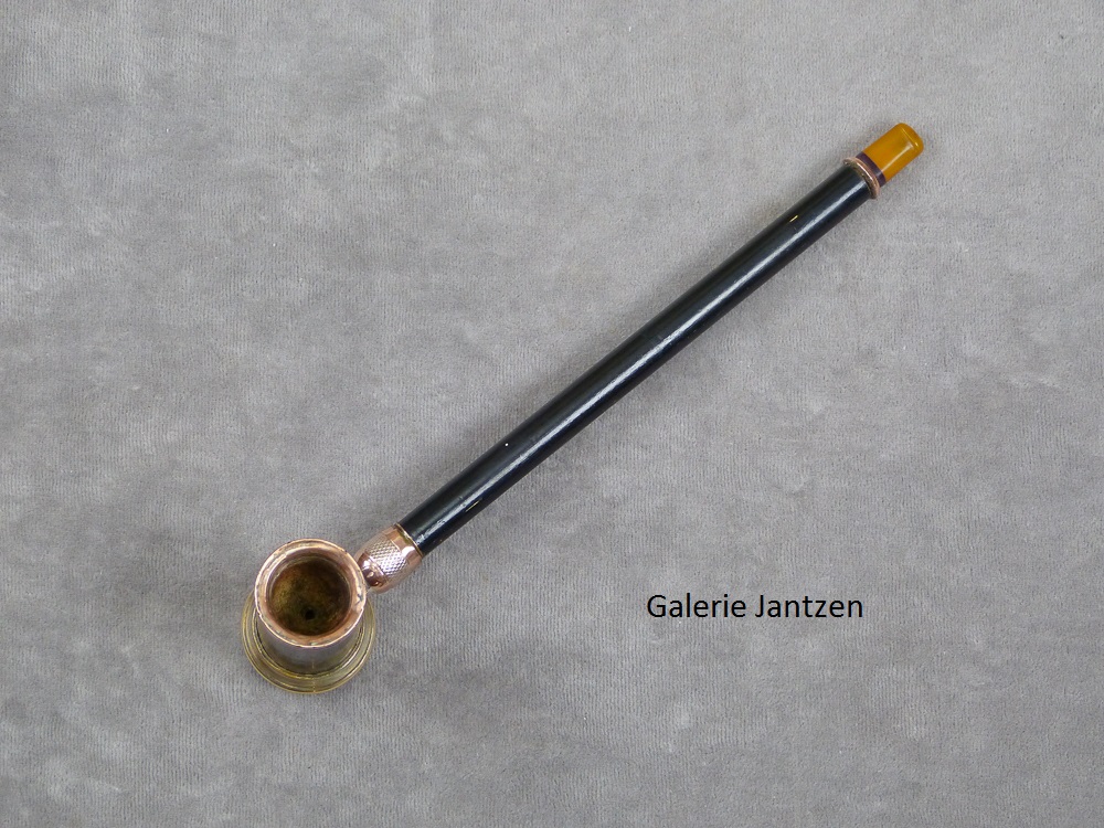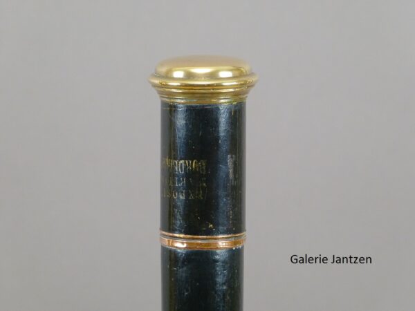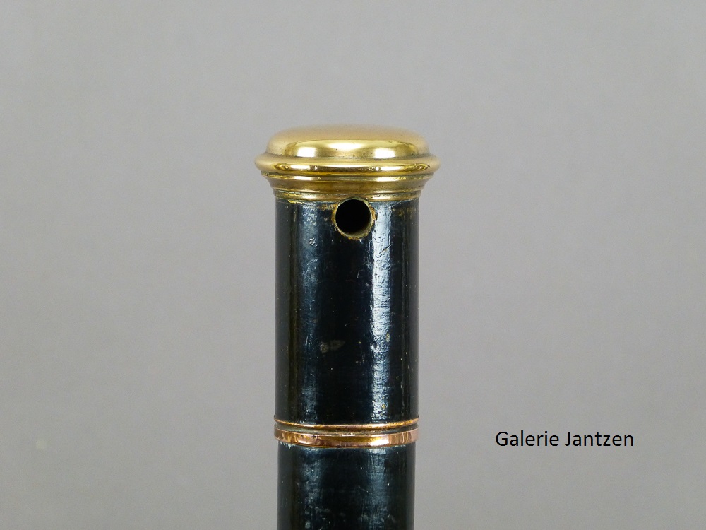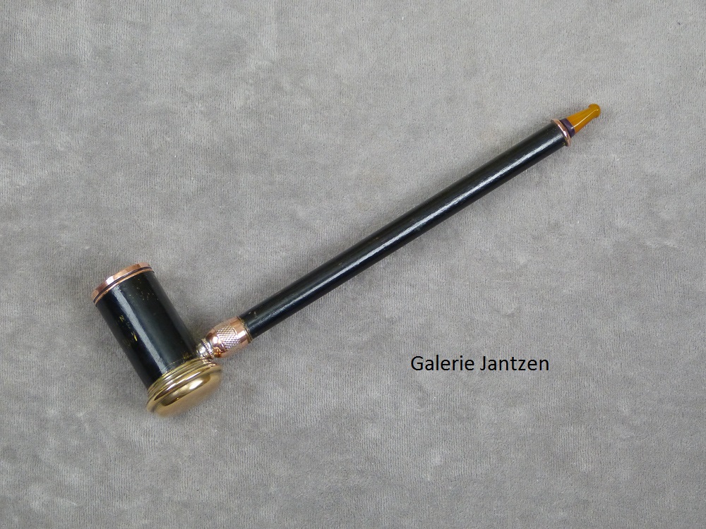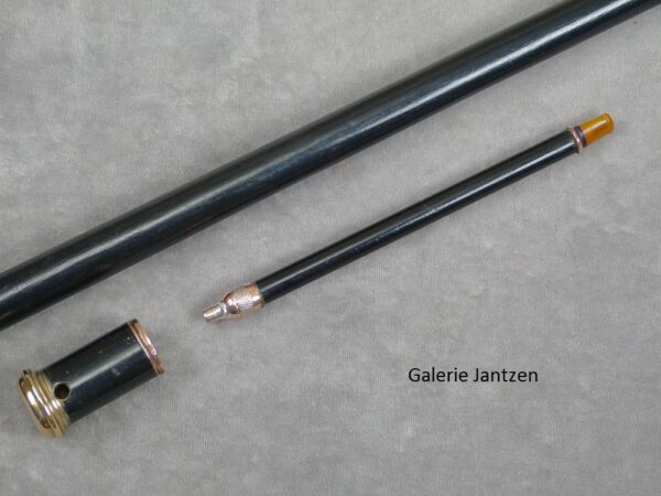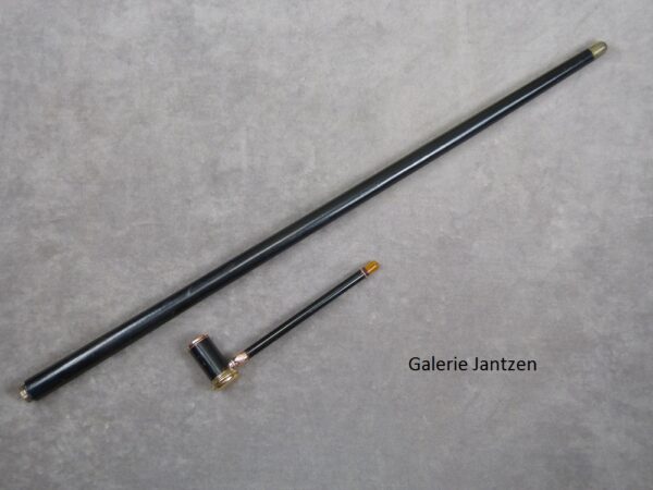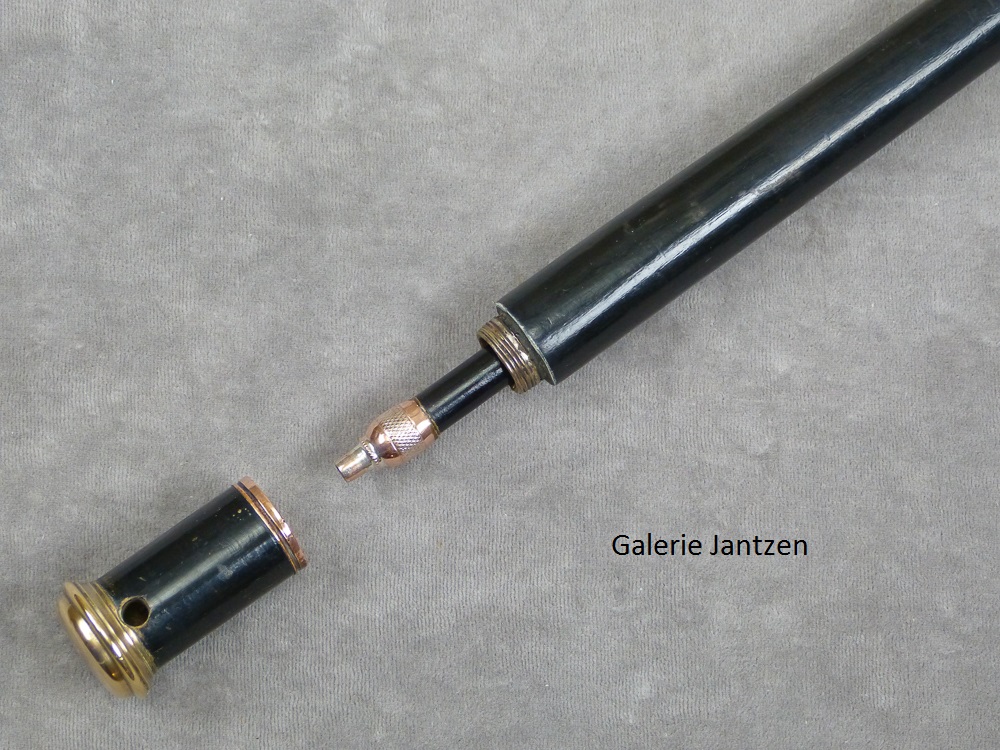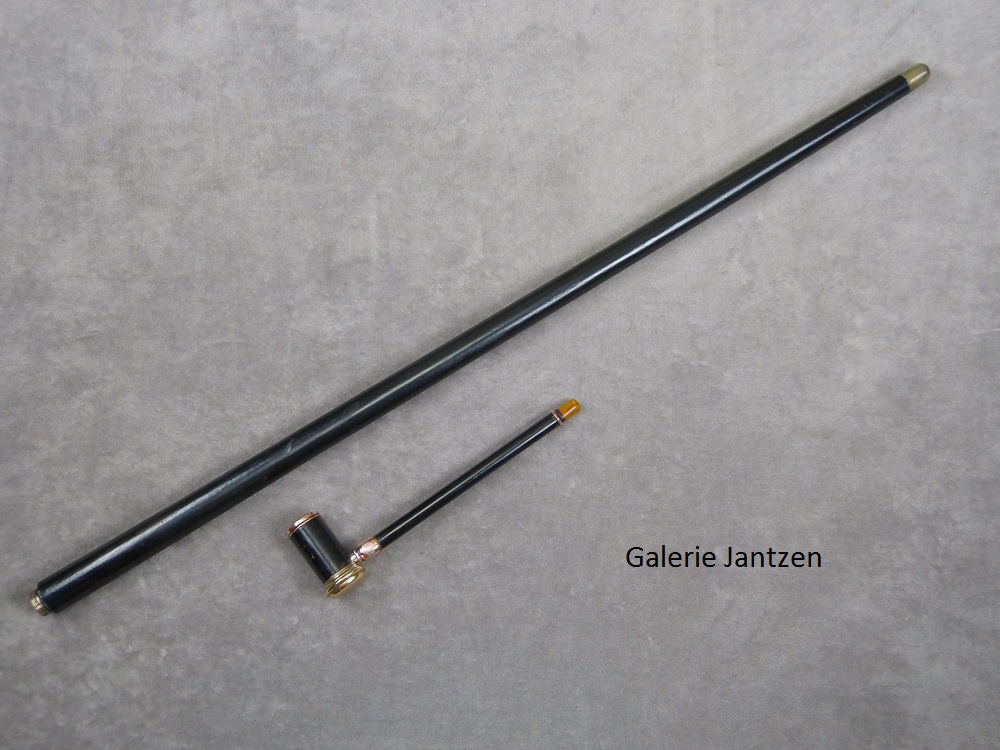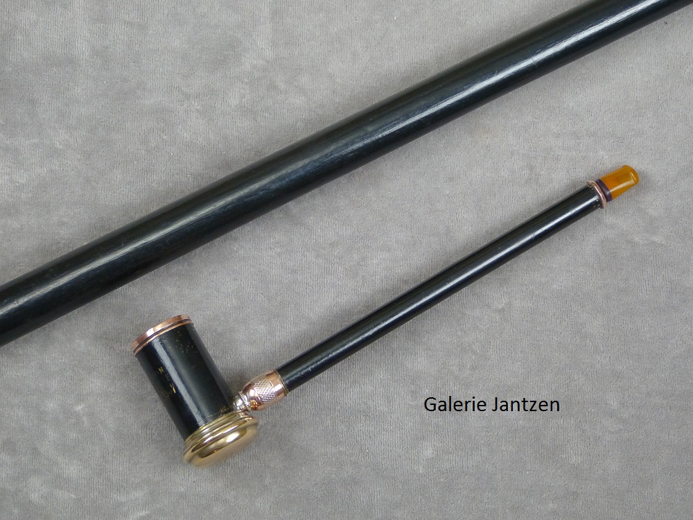 L’intérieur du fût de la canne contient un embout dont la partie en métal vient se fixer dans un trou situé sur le haut du pommeau en bois une fois dévissé. L’ensemble ainsi assemblé forme une pipe.