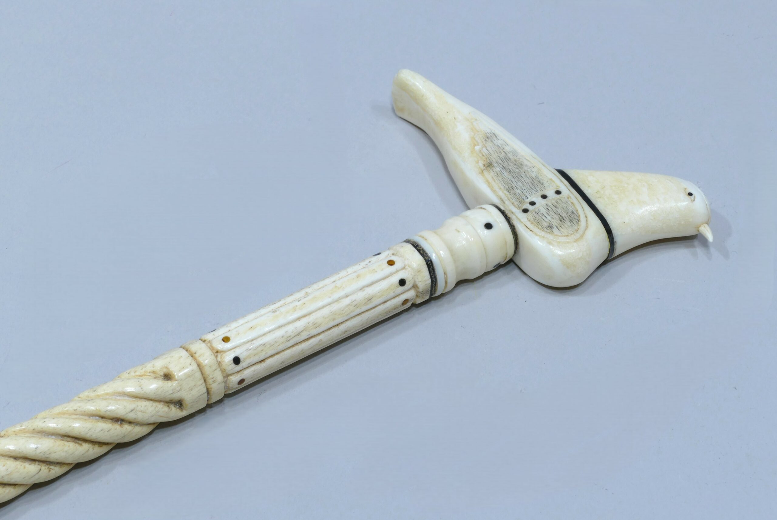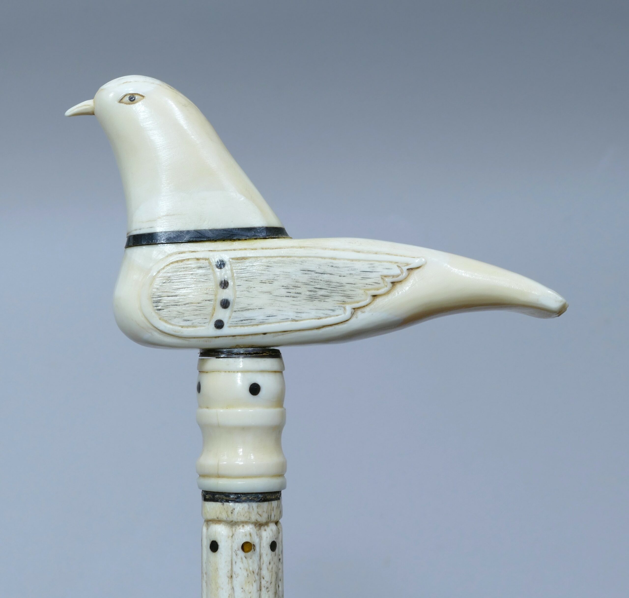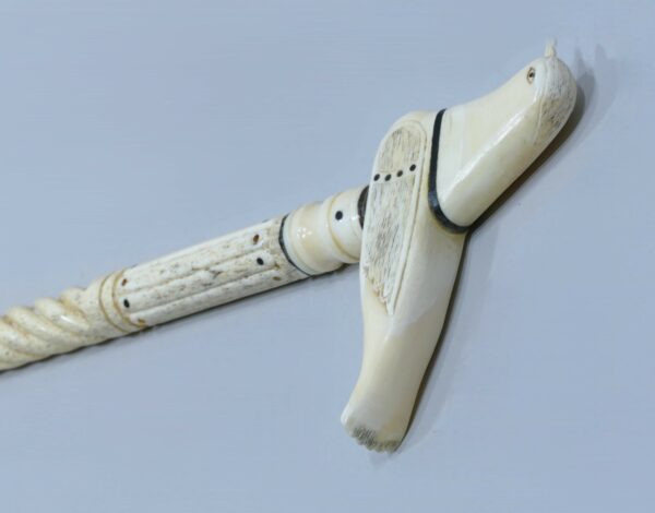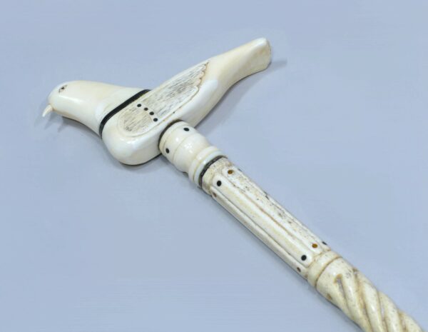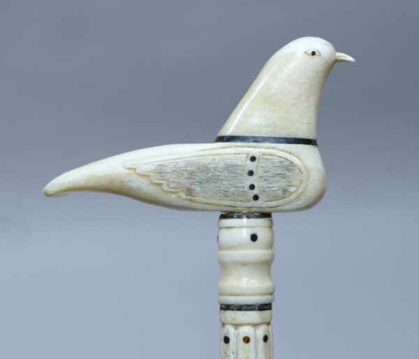 Canne de baleinier avec pommeau en dent de morse et fanon de baleine représentant un oiseau ailé.