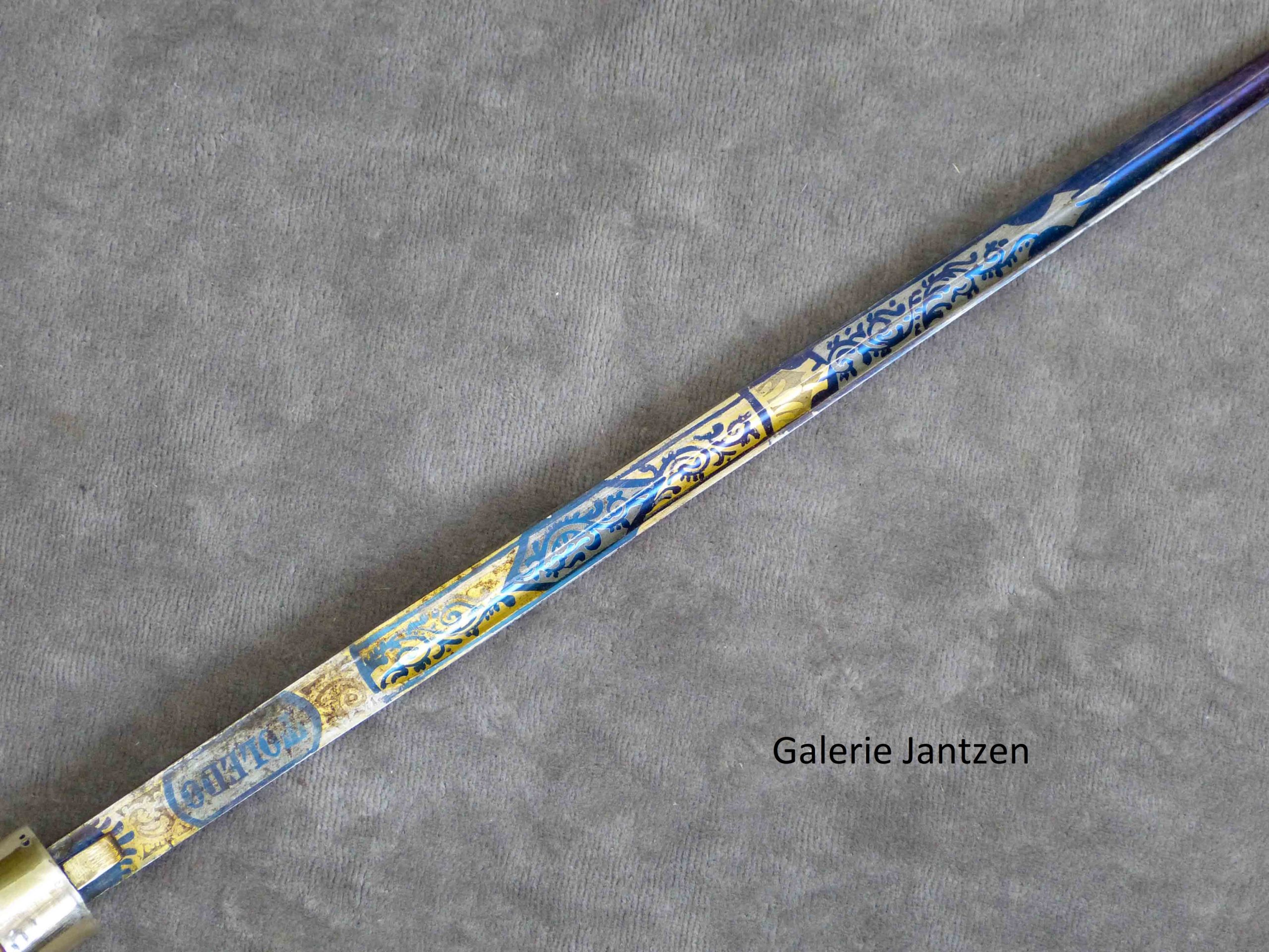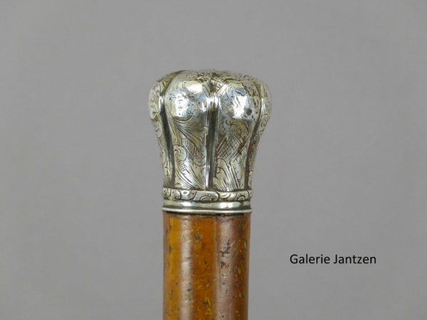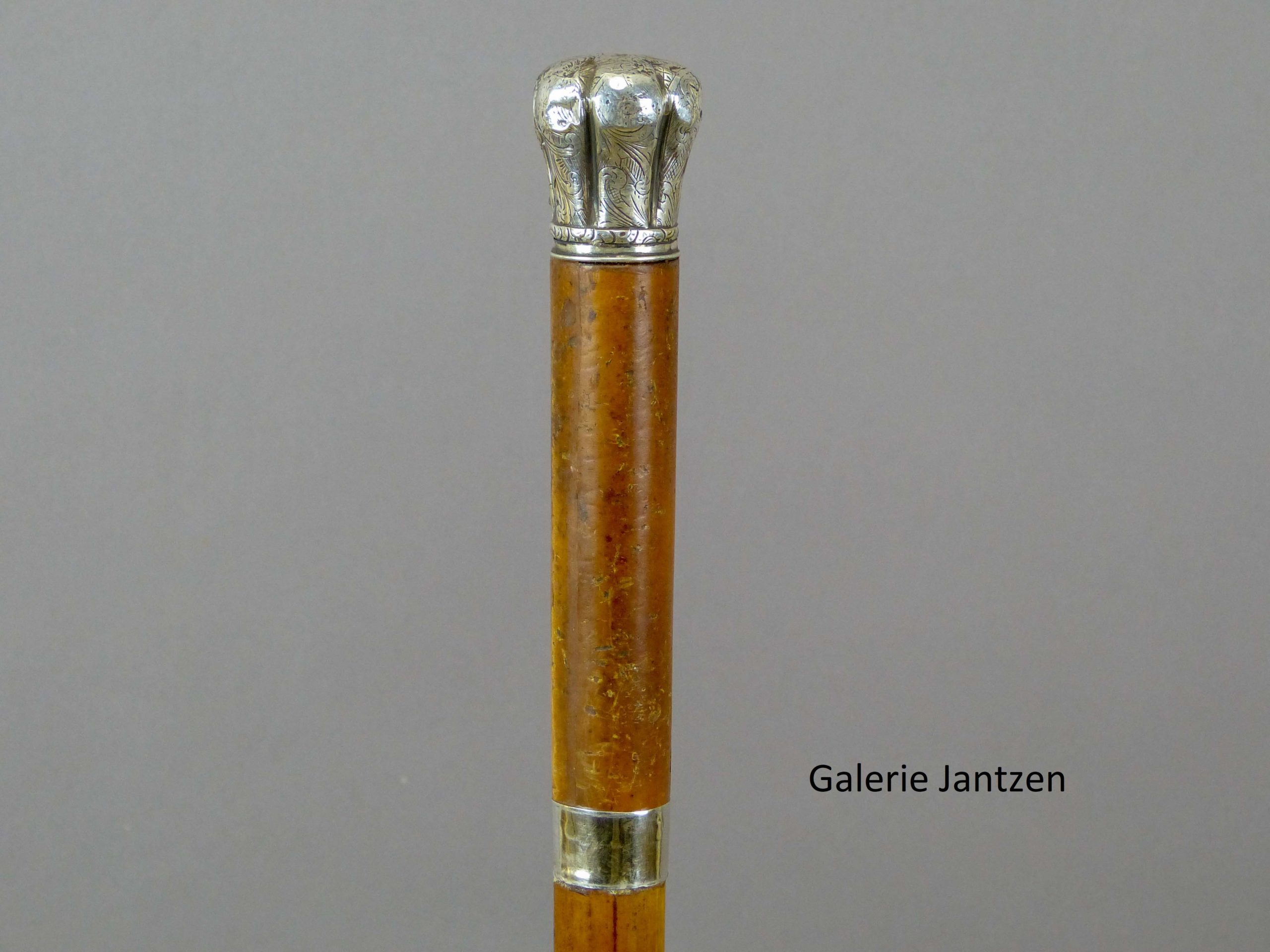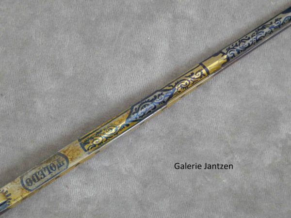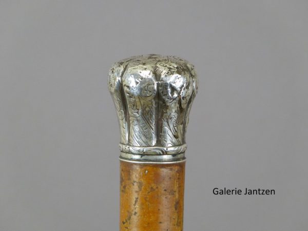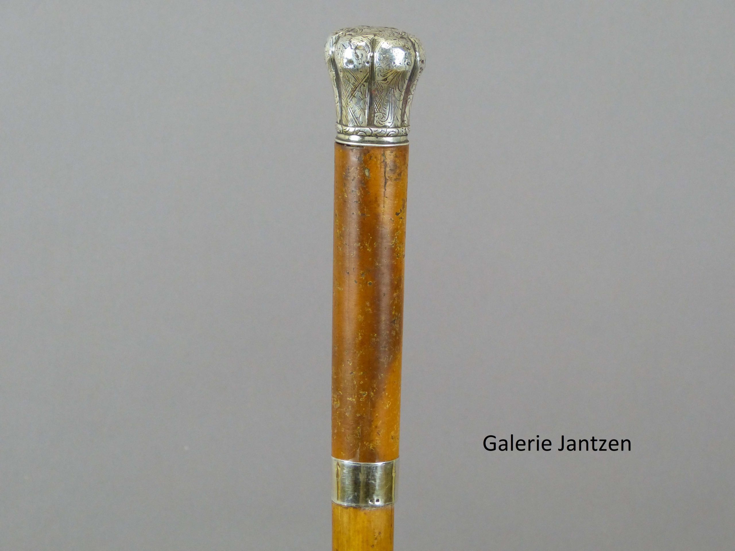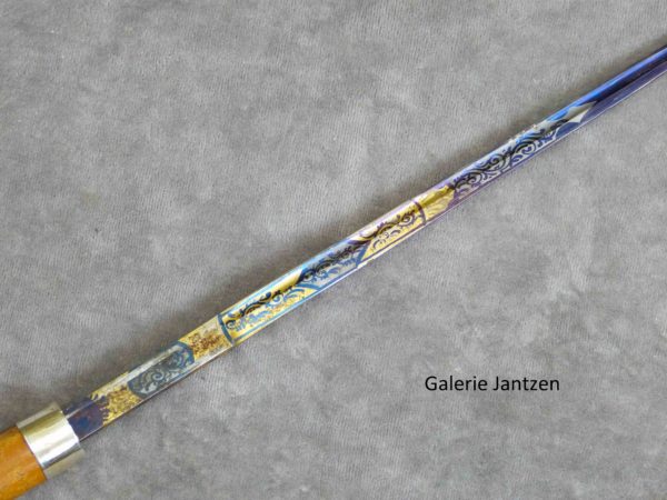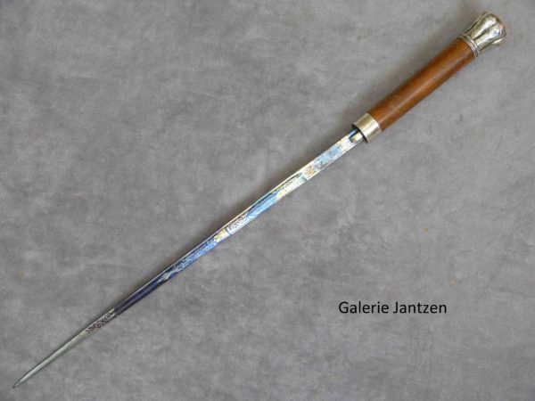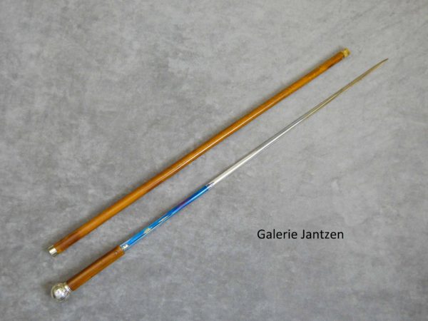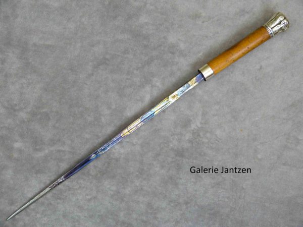 Canne à système de défense qui s’ouvre par système de verrouillage à quart de tour, au niveau de la bague en métal, pour libérer une lame plate signée « TOLEDO ». La lame est bleui dorée sur les 4 cotés et décorée sur le plat de motifs de frises et d’arabesques, dans un état de très bonne conservation des couleurs et des motifs. La poignée est de forme Milord en argent ciselé de volutes.