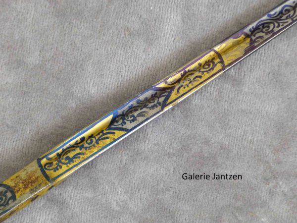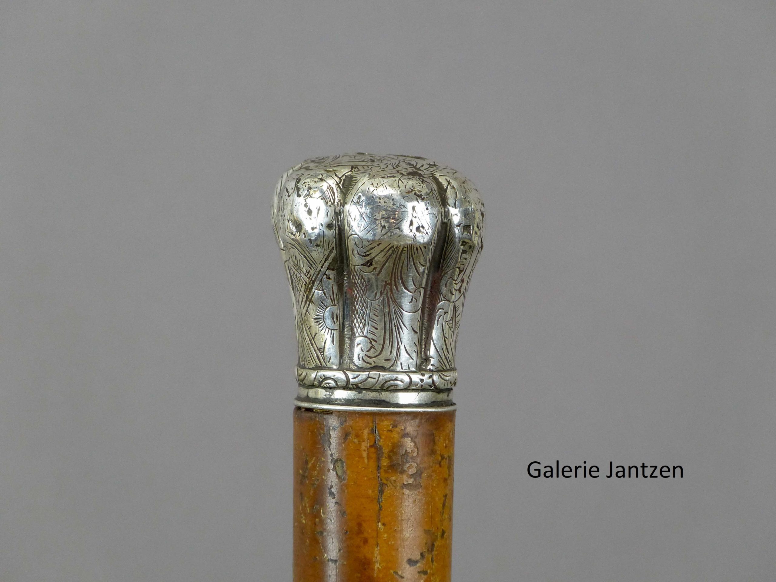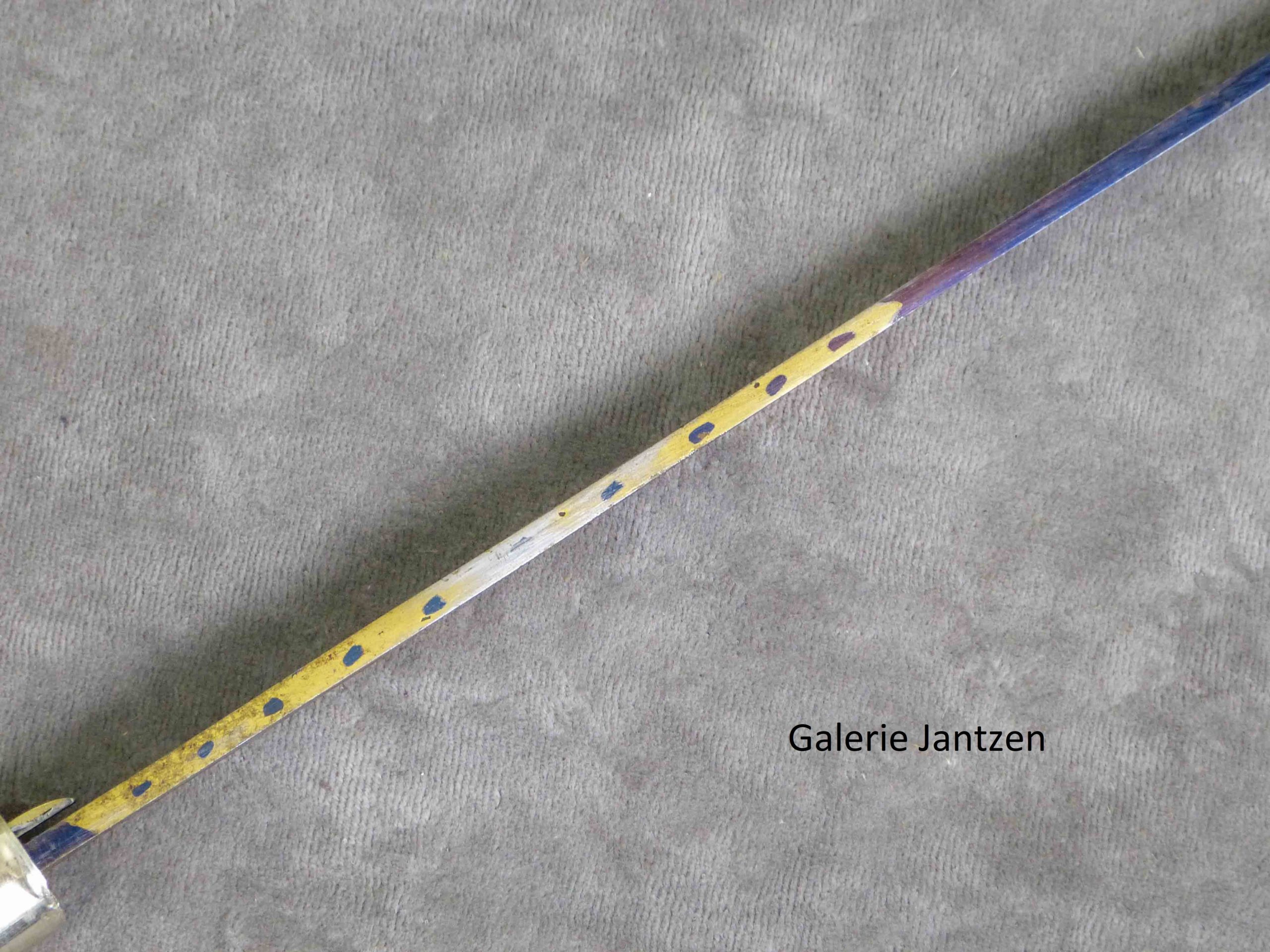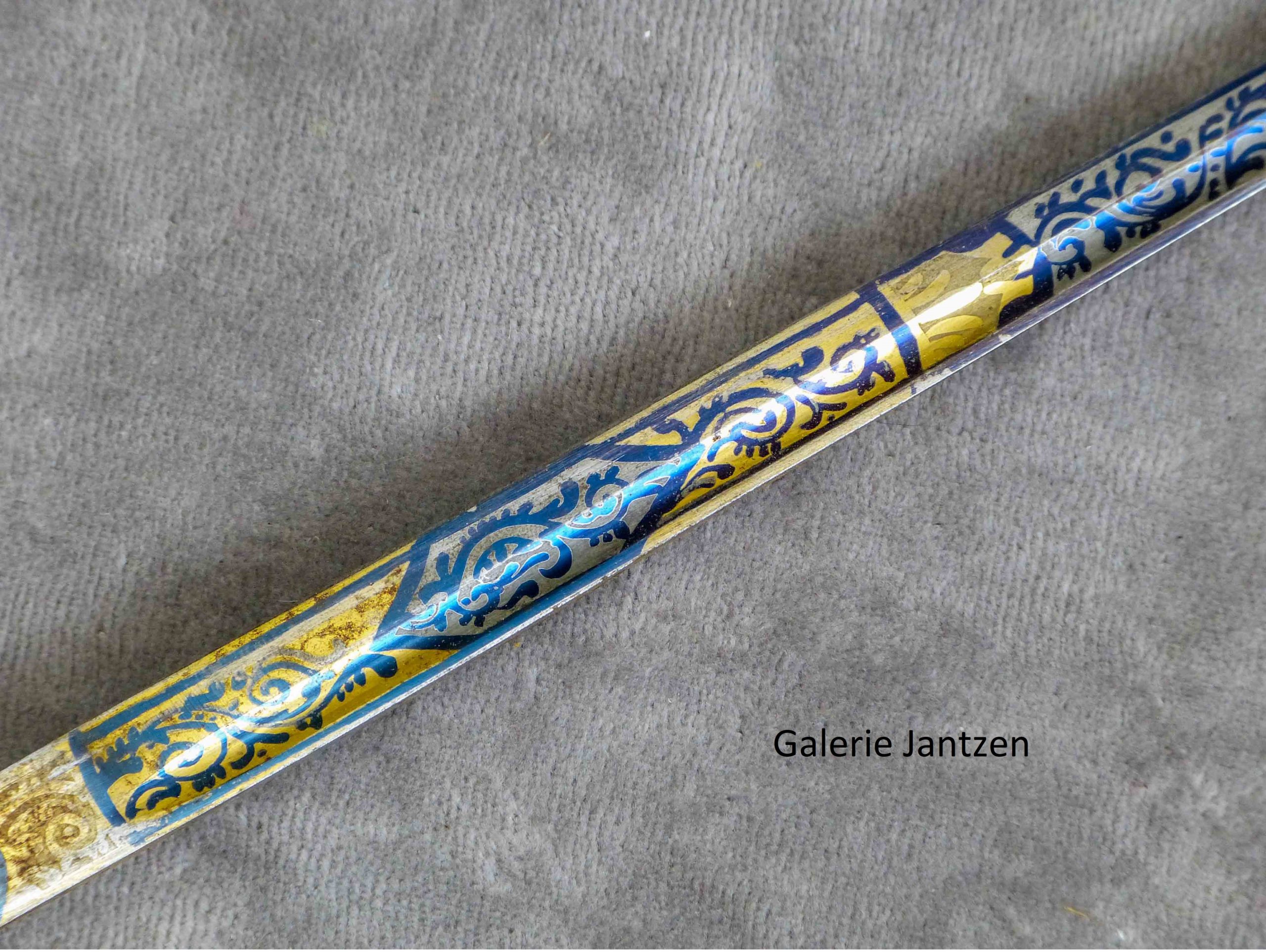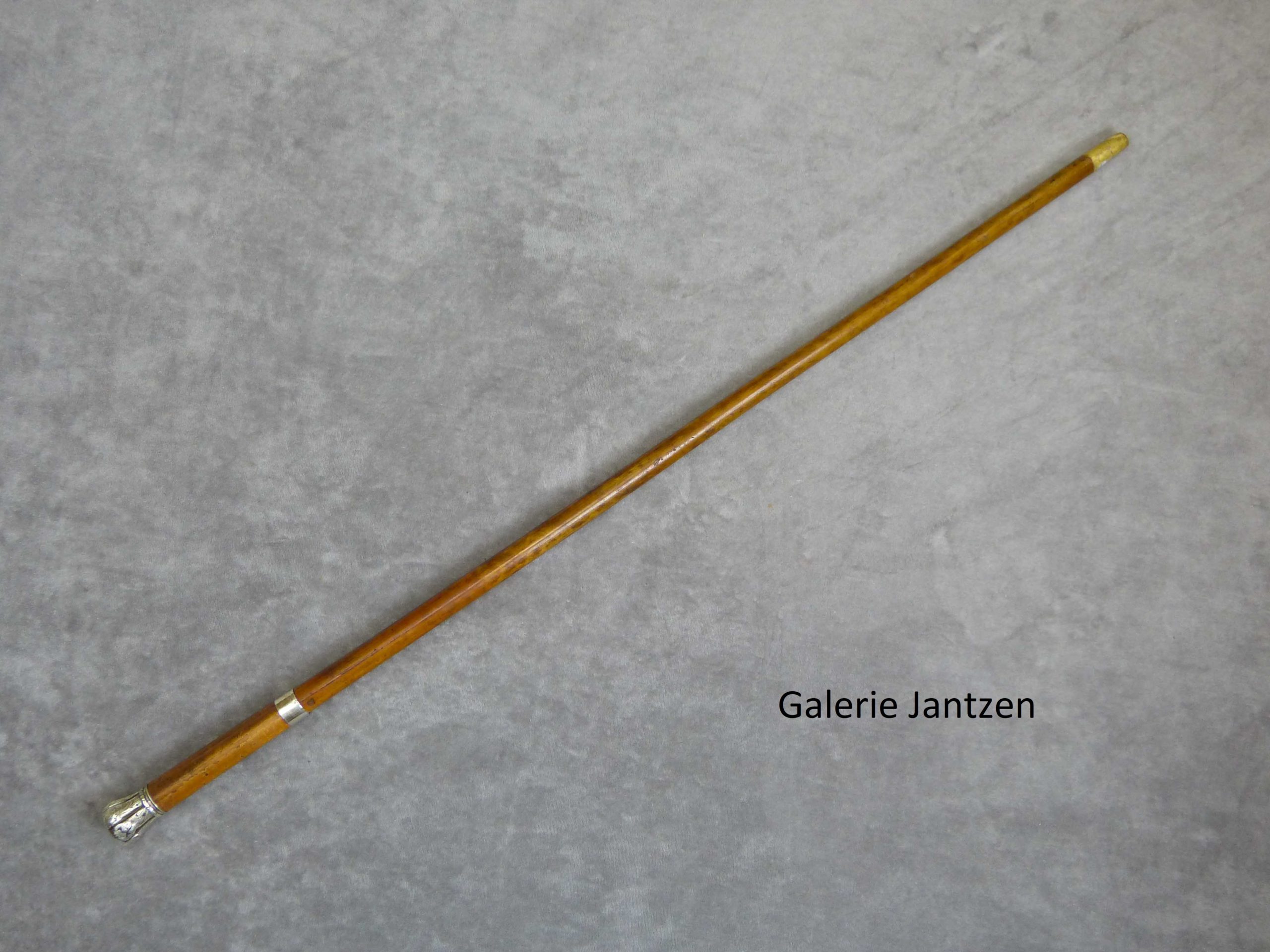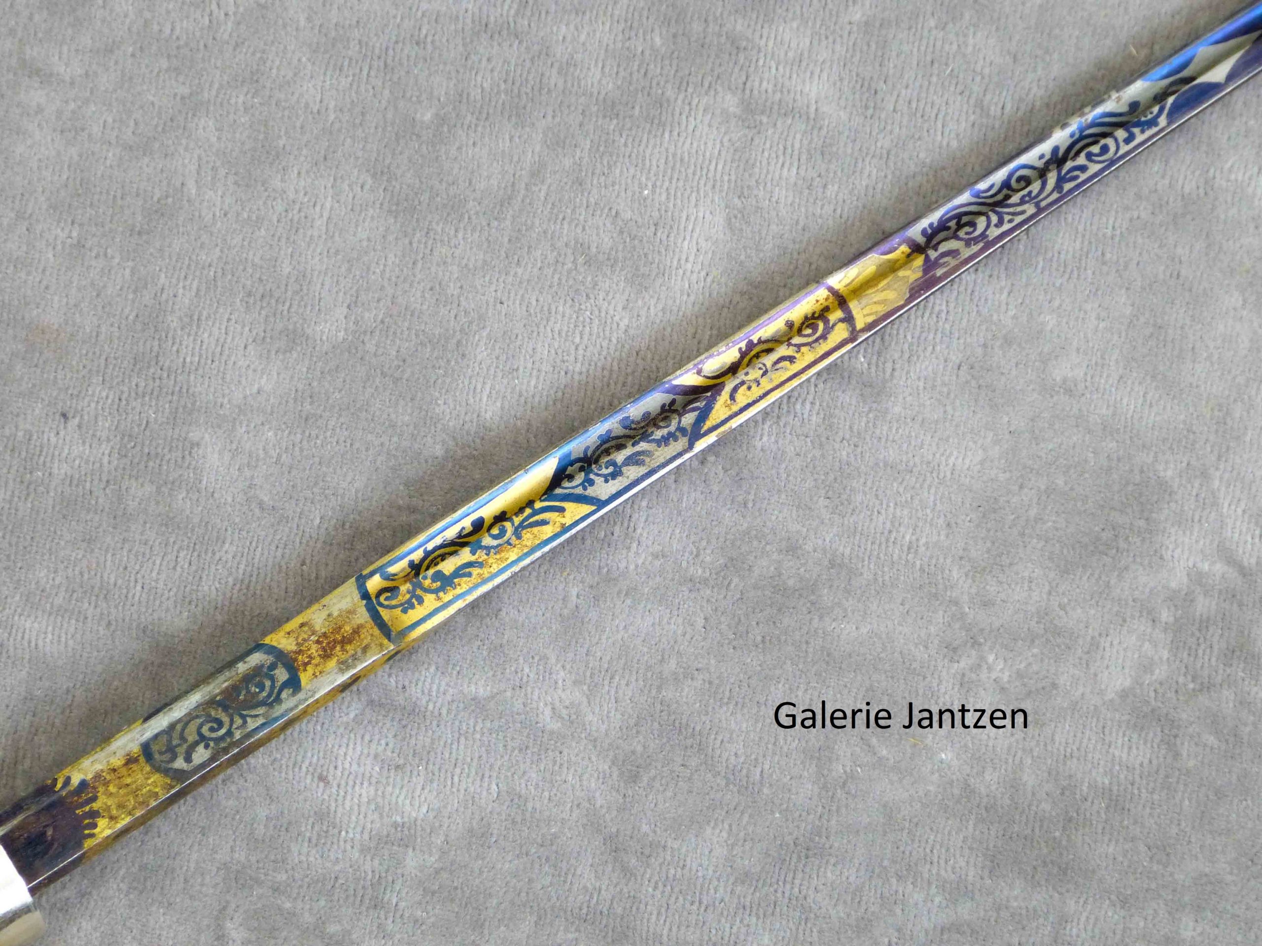 Canne à système de défense qui s’ouvre par système de verrouillage à quart de tour, au niveau de la bague en métal, pour libérer une lame plate signée « TOLEDO ». La lame est bleui dorée sur les 4 cotés et décorée sur le plat de motifs de frises et d’arabesques, dans un état de très bonne conservation des couleurs et des motifs. La poignée est de forme Milord en argent ciselé de volutes.