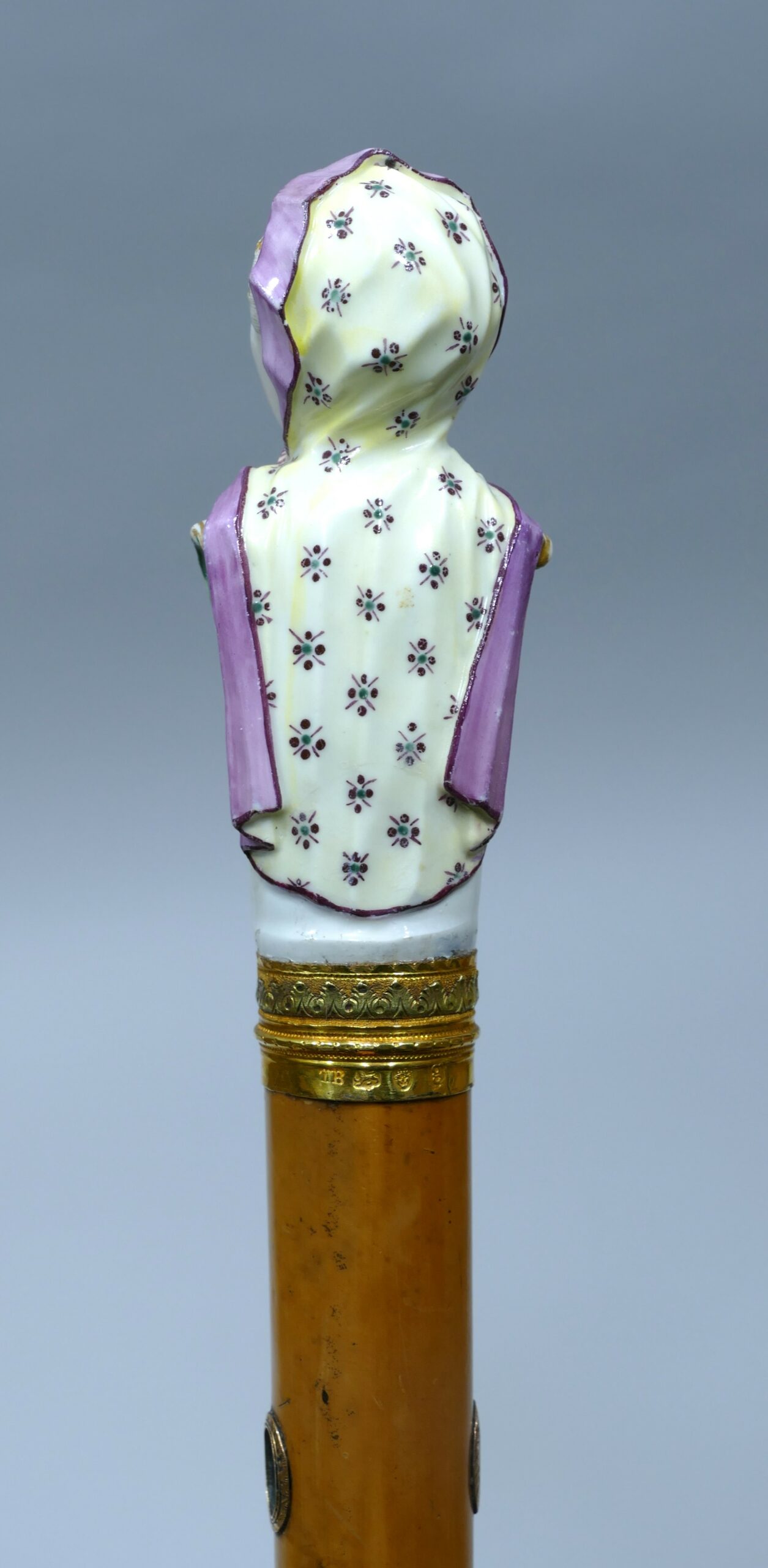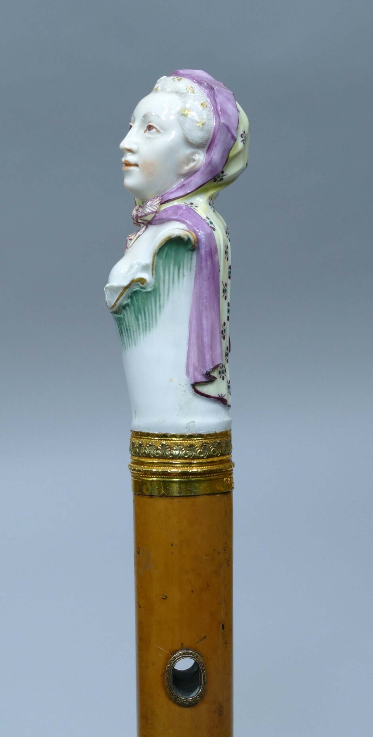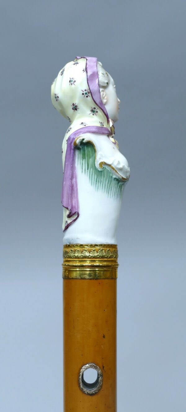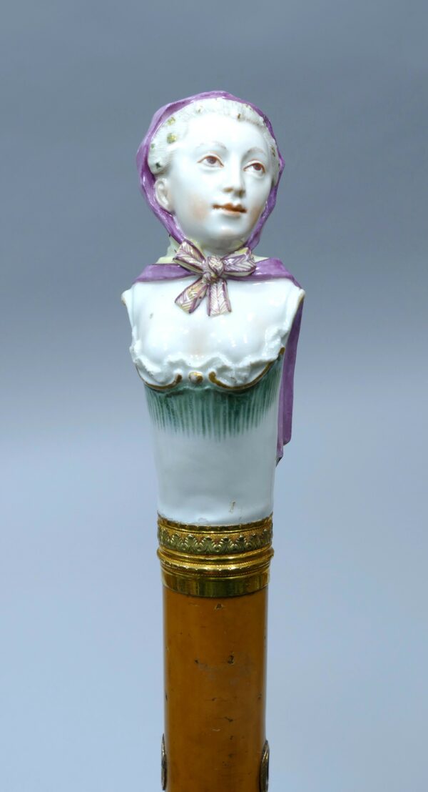 Exceptionnelle canne de collection en porcelaine polychrome de la manufacture de Ludwigsburg représentant une femme en buste.