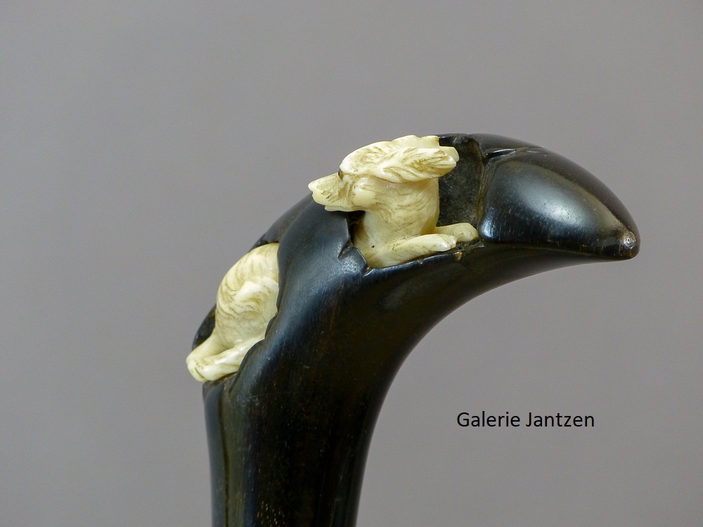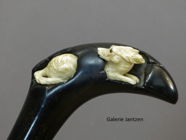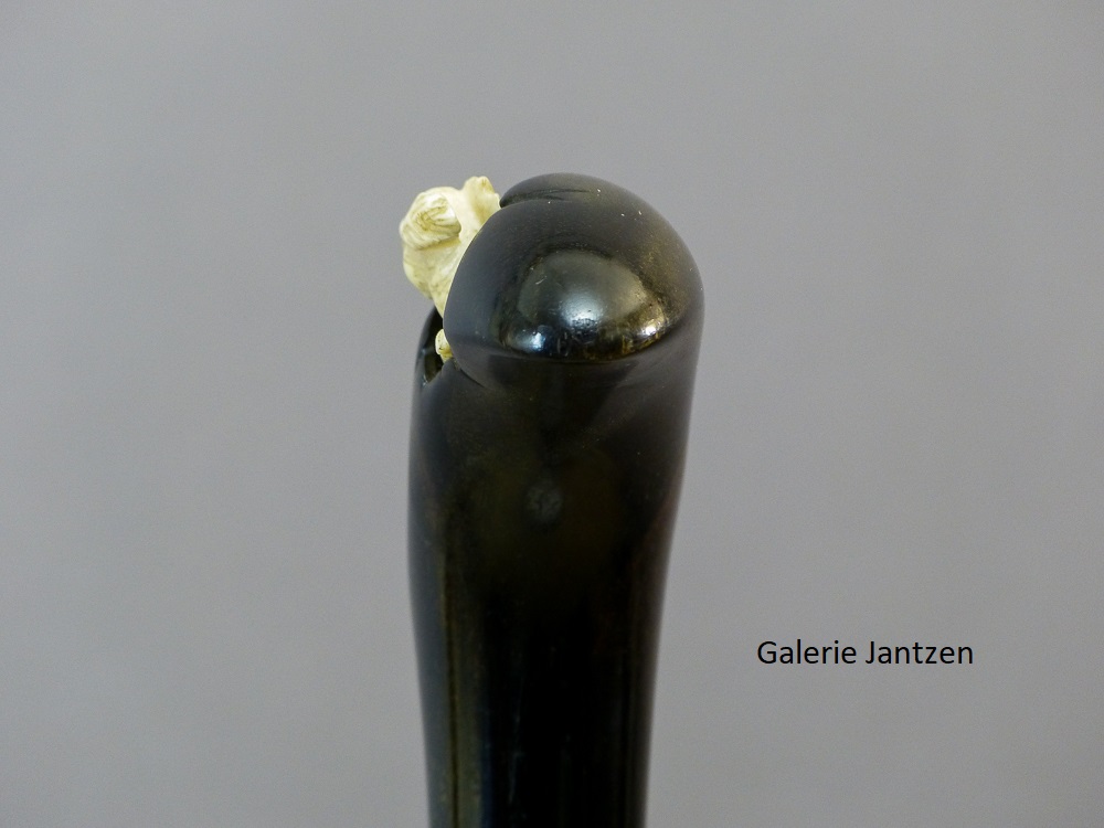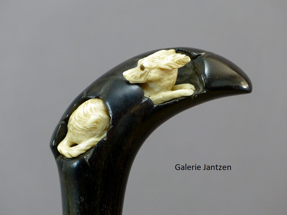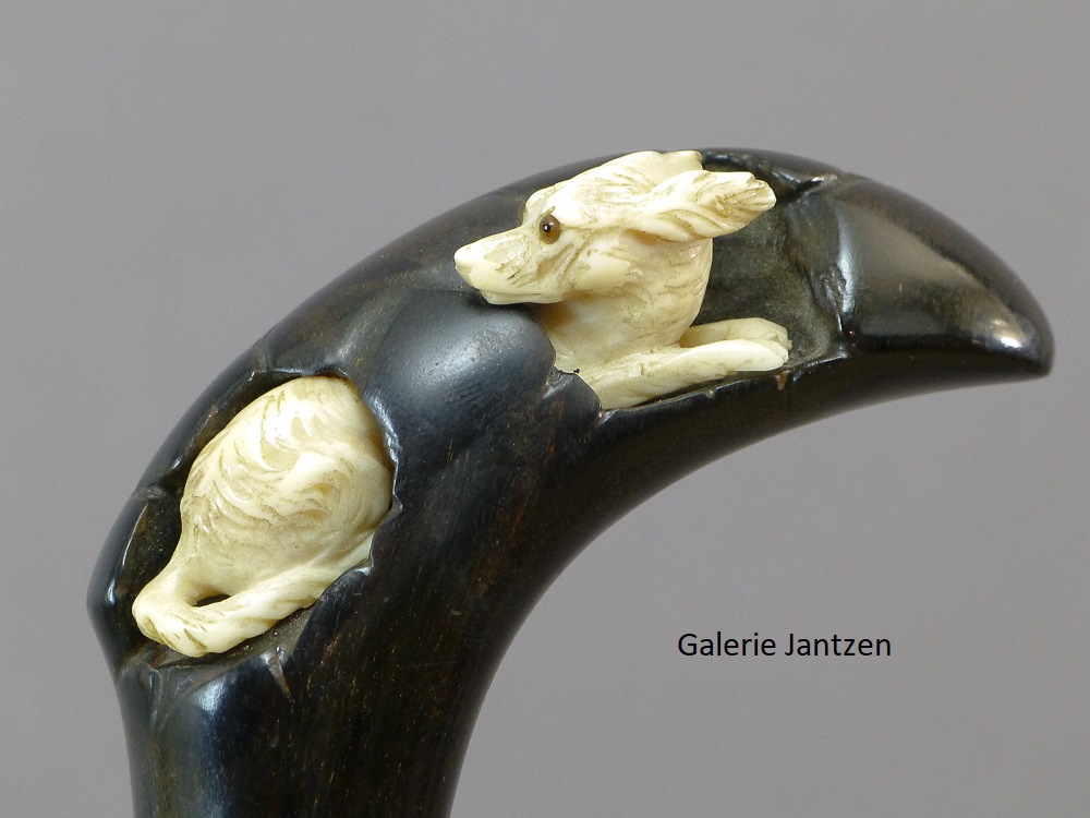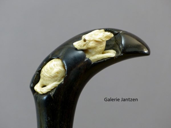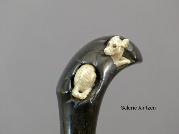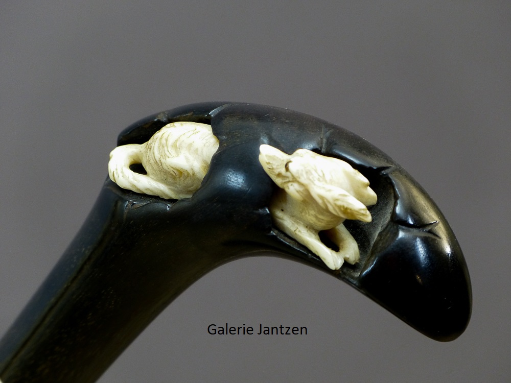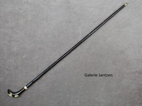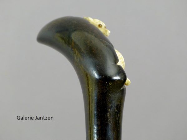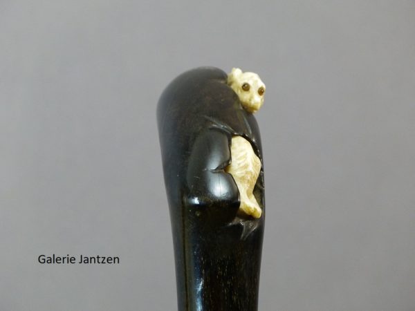 Canne décorative dont le pommeau est de forme mailloche sculpté d’un chien en ivoire très expressif qui se cache. Celui-ci est couché, son regard est craintif, sa queue serrée le long du corps, ses oreilles rabattues en arrière: son attitude indique la fuite ou la volonté de se dissimuler d’un danger. Ses yeux sont en verres marrons, il tourne la tête vers l’arrière comme pour regarder ce qui le suit.