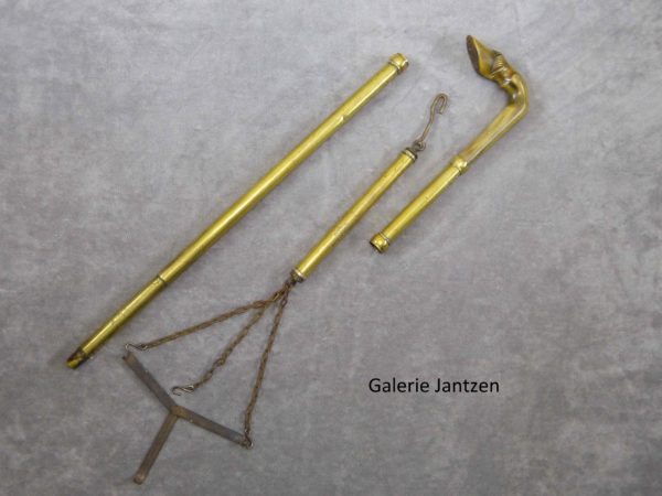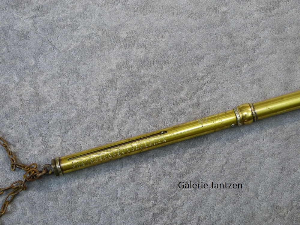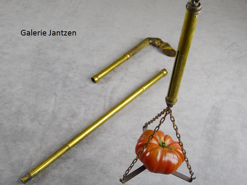 Canne à système de mesure pouvant être utilisée sur les marchés. La poignée de forme équerre est en corne de bœuf et représente un sabot de cheval, elle se dévisse pour libérer un peson. Le peson est une balance constituée d’un ressort dont on mesure l’allongement grâce à une réglette se déplaçant sur une échelle graduée de 1 à 20 kilogrammes. Trois chaînettes tiennent le plateau pliant de la balance qui se trouve inséré dans la partie basse de la canne. Il dispose également d’un crochet en haut pour être accroché ou tenu. Il peut également rester solidaire du haut de la canne pour être tenu dans la main.