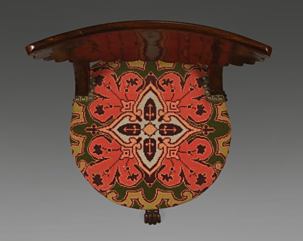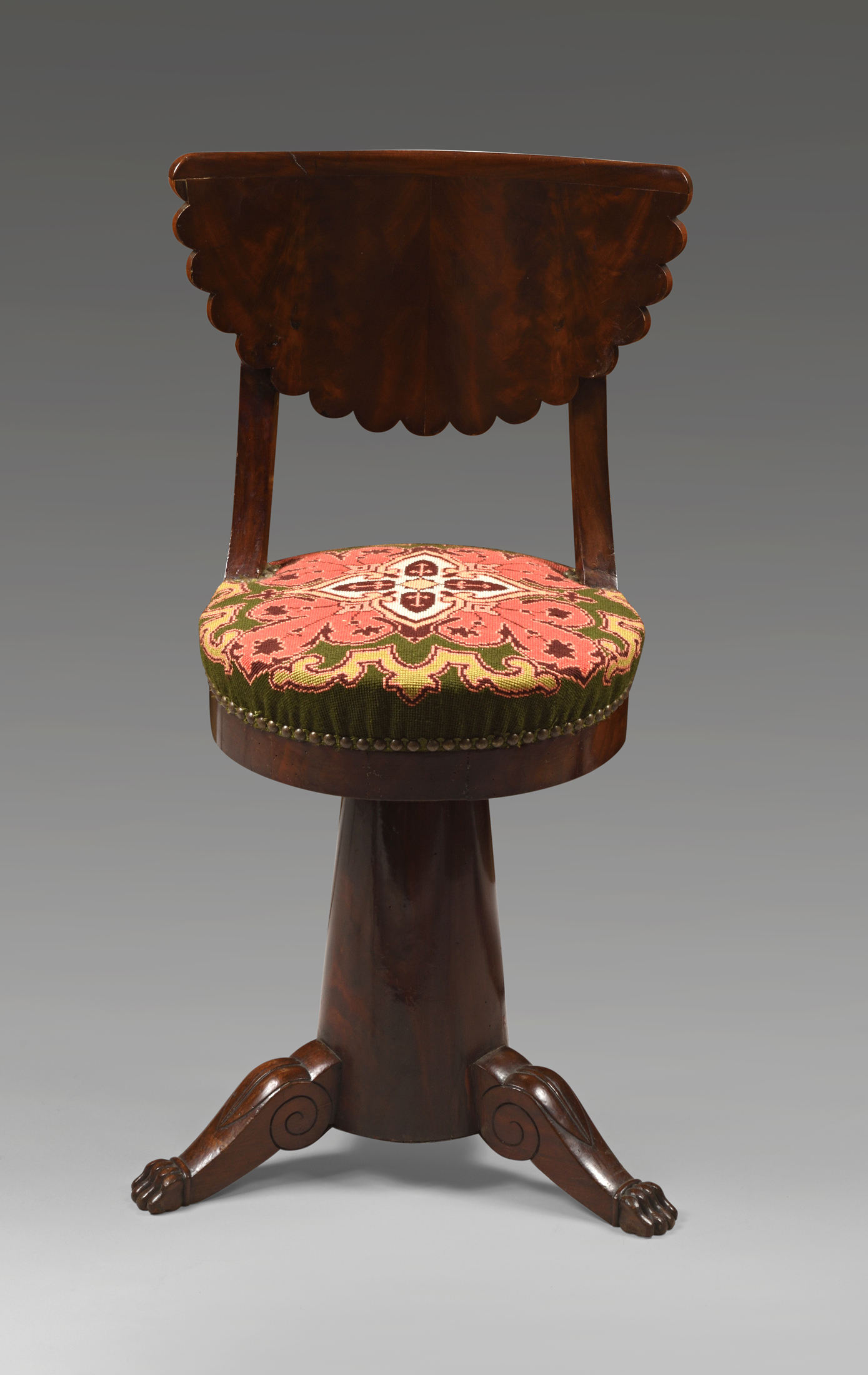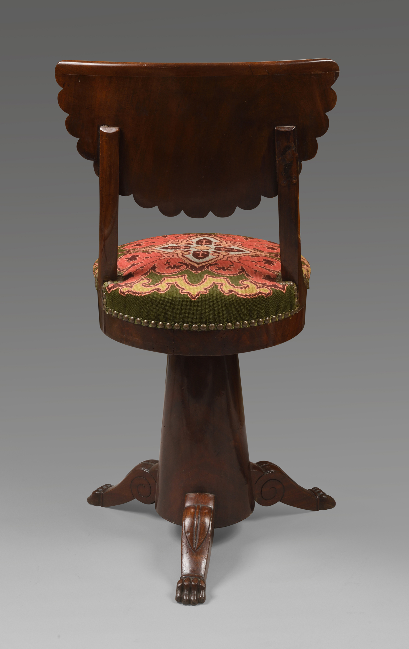 Chaise de musicien en acajou à fut central, piètement tripode terminé par des pieds simulant des griffes. Dossier en éventail. Tapisserie d’origine.