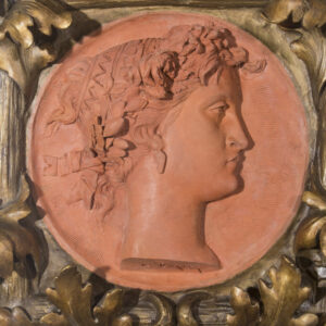 Il n’est donc pas étonnant d’avoir récemment redécouvert cet imposant médaillon en terre cuite dans son cadre d’origine polychrome surmonté dans sa largeur d’un épi de maïs. Il représente une tête de jeune femme couronnée de fleurs dont le sommet de sa coiffe laisse échapper les cheveux au naturel. Très proche stylistiquement de deux autres médaillons déjà connus conservés dans une collection particulière (New York), il pourrait venir en complément d’un cycle représentant les Quatre Saisons ; ceci n’est qu’une possibilité, car l’iconographie des deux médaillons en question est hypothétique, l’un représentant Flore et l’autre Zéphir. S’il s’agissait des Quatre Saisons, notre médaillon pourrait représenter L’Été/Cérès , le second le Printemps/Flore , le troisième L’Automne/Bacchus et manquerait un quatrième, un vieil homme pour l’Hiver. Comme le souligne Laure de Margerie, il est difficile d’associer le médaillon de Zéphir à l’Automne/Bacchus , car ce dernier possède une aile sur sa tête et reste identifié comme Zéphyr. Malgré tout, on peut imaginer que ces trois médaillons, formaient un ensemble décoratif qui demeure incomplet et non identifié à ce jour. Notre terre cuite originale quant à elle est une découverte dans l’œuvre du sculpteur. D’après le catalogue raisonné, les deux médaillons connus sont datés de la période niçoise de Cordier et pourraient être datés, sans certitude, vers 1877-1890. Délaissant Paris à la fin du second Empire, Cordier s’est en effet installé dans un premier temps à Nice, puis, à partir de 1890, à Alger où il finit ses jours.