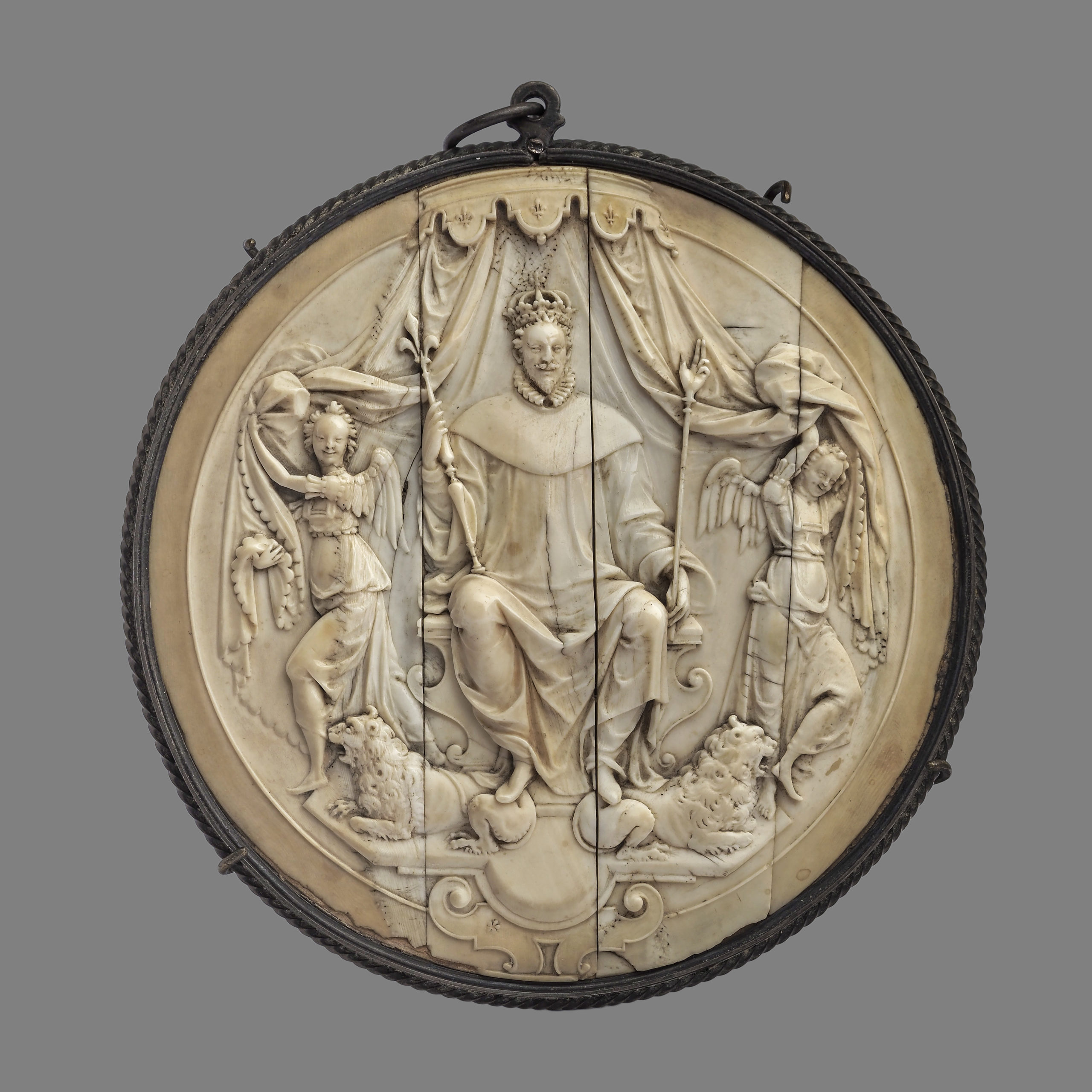 Sur notre médaillon en ivoire sculpté, Charles IX est assis sous un dais dont deux anges écartent les pans. Il tient la main de justice et le sceptre royal, symboles de son pouvoir au même titre que la couronne dont il est coiffé ainsi que les lions sur lesquels reposent ses pieds, rappel du trône de Salomon. Notre médaillon, qui reproduit le sceau de l’ordre de Saint Michel (fondé le 1er août 1469 par Louis XI, et dont le roi de France est le grand maître) était peut-être le couvercle de l’écrin destiné à ce sceau. Peu d’objets français en ivoire nous sont parvenus de cette période.