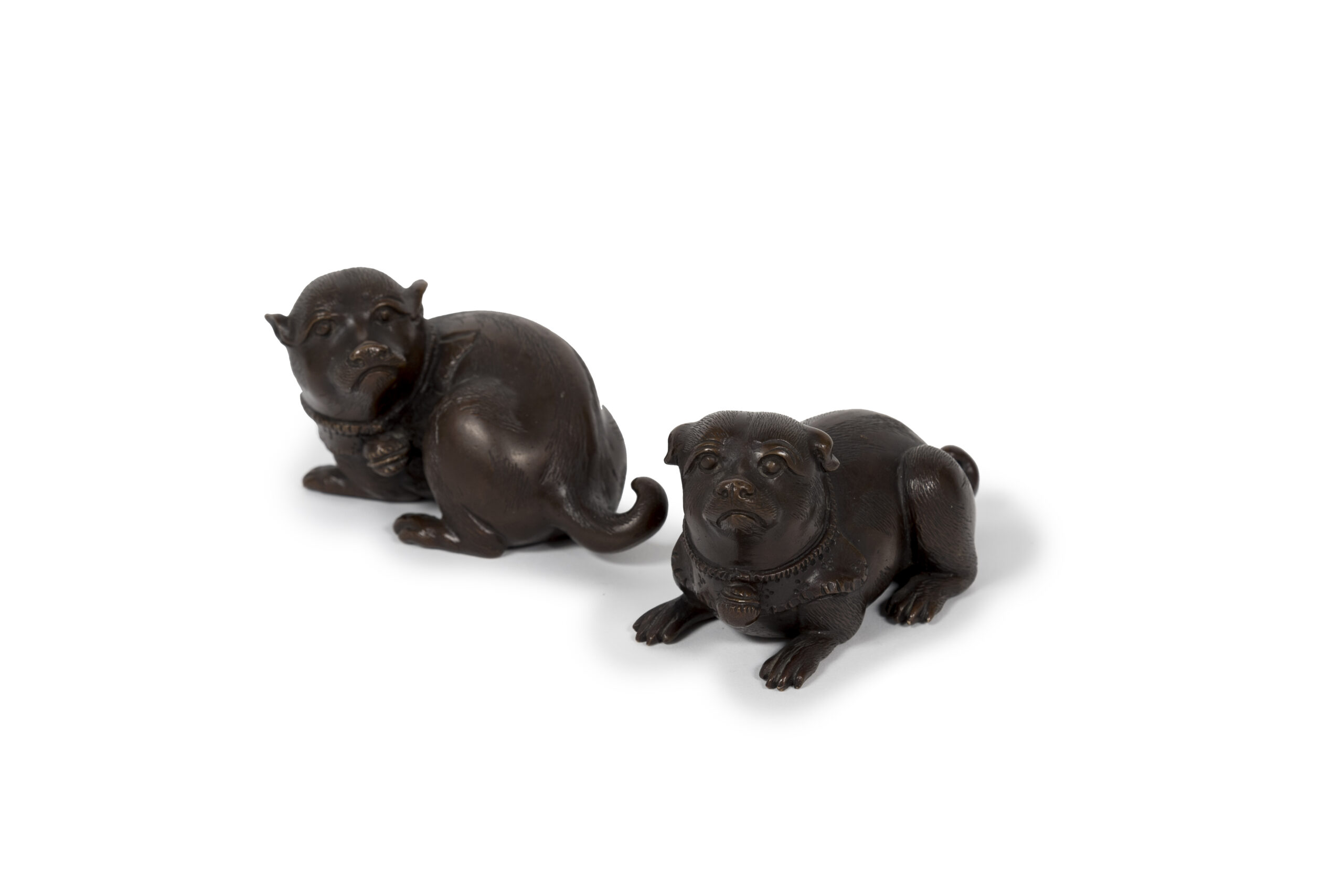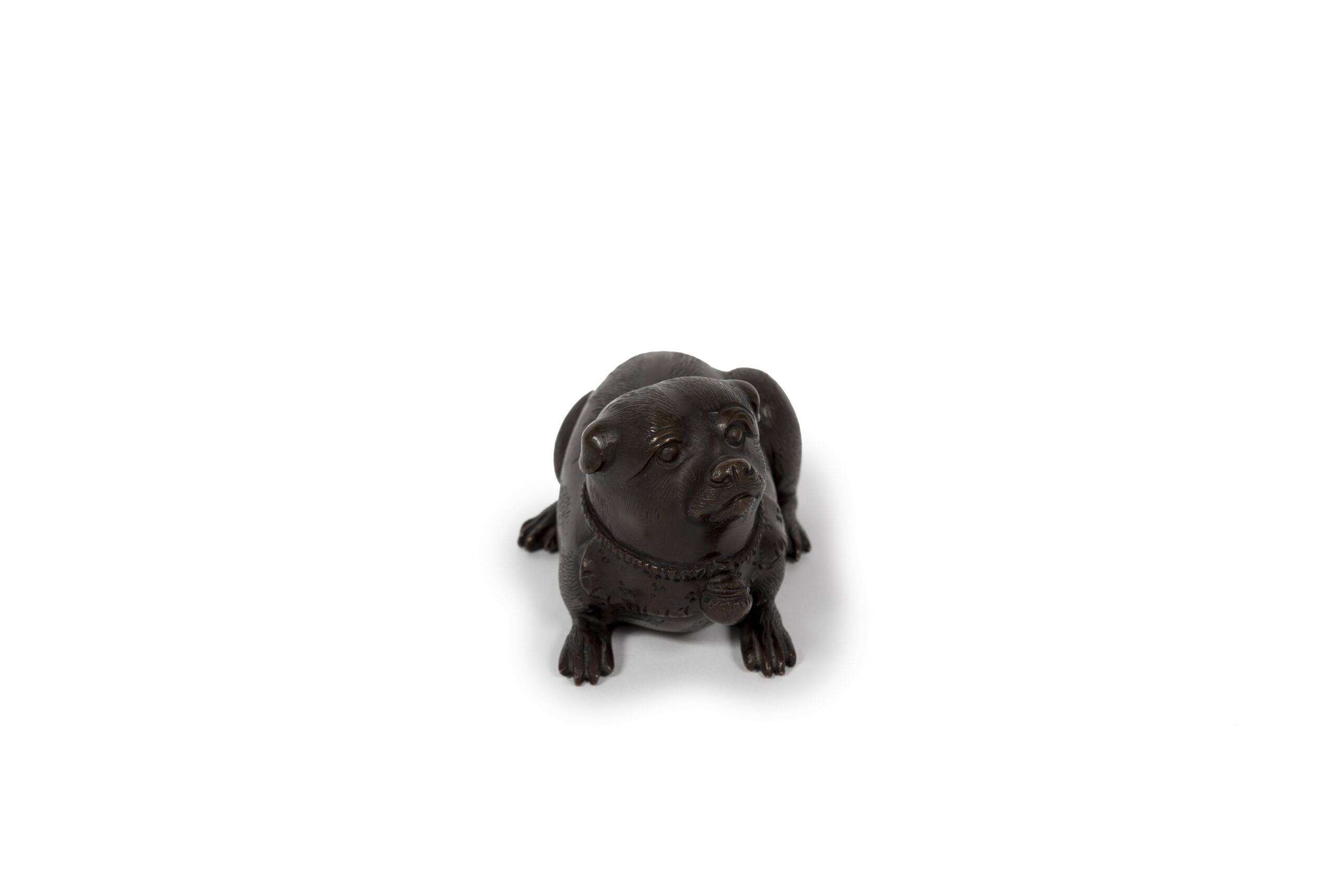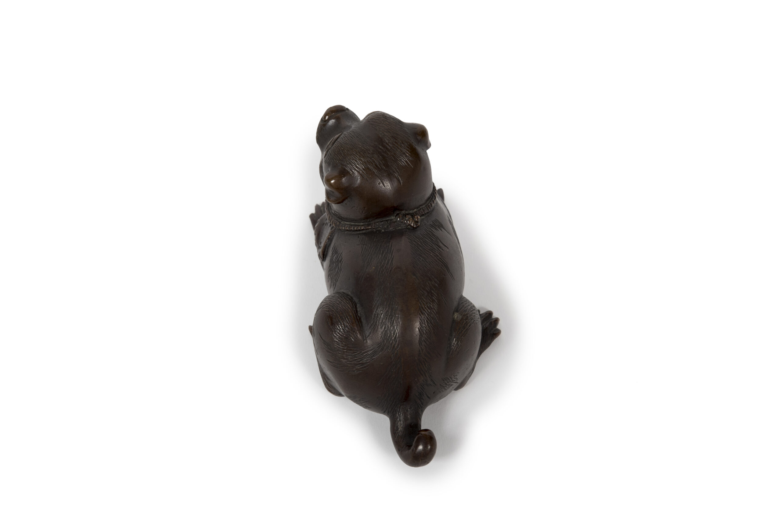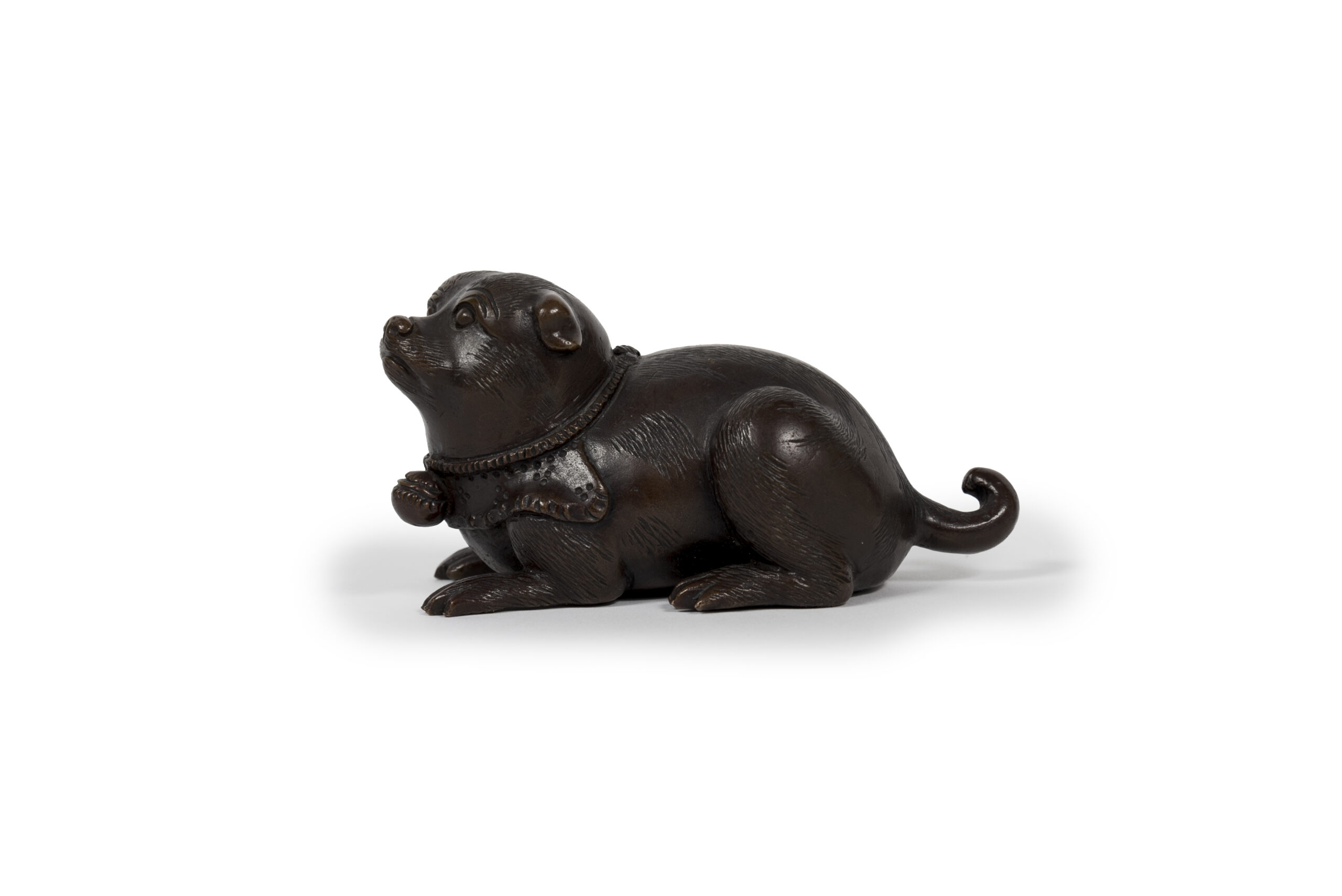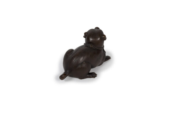 This kind of subject is common in traditional Nippon sculptures, this specific piece reminds of archaic bronze sculptures. Nevertheless, the puppy is treated with a great sense of detail, especially to represent the texture of the fur and the jingle hanging from the collar on its neck. Being among the twelve animals of the traditional Chinese zodiac, dogs are attached to a prominent symbolism all over Asia.