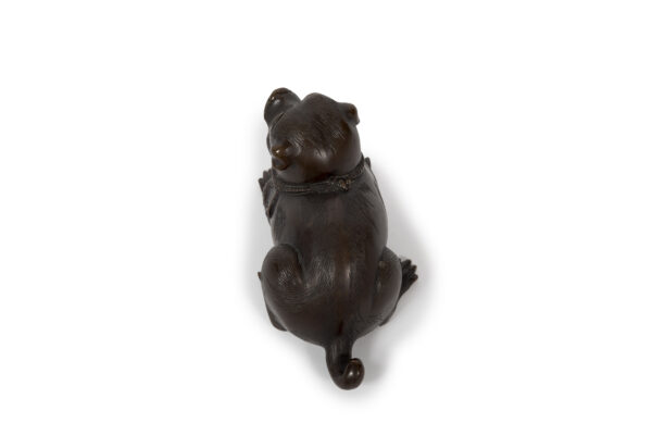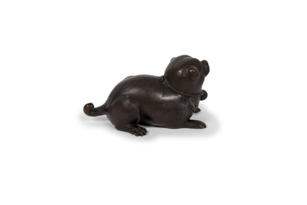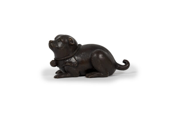 Ce type de sujet est fréquent dans la statuaire nippone, cette pièce en particulier rappelle les bronzes animaliers archaïques. Le chiot est néanmoins traité avec un grand sens du détail notamment pour simuler la texture de la fourrure ou encore le collier et le grelot qu’il porte autour du cou. Le chien est un des douze animaux du zodiaque chinois revêt une forte symbolique partout en Asie.
