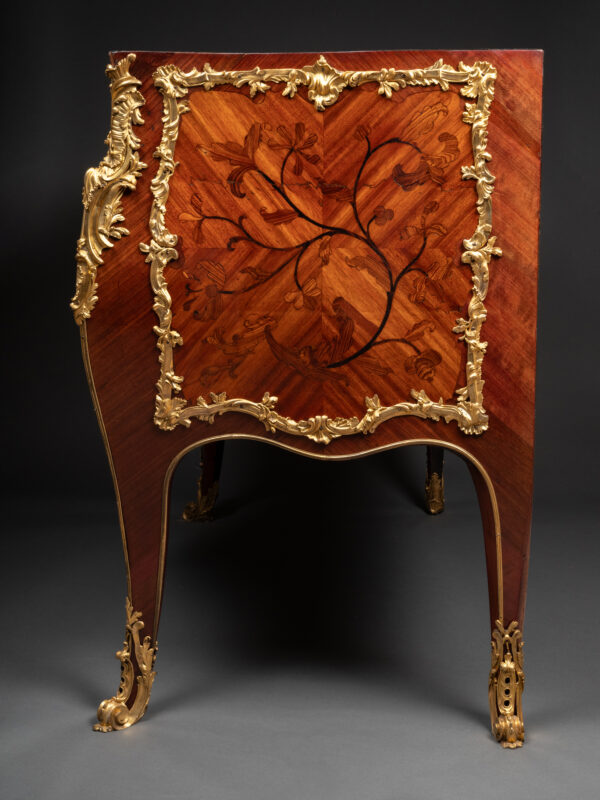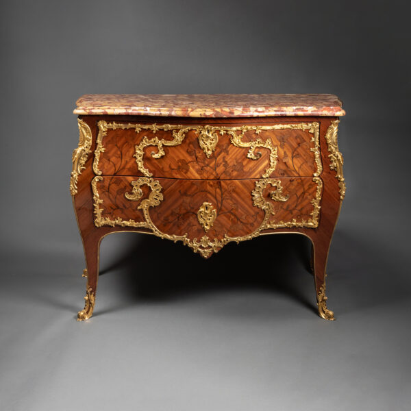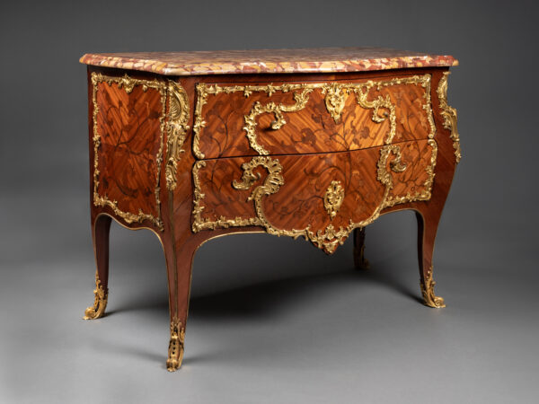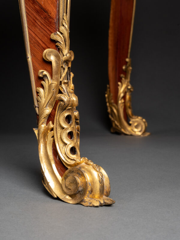 Tulipwood, satinwood and amaranth, oak frame, chased and gilded bronze, breche d’Alep marble top