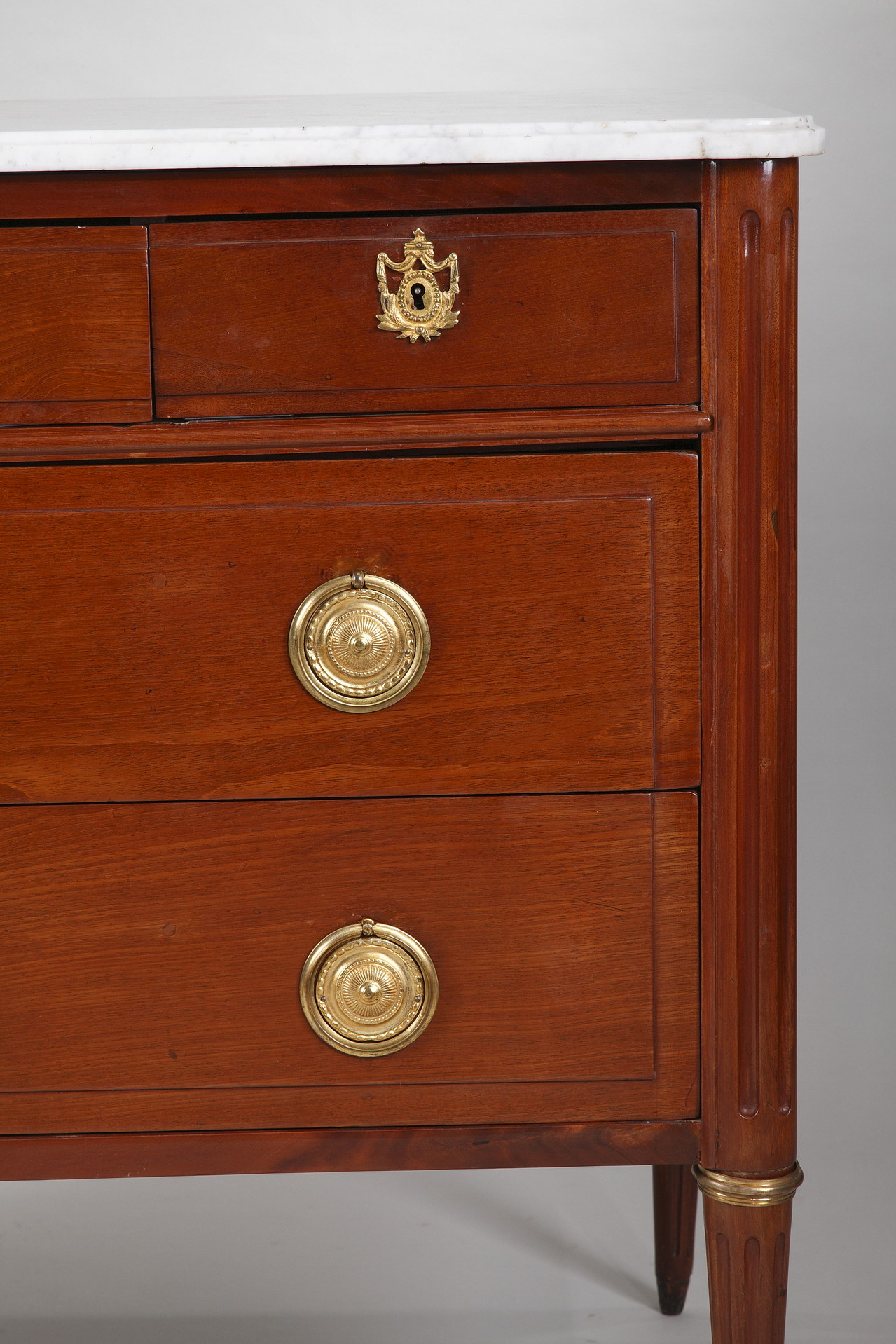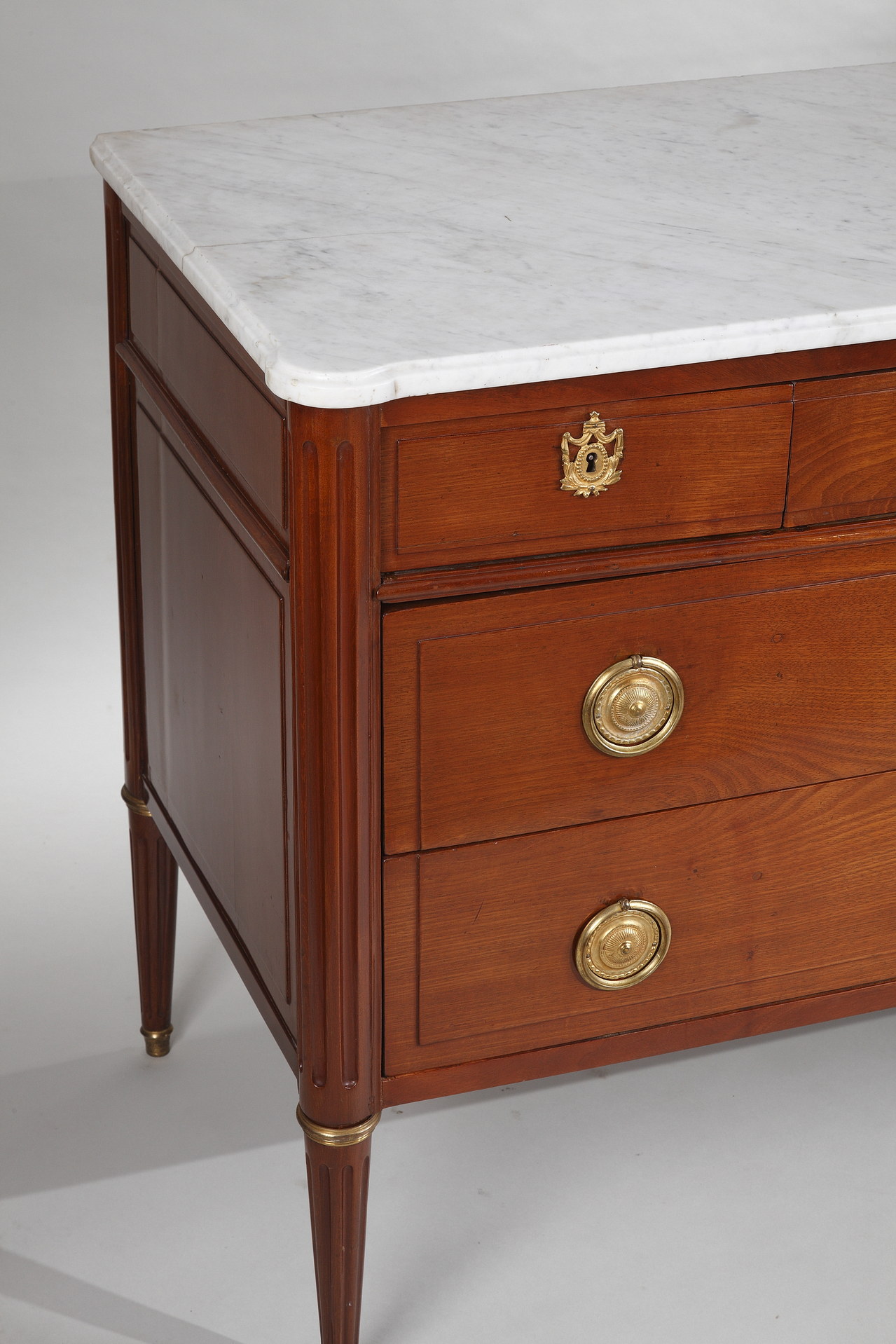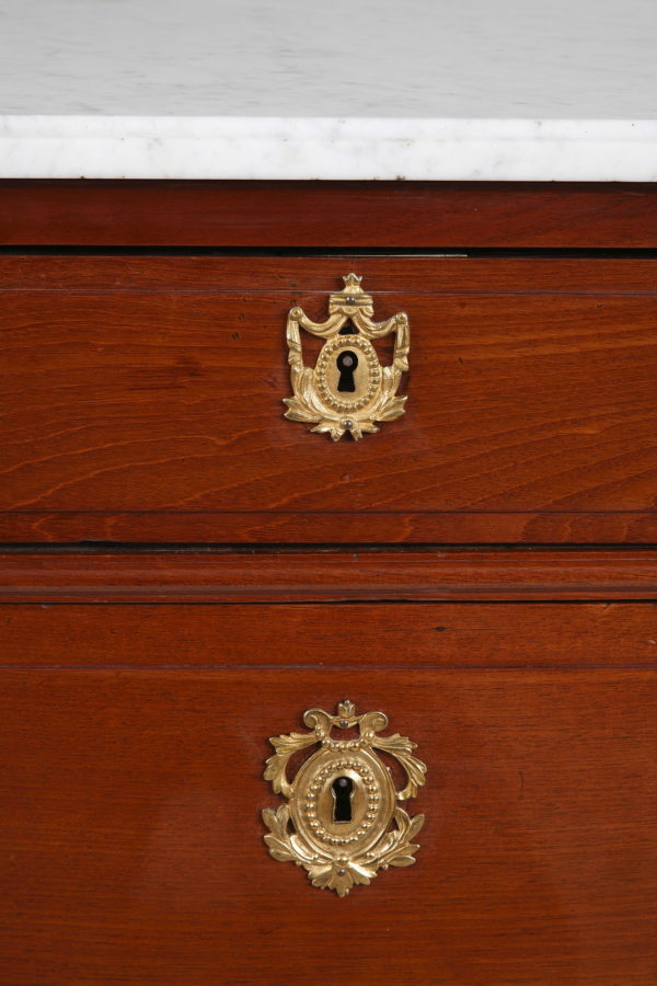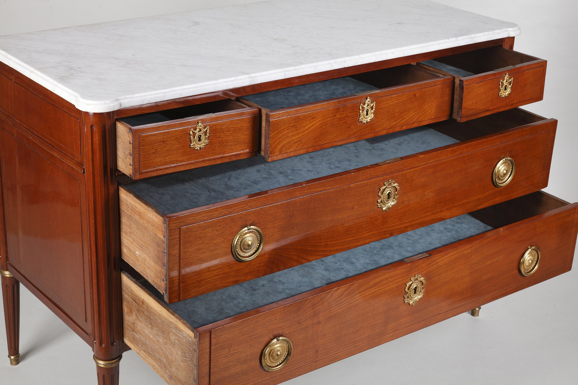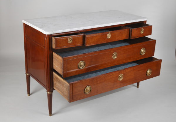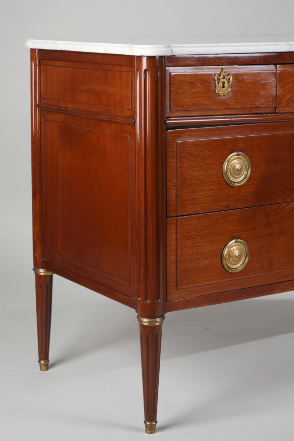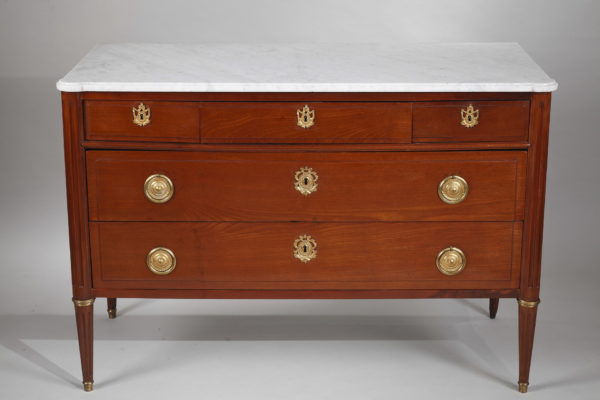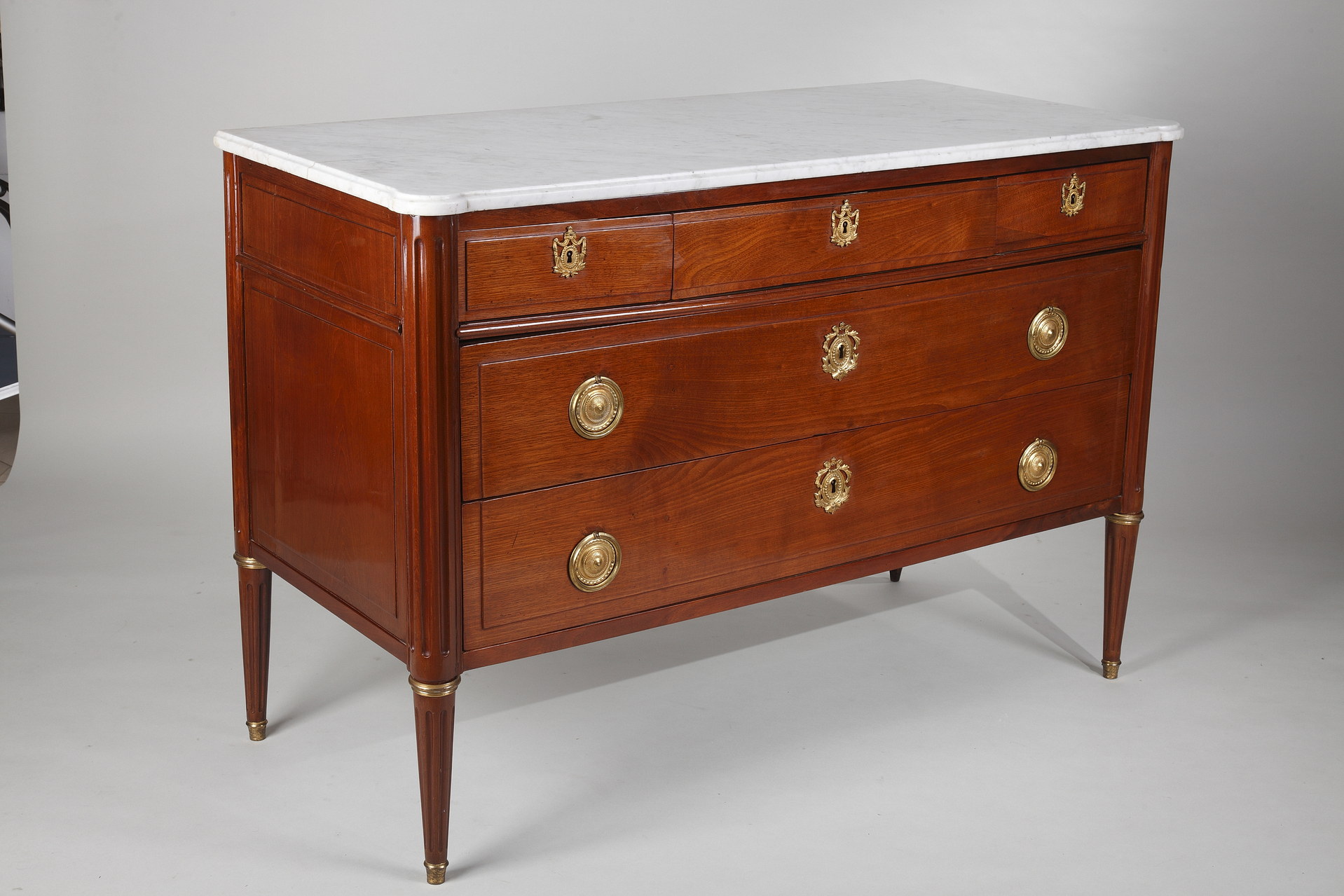 Mahogany chest of drawers opening with five drawers in three rows, the two lower drawers without crossbar, the molded white Carrara marble top with groove on field resting on rounded fluted uprights terminated by tapered feet decorated with gilt bronze clogs.