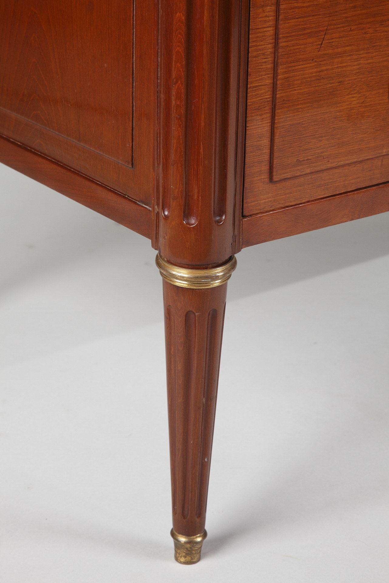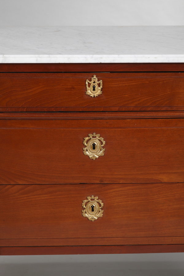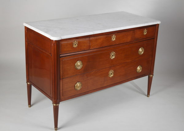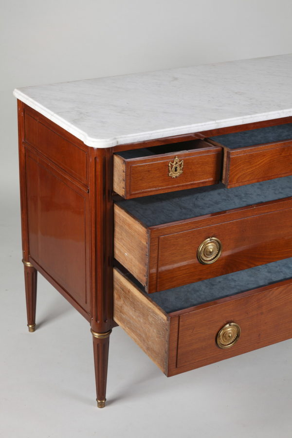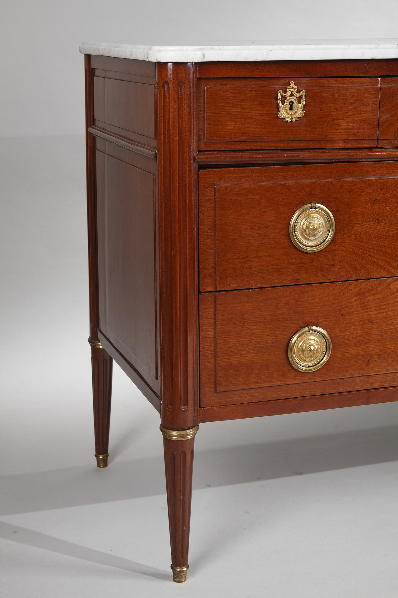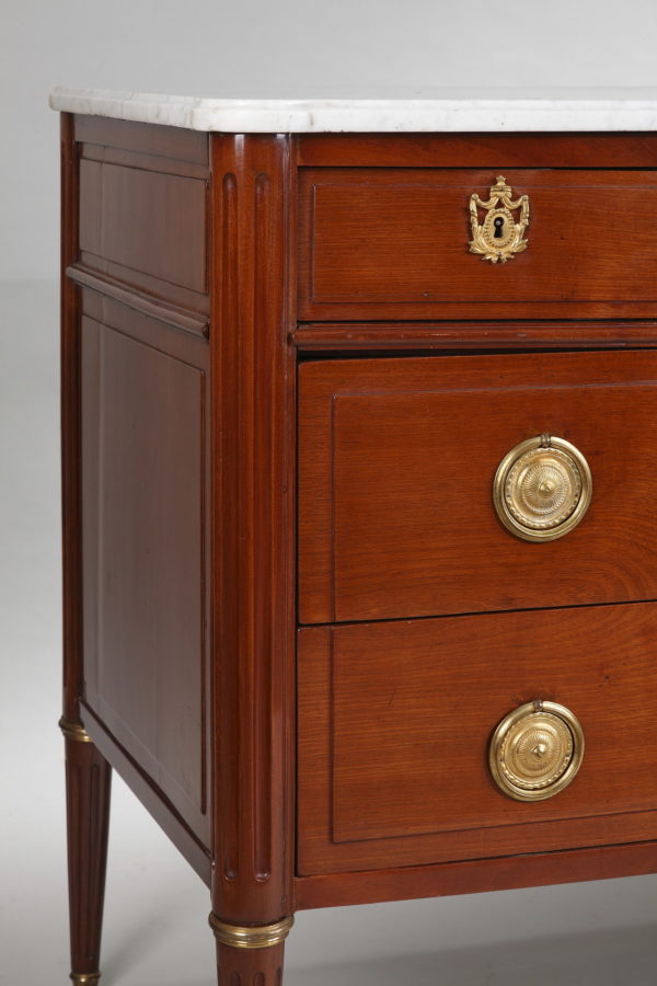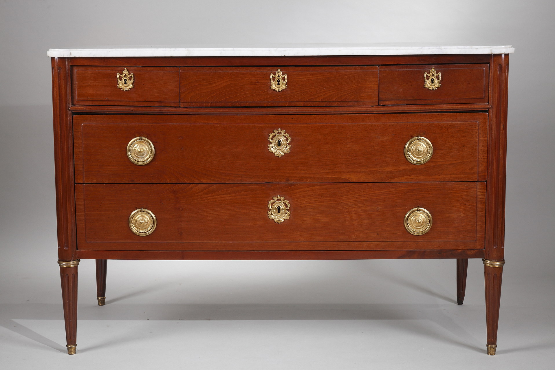 Mahogany chest of drawers opening with five drawers in three rows, the two lower drawers without crossbar, the molded white Carrara marble top with groove on field resting on rounded fluted uprights terminated by tapered feet decorated with gilt bronze clogs.