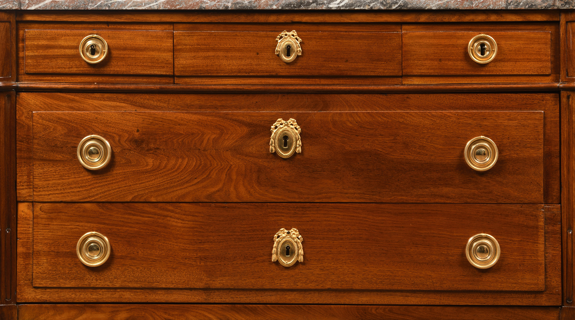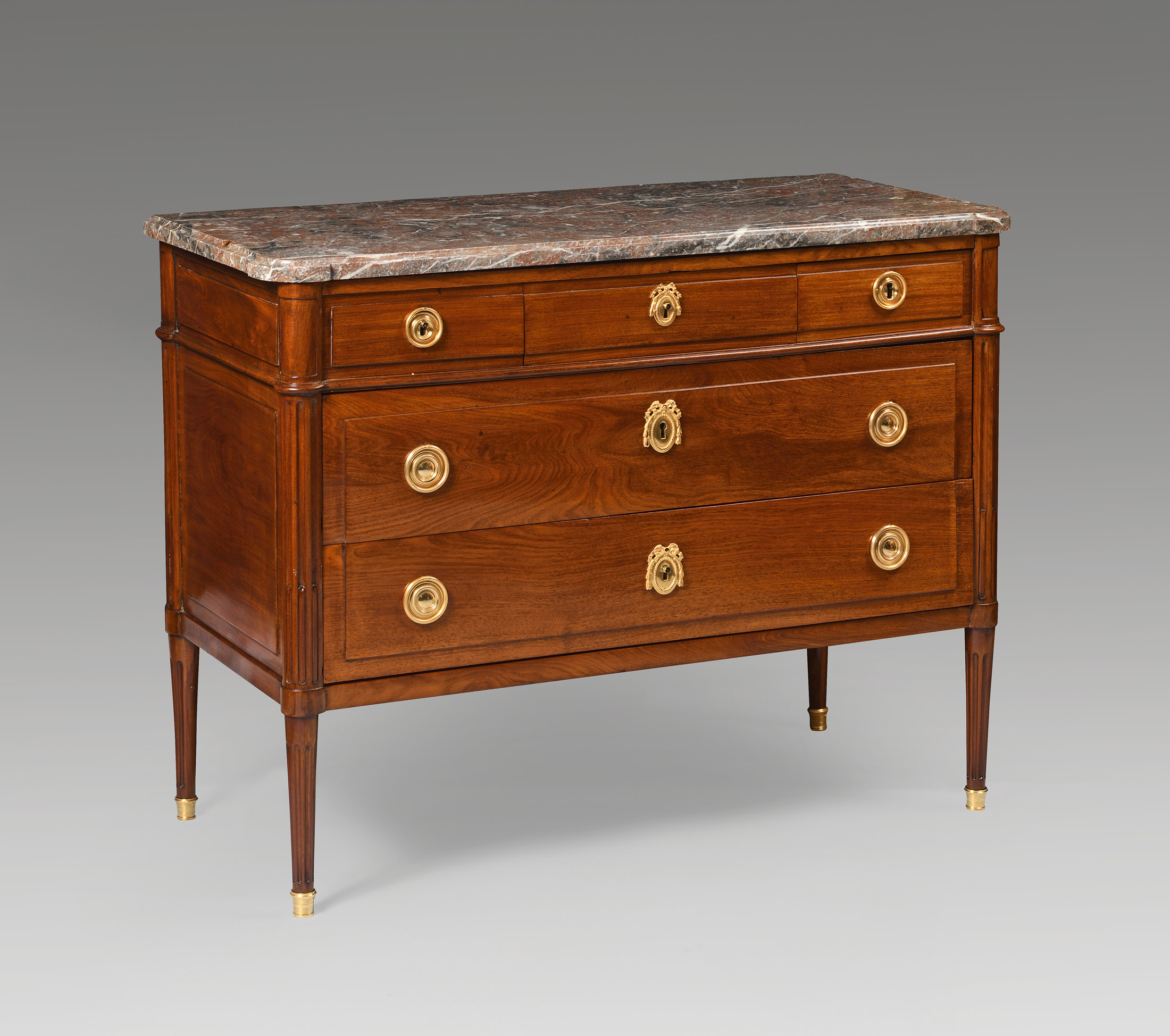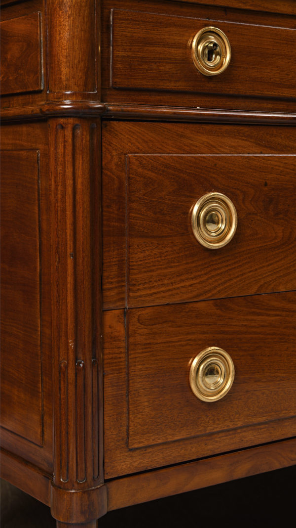 Commode en acajou massif de forme rectangulaire. Elle ouvre par trois rangs de tiroirs dont ceux de la partie inférieure, sans traverse. Montants droits cannelés et fuselés. Ornementation de poignées. Entrées et sabots dorés et ciselés. Dessus de marbre brèche.