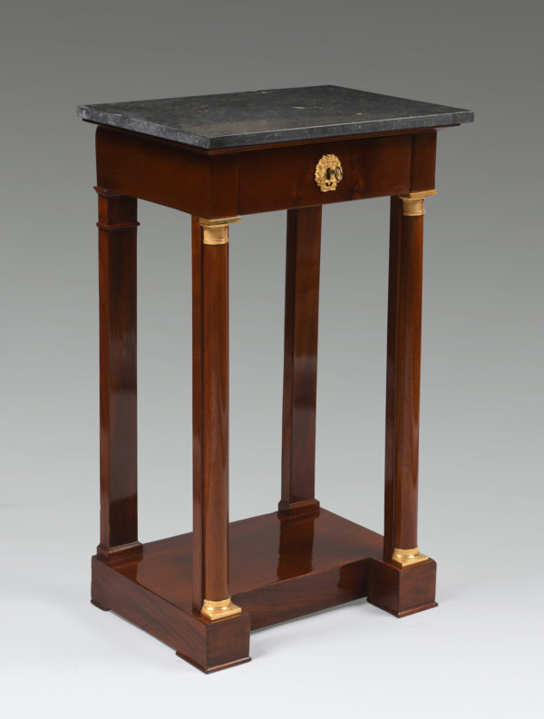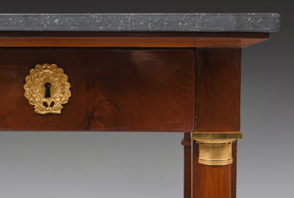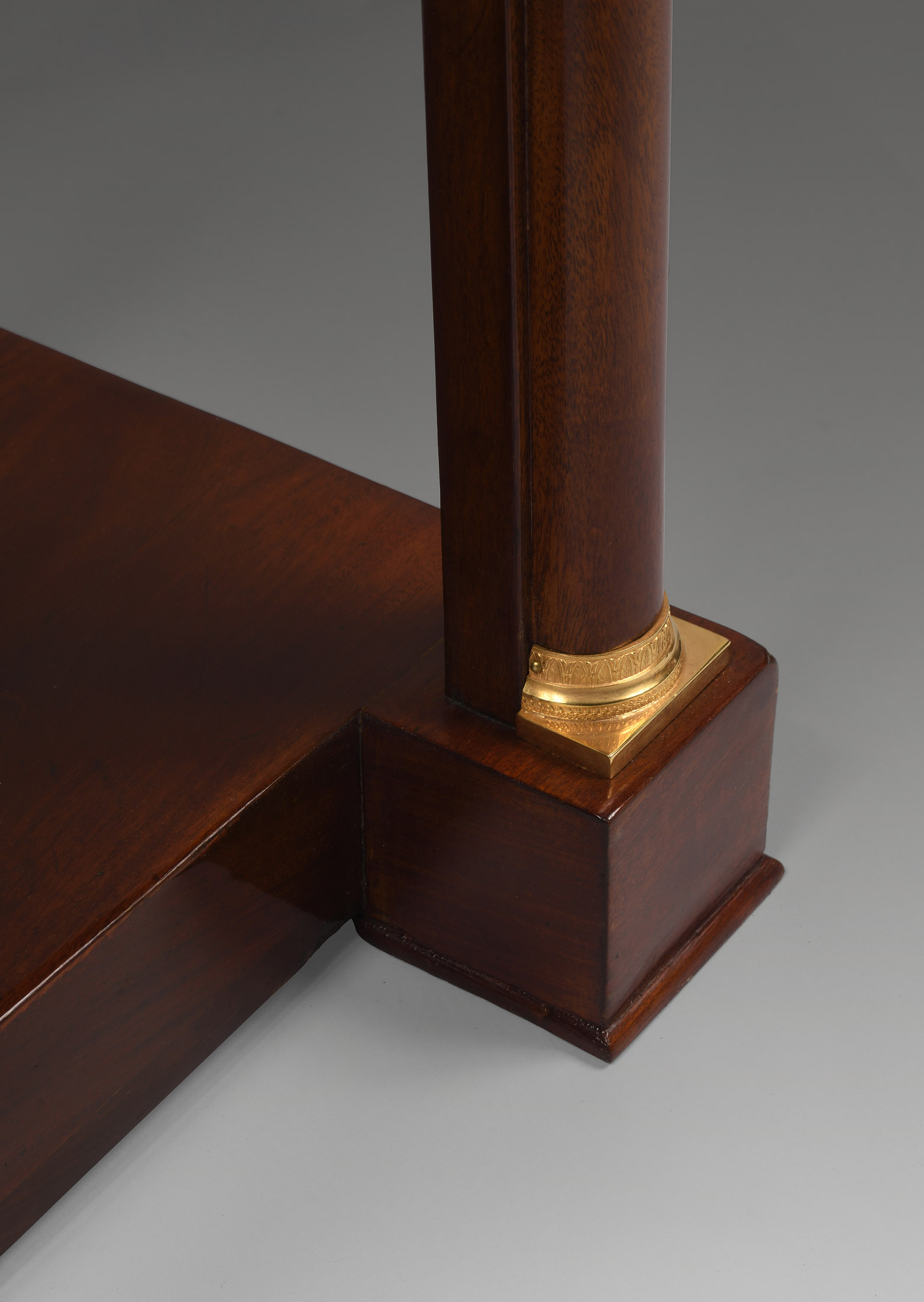 Console en acajou et placage d’acajou de forme rectangulaire. Montants droits et à demi colonne en façade. Tablette d’entretoise. Elle ouvre par un tiroir dans la façade. Ornementation de bronzes dorés et ciselés. Dessus de marbre granit belge.