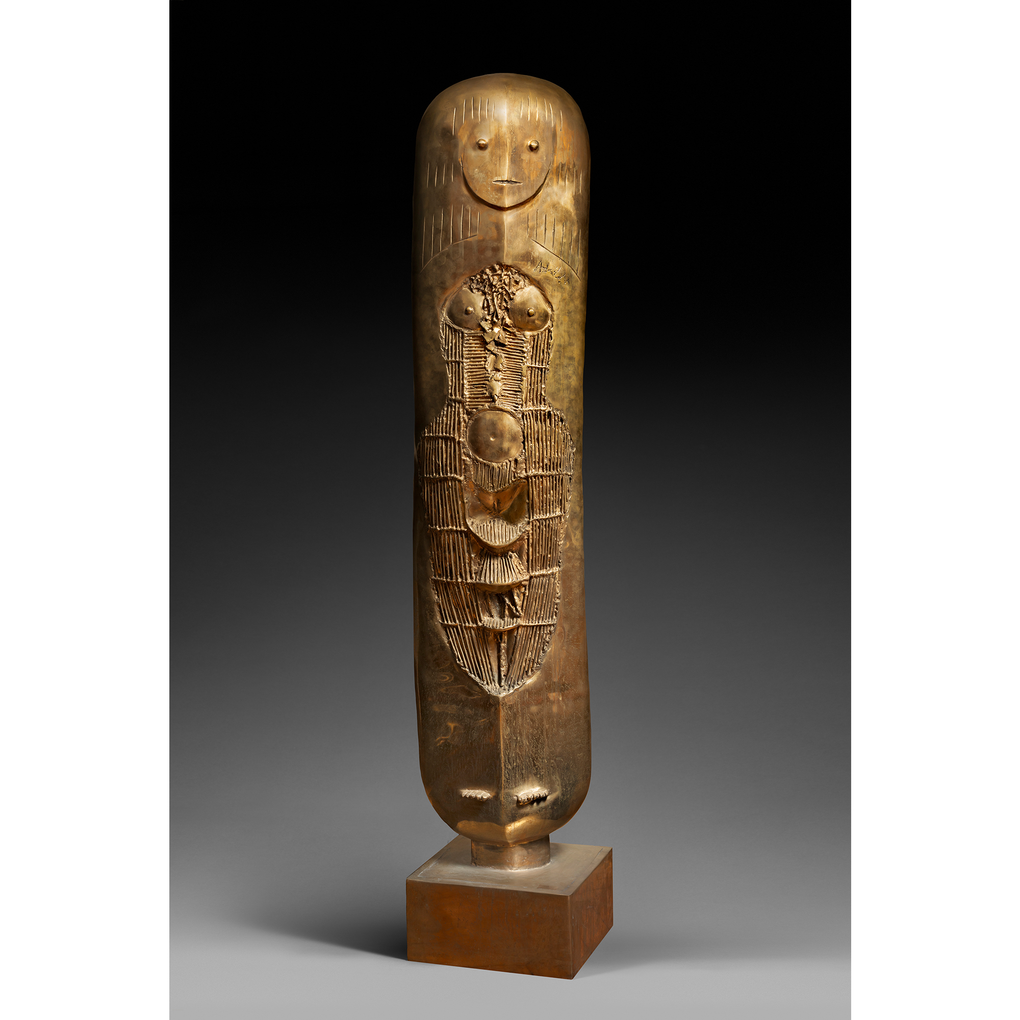 Momie Darling seems to be cinched in a corset of stretched brass thread, strips of metal emphasizing the attributes of femininity. Overtly stylizing shapes, Andreou superimposes spheres – her head, breasts, belly, buttock – giving way to a feminine triumph. With her vertical structure, pure and hieratic, she becomes a totem, an idol, a divinity.