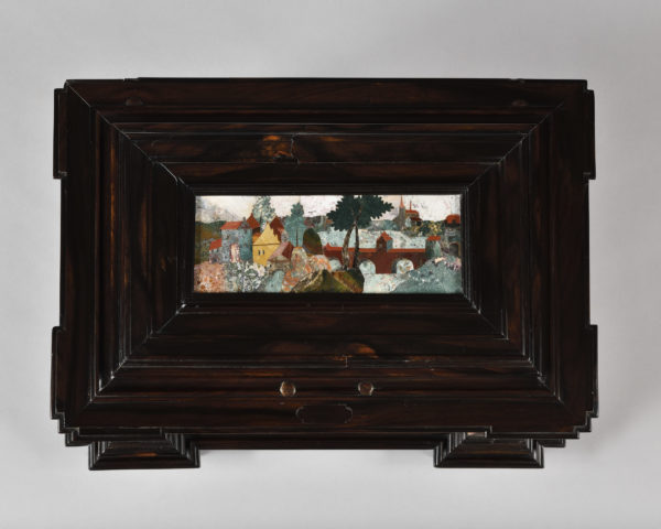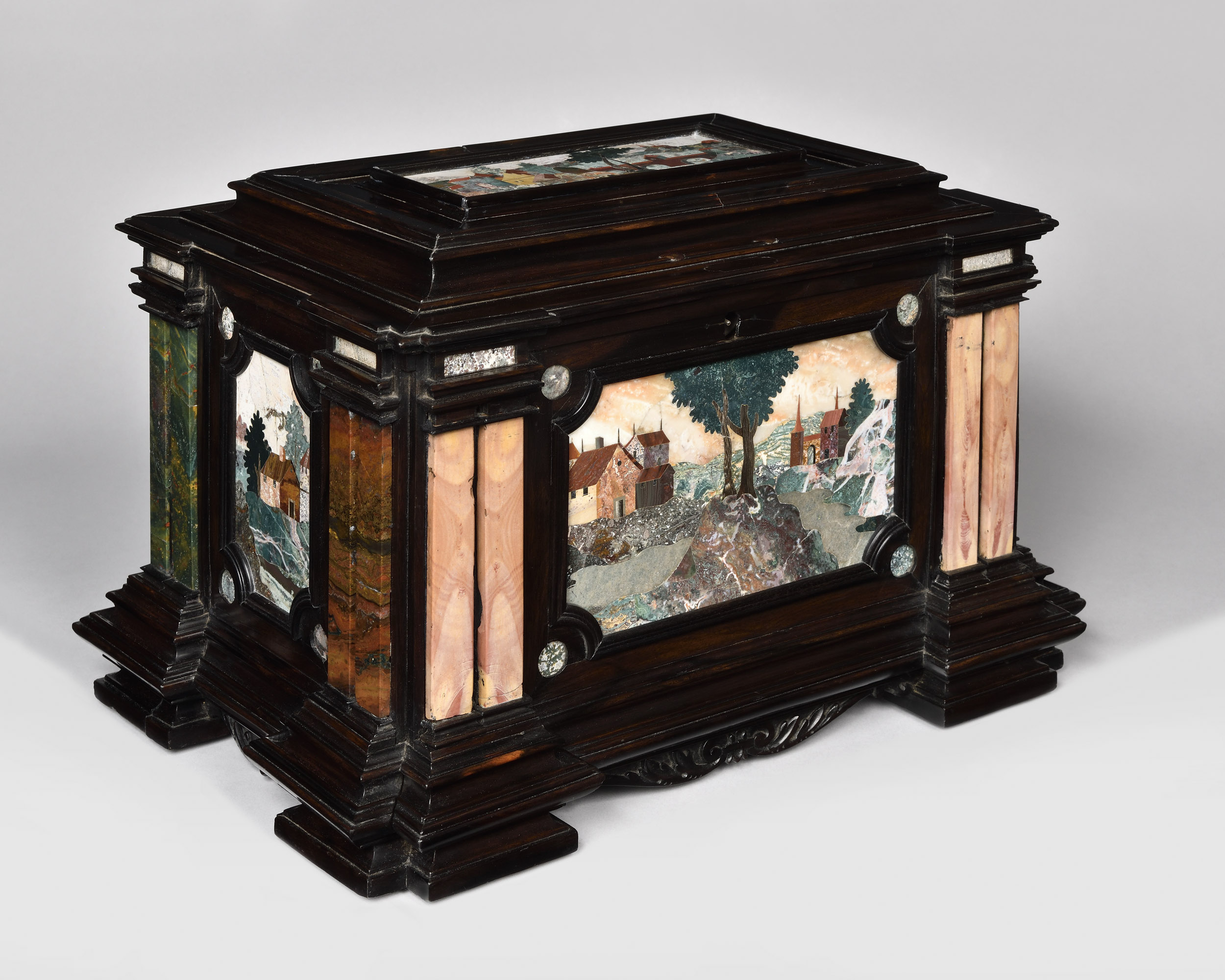 Rare coffret en marqueterie de pierres dures ; agates, jaspes de Bohème et calcédoines, sur fond d’ébène.
