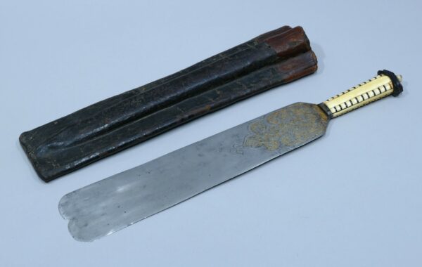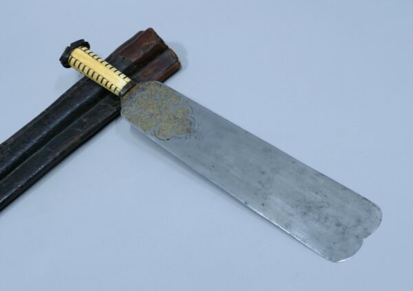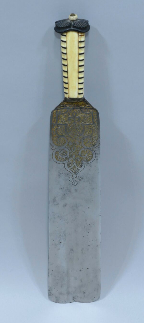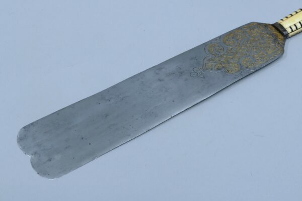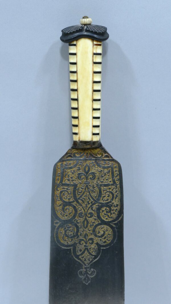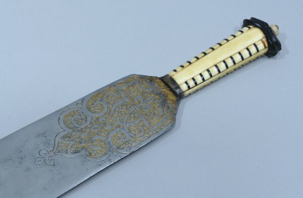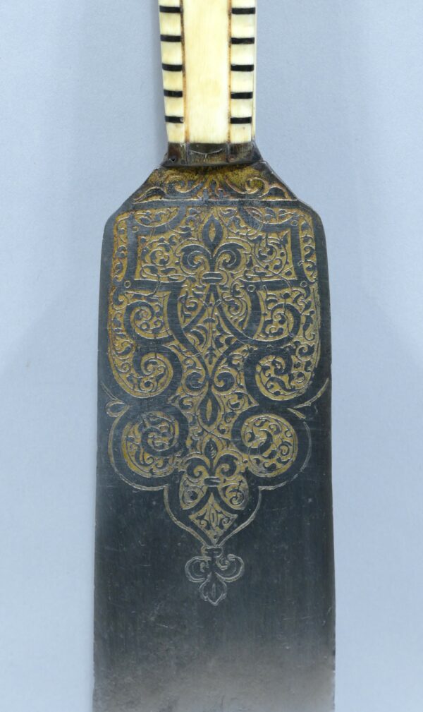 Large lame en accolade, plate et carré, damasquinée avec décor d’entrelacs, rinceaux et feuillages surmonté d’une fleur de lys.