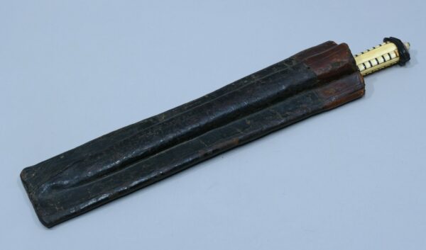 Couteau présentoir avec manche en ivoire et ébène surmonté d’un bouton en ivoire godronné et laiton.