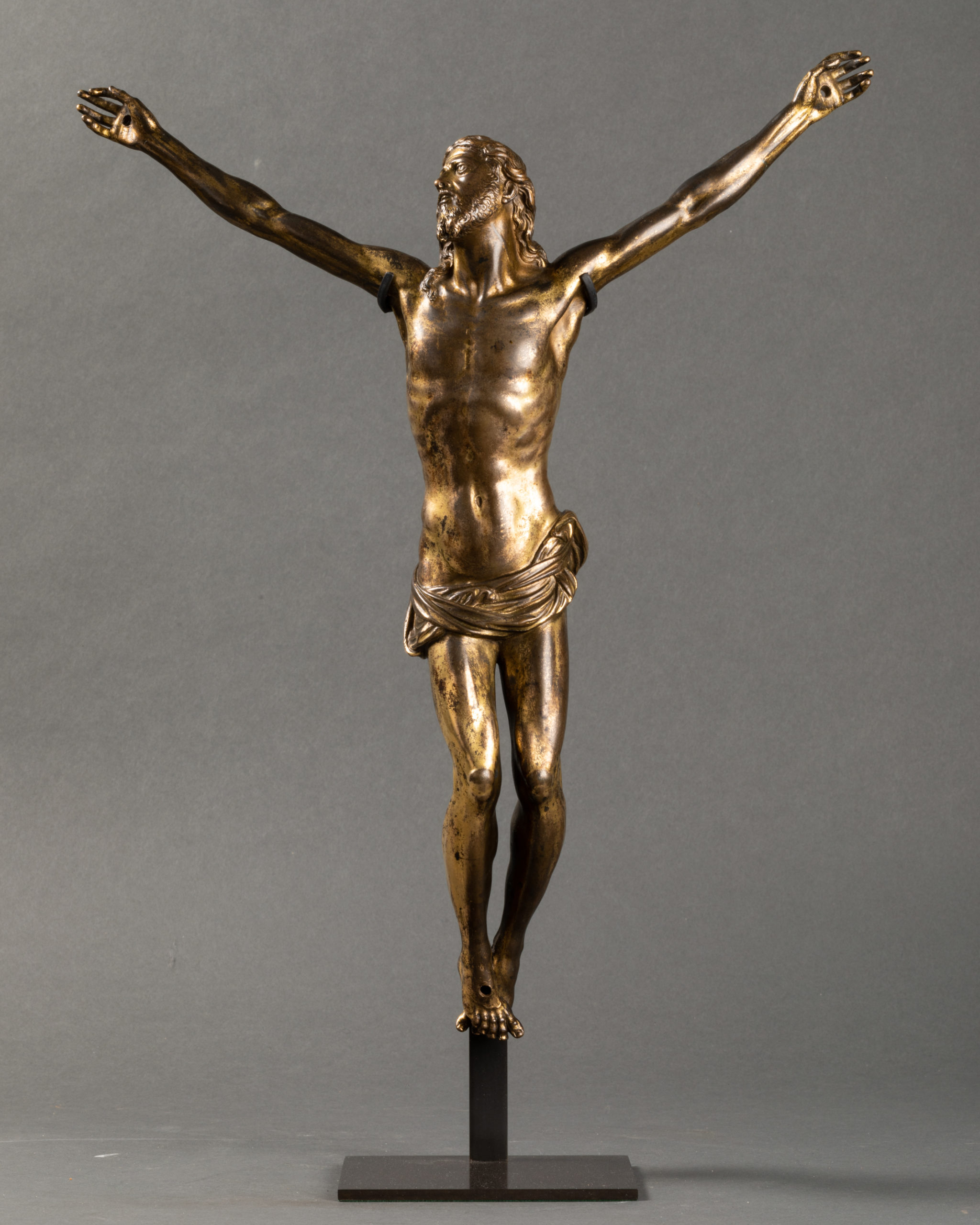 This splendid Christ was made in Tuscany, Italy, at the beginning of the 17th century. The bronze work gives the Christ an idealized physical appearance, particularly due to the great precision and profusion of details. Particular attention is paid to the chiselling of the hair, beard and facial features, which are of great plastic sensitivity. Despite the protruding ribs of Christ, the twisting of the exhausted body and the tension of his dying muscles, a real serenity emerges from this work. Stripped of all divine character, to be only a man, Christ is dressed only in the traditional perizonum, with a strongly folded drape, leaving one hip uncovered.