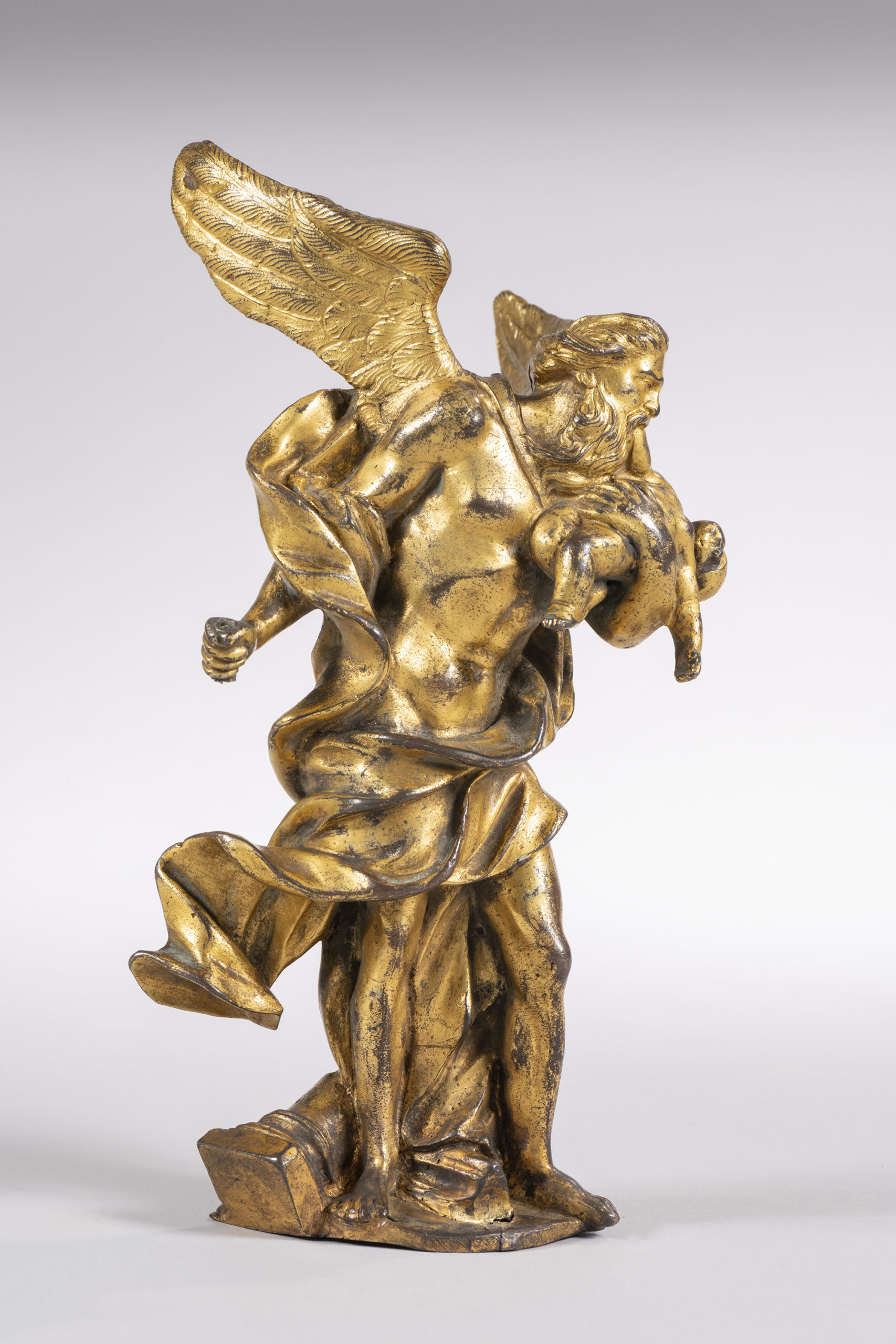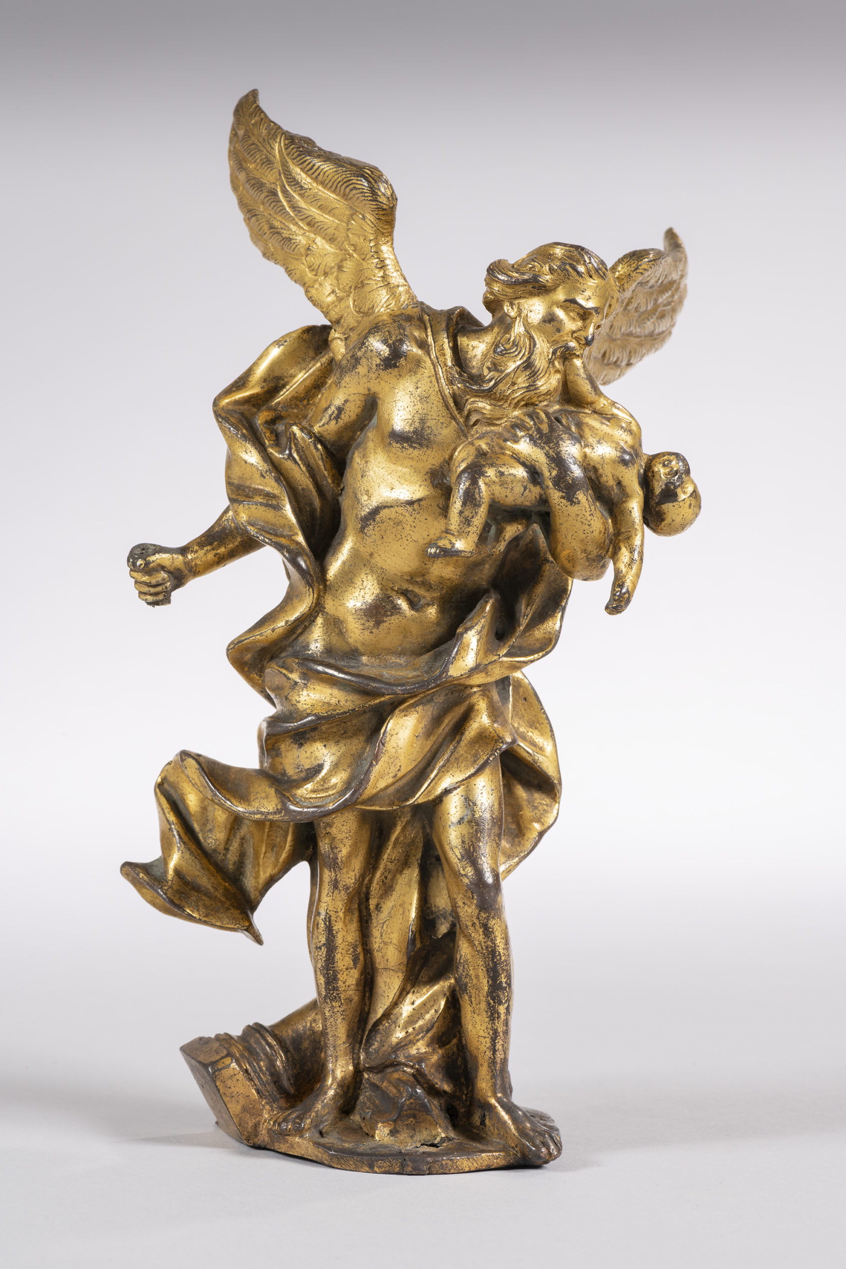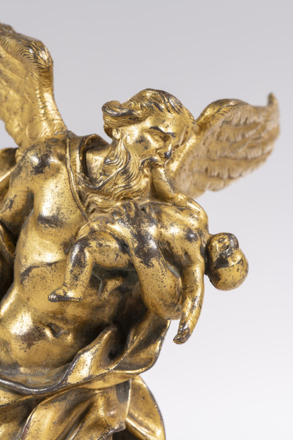 Ce remarquable bronze doré représente la divinité grecque Cronos (Saturne pour les romains), en train de dévorer un de ses enfants. Fils des divinités primordiales Gaïa et Ouranos, le titan Cronos se retourne contre son père afin de libérer ses frères et sœurs que ce dernier avait fait enfermer dans les entrailles de la terre, craignant d’être détrôné par sa progéniture. A la suite de cet épisode, Cronos devint leur roi et prend pour épouse sa soeur Rhéa. Mais bientôt, il s’engage dans un règne aussi tyrannique que le précédent. Ayant été averti que l’un de ses propres enfants le renverserait à son tour, il décide de les dévorer un à un dès leur naissance. Ainsi, il engloutit Hestia, Déméter, Héra, Hadès et Poséidon. Le dernier né, Zeus, est heureusement sauvé par sa mère grâce au subterfuge de la pierre langée et finira d’accomplir la prophétie.