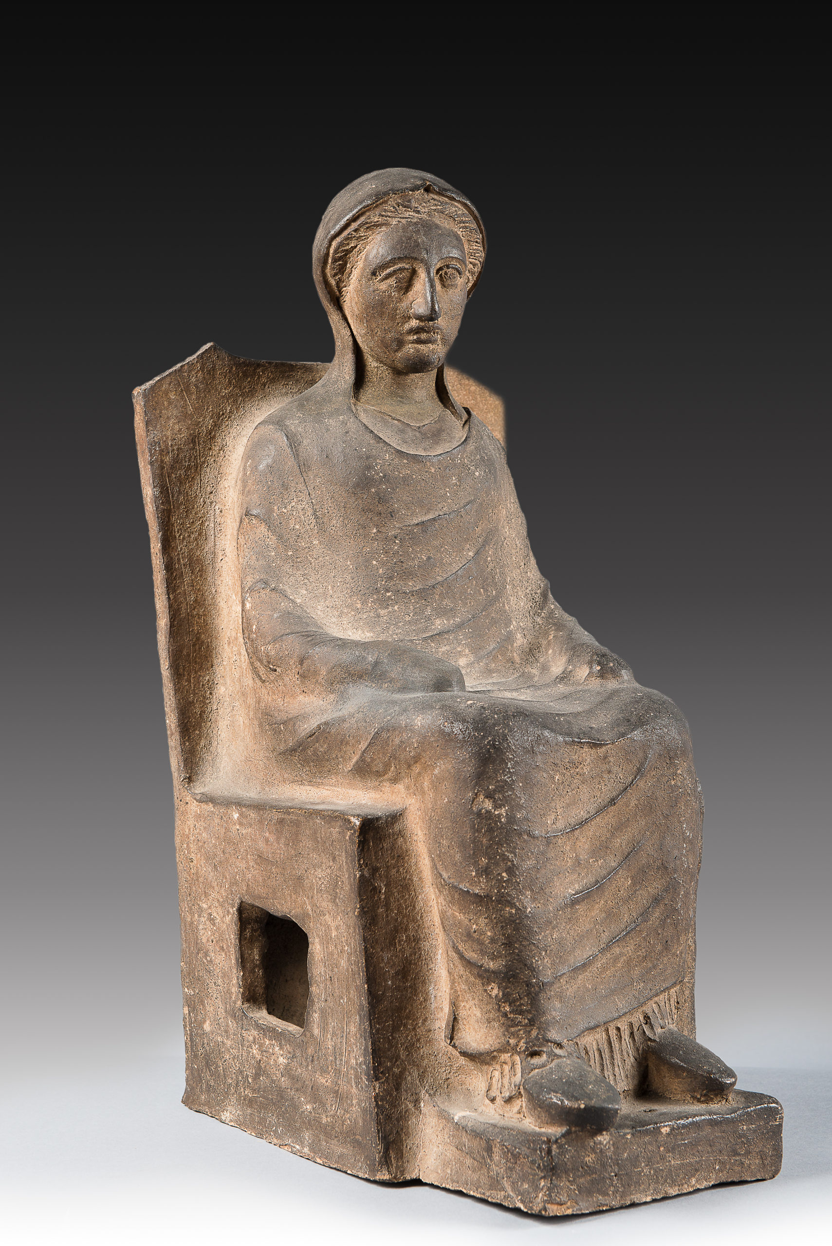 Dame assise sur un trône ajouré. Elle porte le chiton plissé qui laisse apparaître ses pieds, et un himation lui couvre la tête. Ses bras sont posés sur ses jambes. Son visage est empreint d’une grande intériorité.