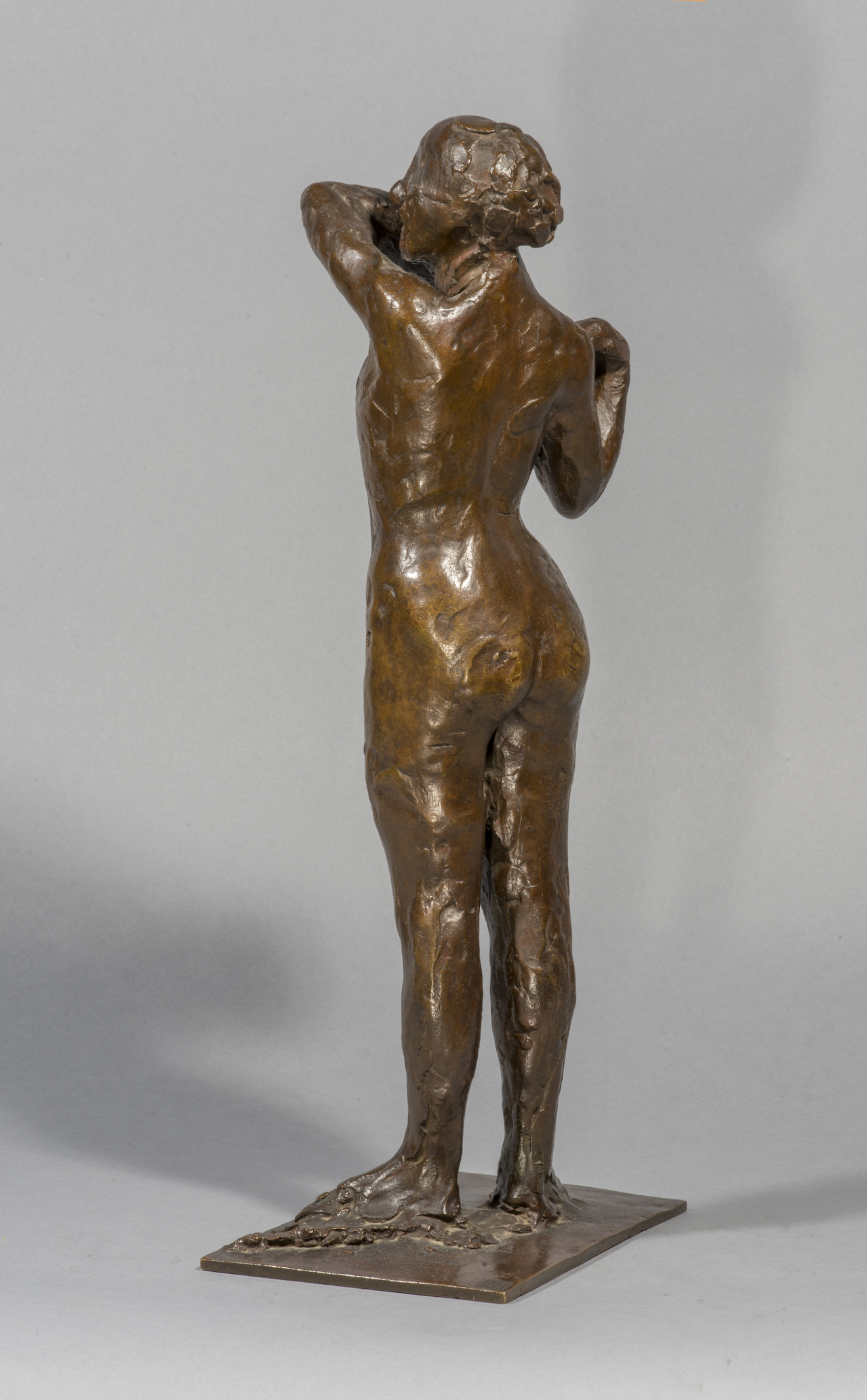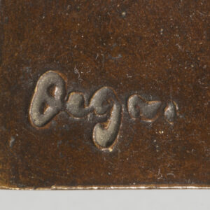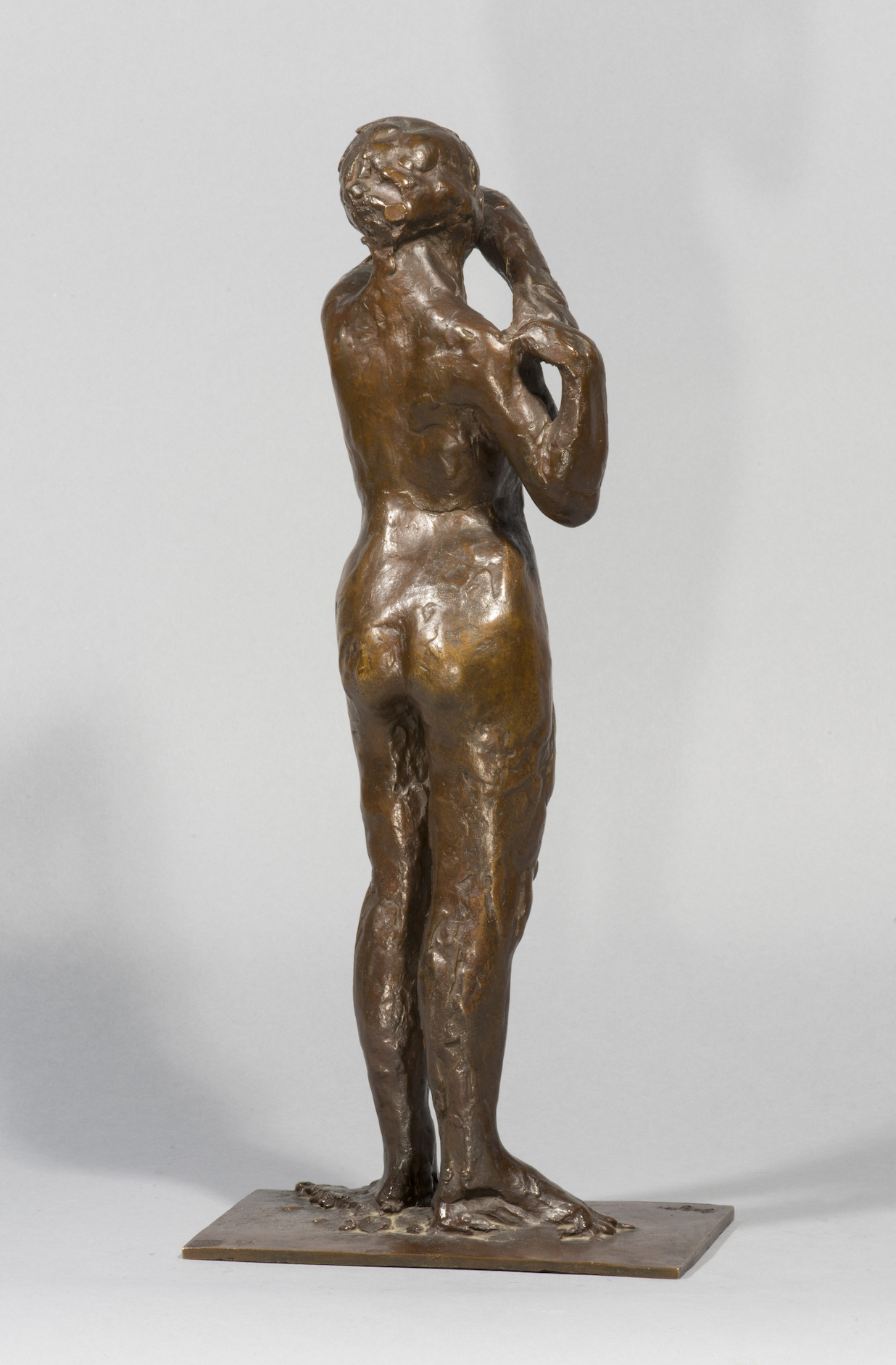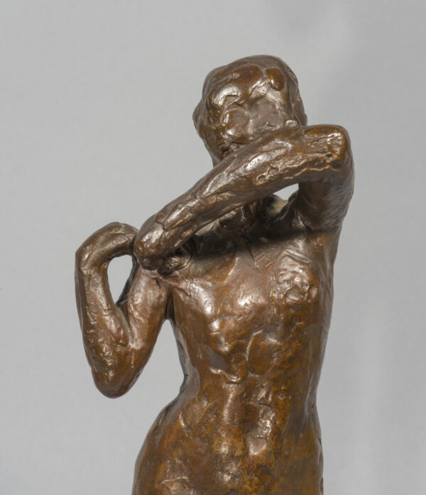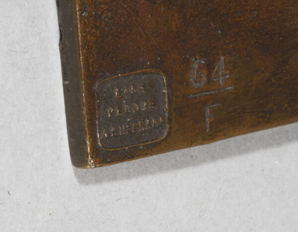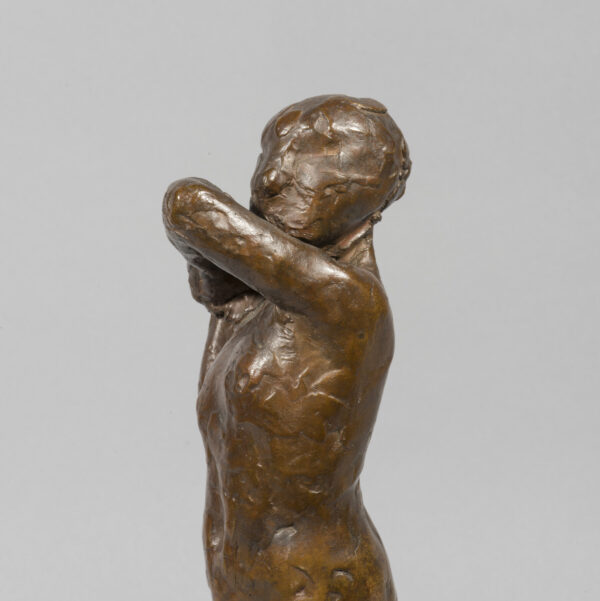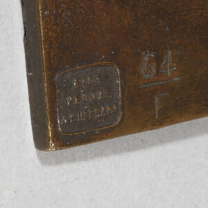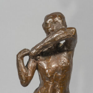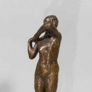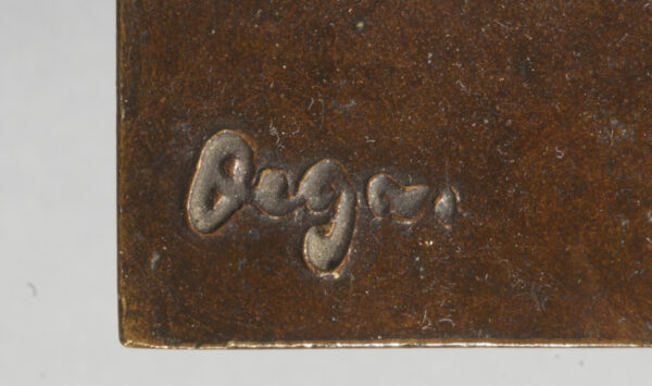 L’exposition Barye en 1875 à l’Ecole des Beaux-Arts et celle de Daumier en 1878 ont pu jouer un rôle sur la carrière de sculpteur de Degas et sur son choix de petits formats. On peut également évoquer l’article de Duranty de 1879 sur « les statuettes tanagra » qui venaient d’’être découvertes. Sa carrière publique de sculpteur se limita à la présentation d’une unique statue, la Petite danseuse de quatorze ans, à la sixième exposition impressionniste de 1881. On est saisi par le fait que presque toutes les danseuses modelées par Degas sont nues quand ses pastels et ses toiles montrent quasiment toujours des ballerines en costume. Les différentes arabesques s’affirment ainsi comme des squelettes d’attitudes, des charpentes de mouvement ; autant de témoignages magnifiques de cette sculpture de peintre comparable aux oeuvres des plus grands statuaires. Notre exemplaire possède toutes les caractéristiques des belles fontes Hébrard, notamment cette belle patine brun clair qui laisse transparaître la douceur du modelé de la cire originale.
