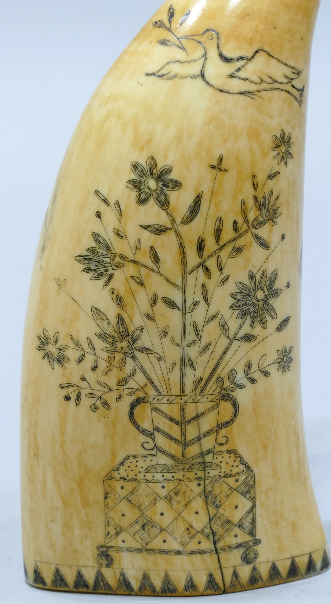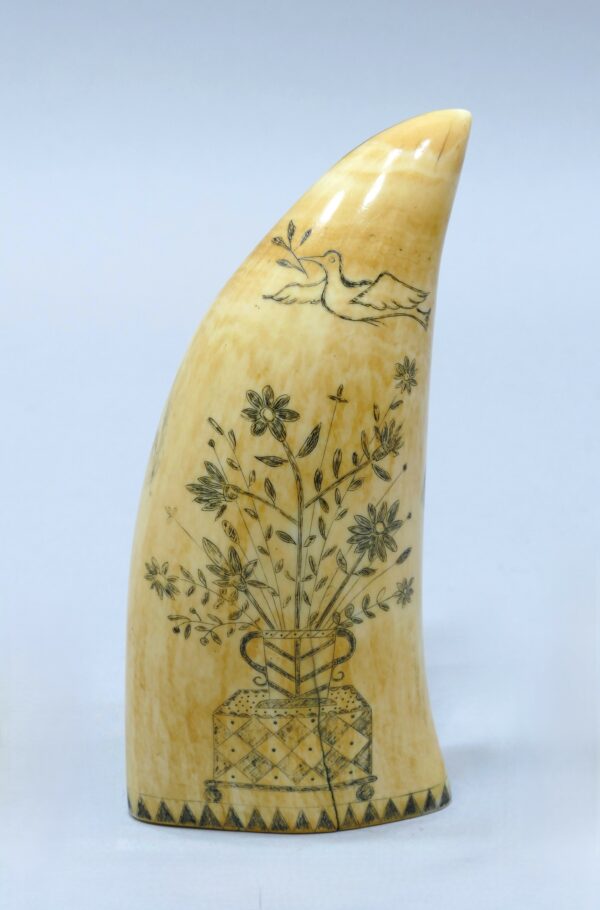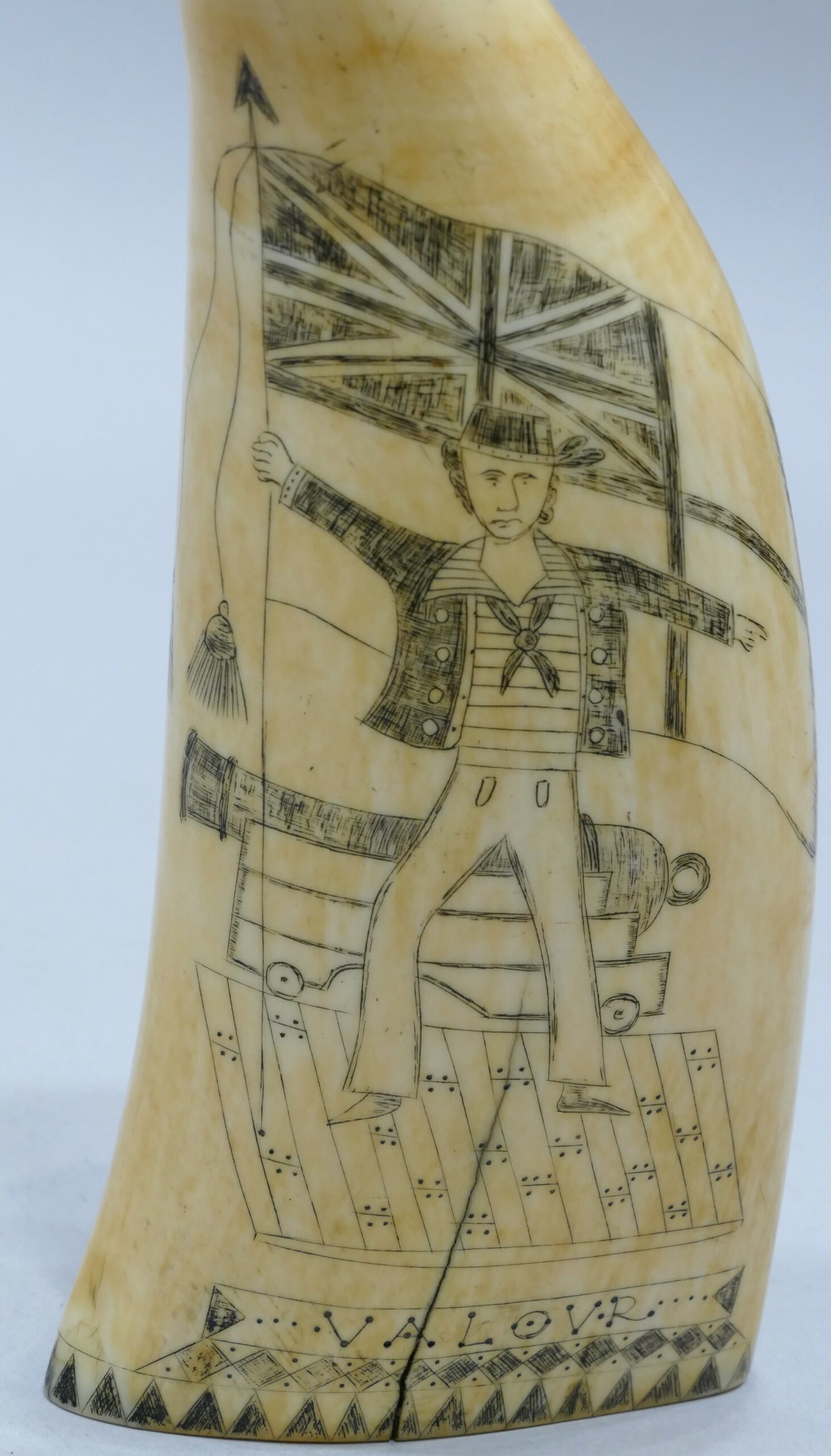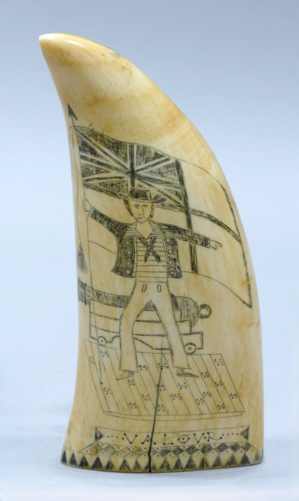 Dent de cachalot verticale gravée biface représentant un marin anglais sur le pont avec harpon, drapeau et canon, le tout surmontant l’inscription « VALOUR » (signifiant la « bravoure »).