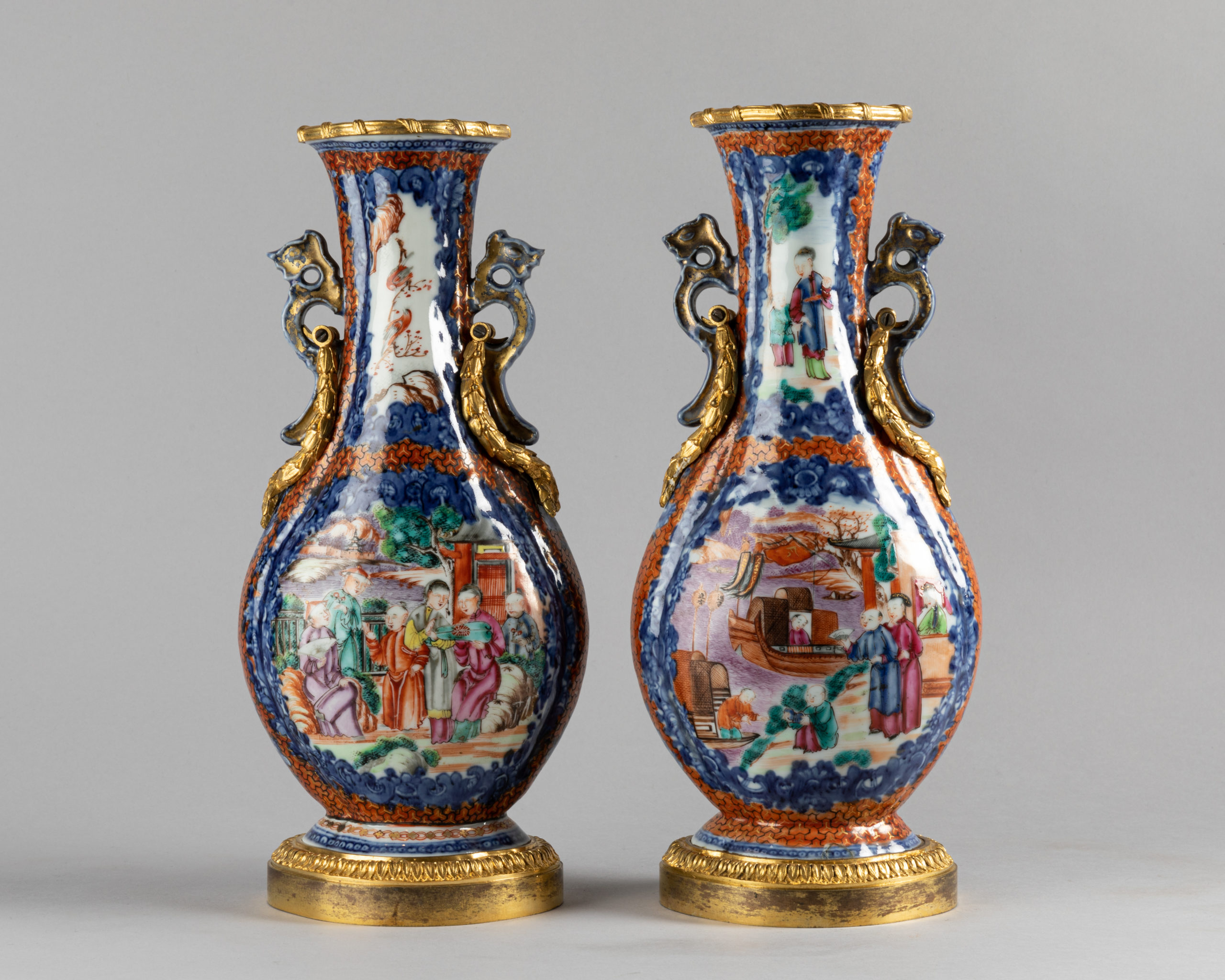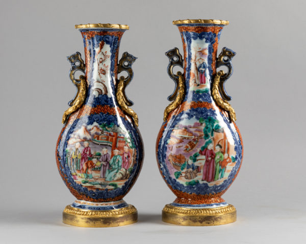 Deux vases formant paire en porcelaine de Chine période Qianlong, décor au mandarin, sur-décorés au XVIII°, monture bronze doré époque Louis XVI. Dimensions en CM : largeur 15 X hauteur 33 X profondeur 11