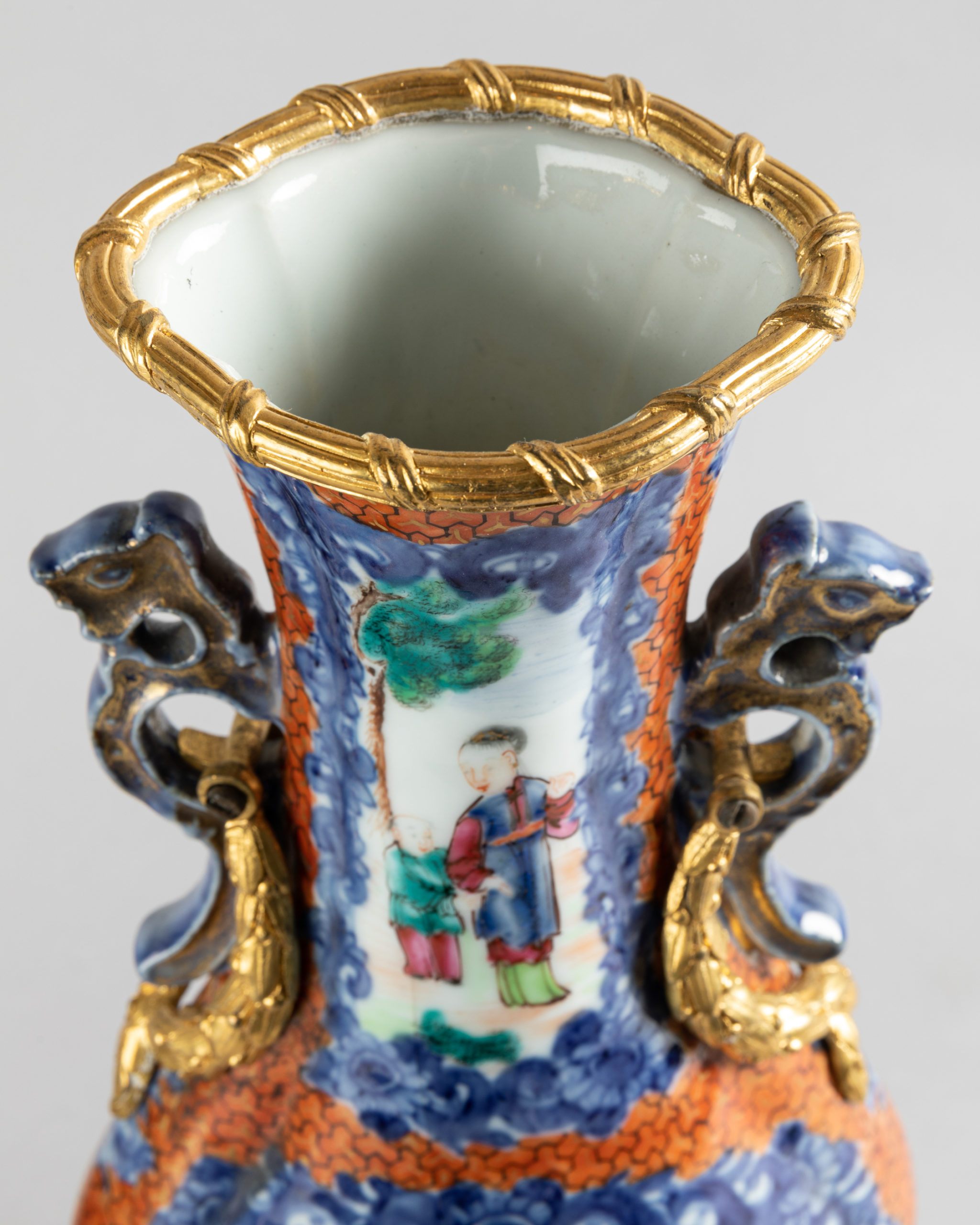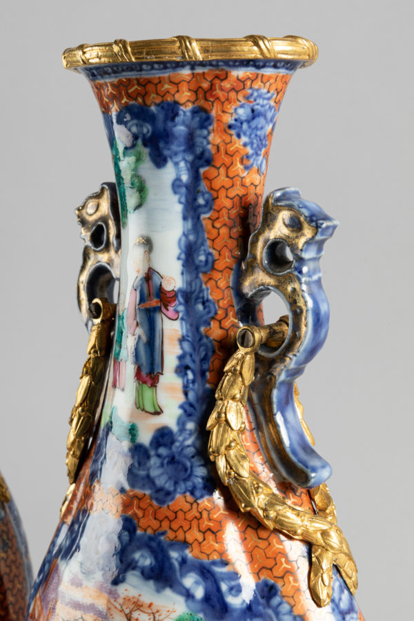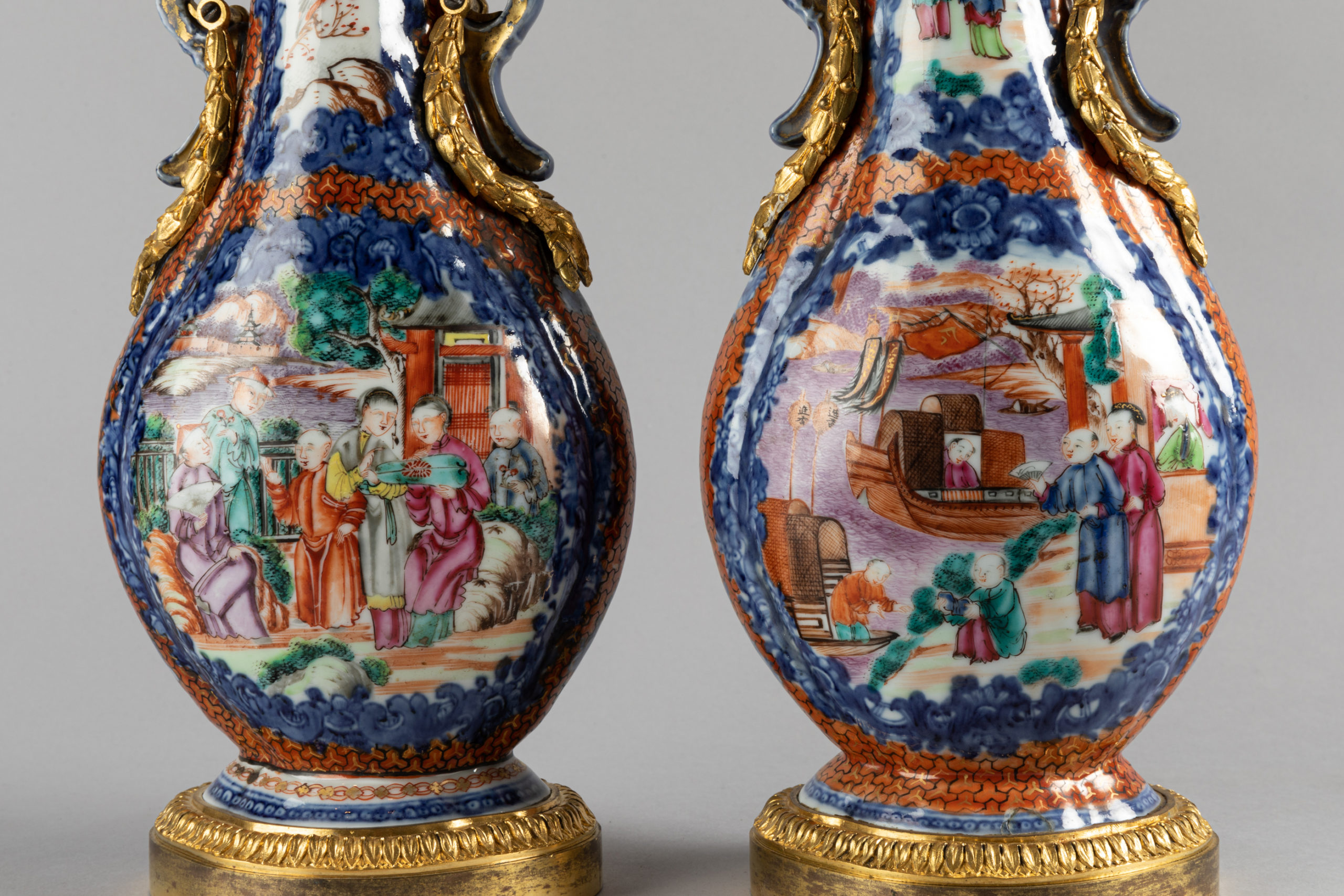 Two vases forming pair in China porcelain Qianlong period, decor au mandarin, on decorated 18th century, ormolu mounted Louis XVI period. Size in inches : width 6 X height 13 X depth 4,5