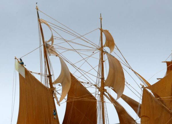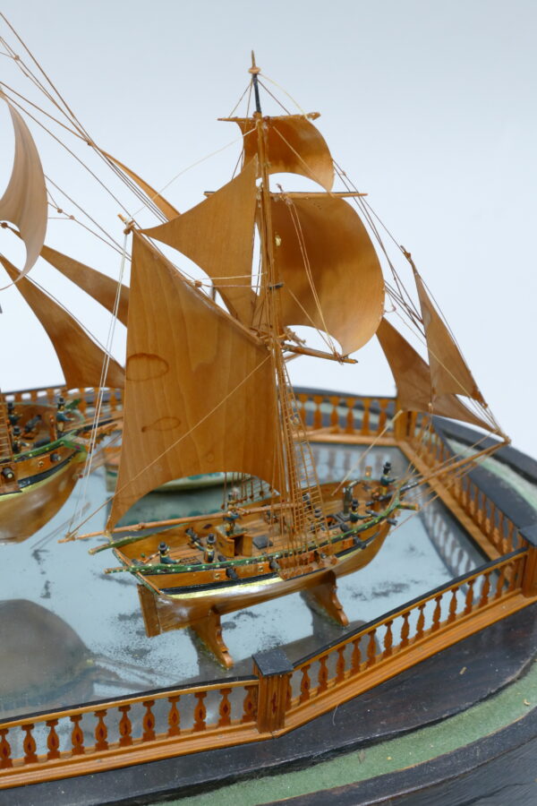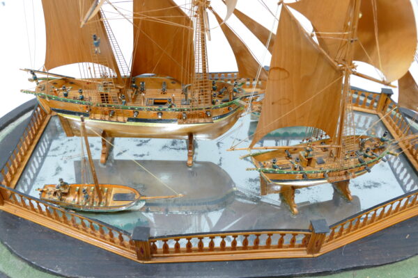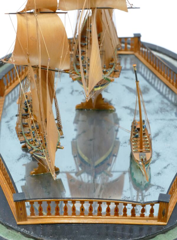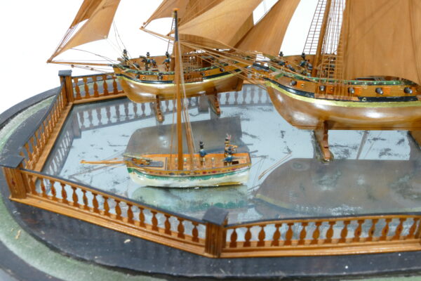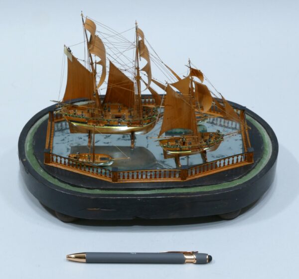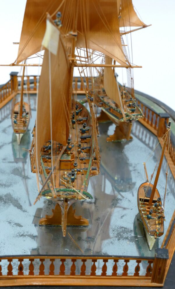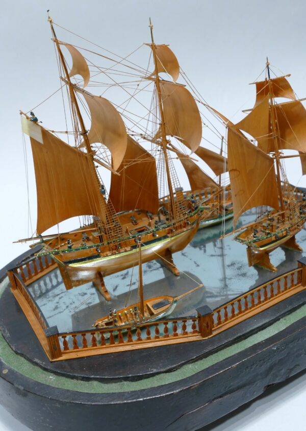 Ensemble de quatre maquettes de ponton miniatures en buis comprenant un vaisseau armé à deux mâts toutes voiles dehors, un second de plus petite taille également armée et toutes voiles dehors, puis deux cotres de part et d’autre dont un armé.