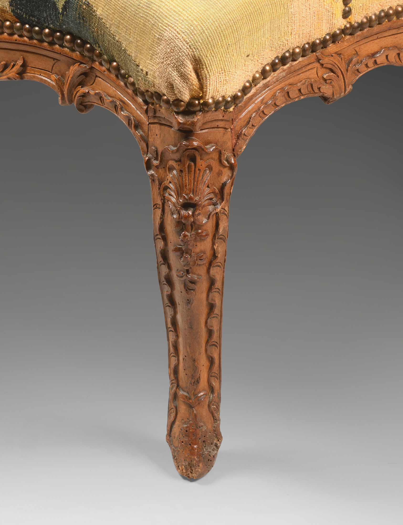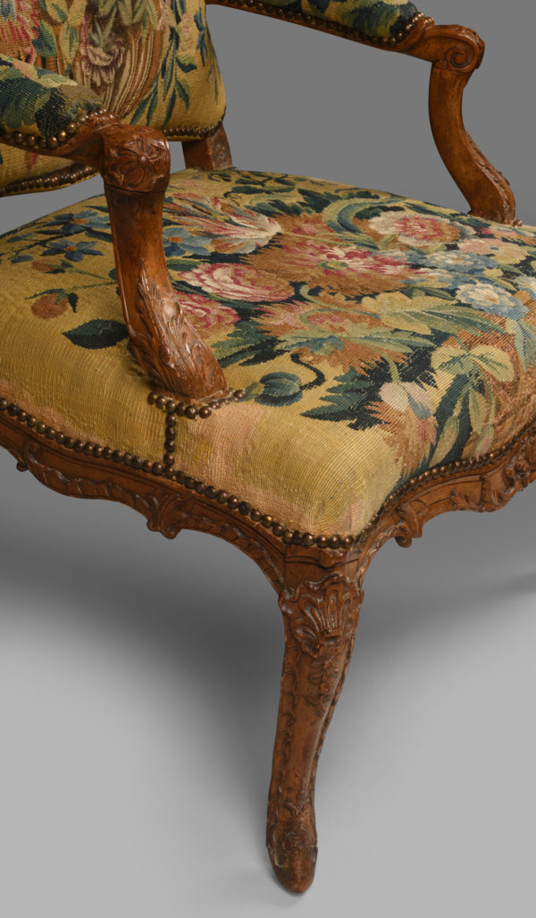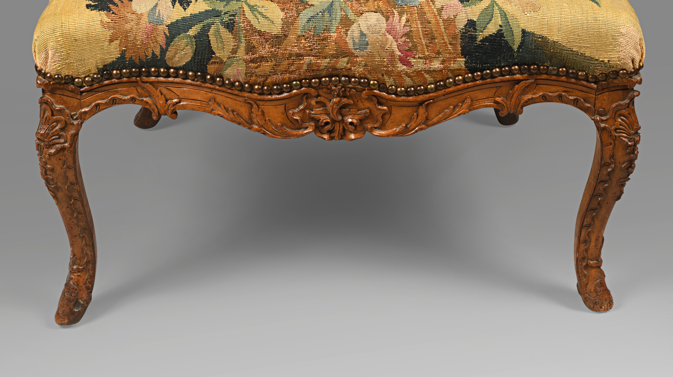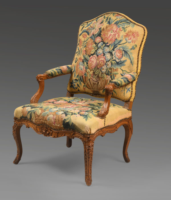 Fauteuil en hêtre à dossier plat et mouvementé. Pieds cambrés. Ornementation de coquilles, rinceaux, descente de bras en coup de fouet. Il est recouvert d’une tapisserie XVIIIème à motifs floraux.