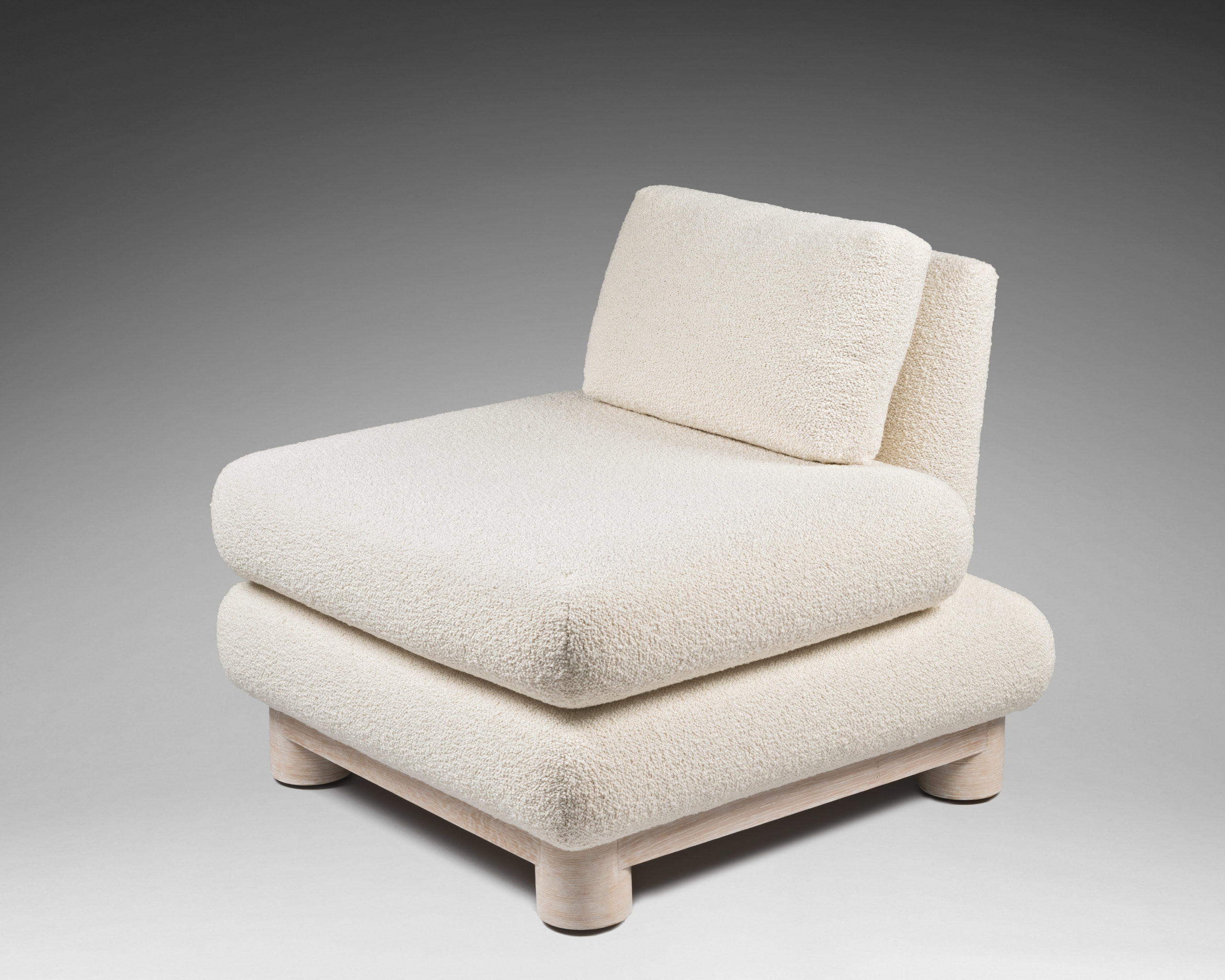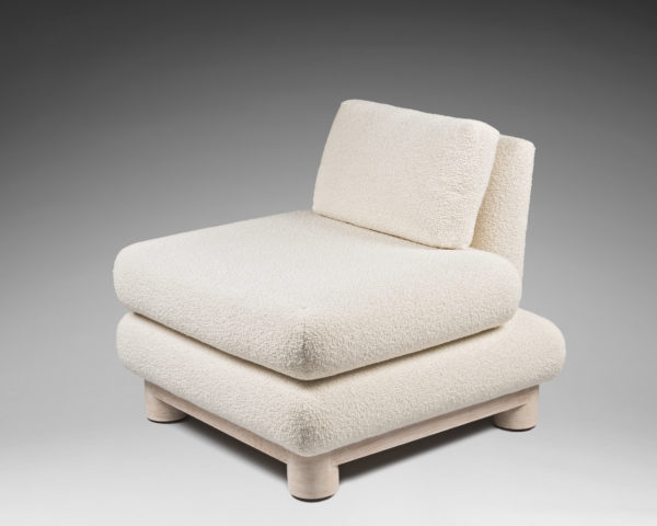 Large fauteuil composé de coussins sur structure en chêne cérusé.