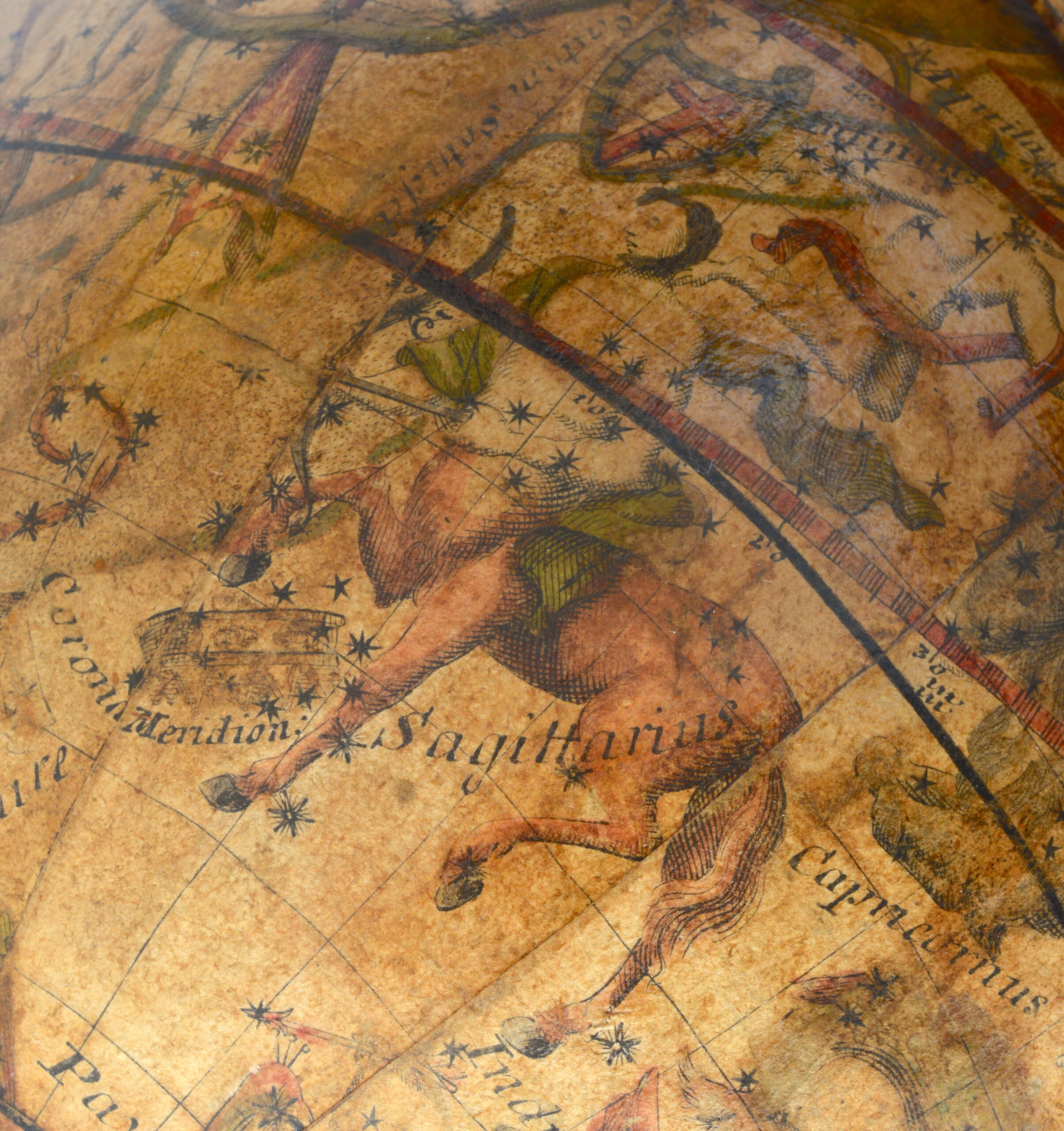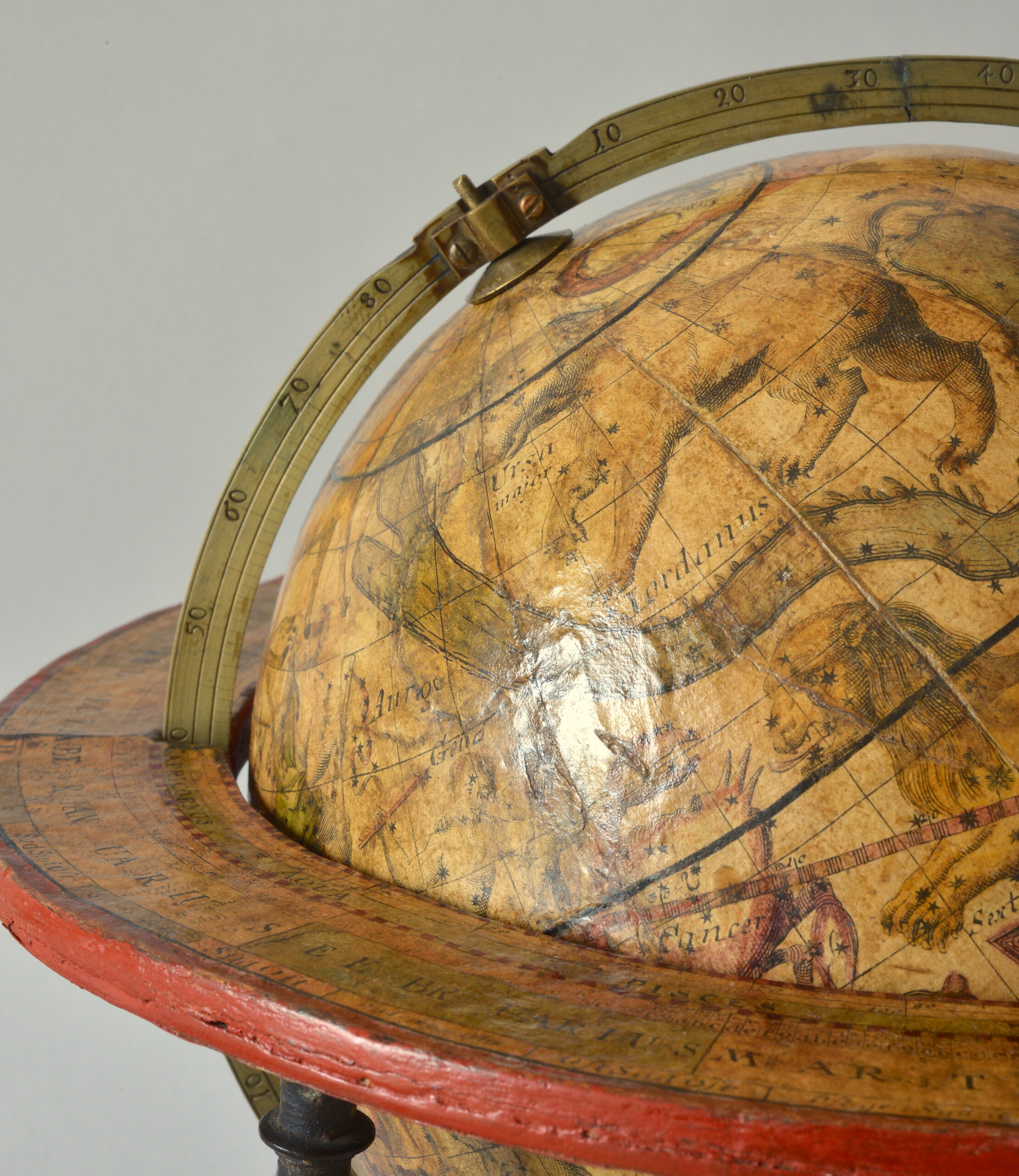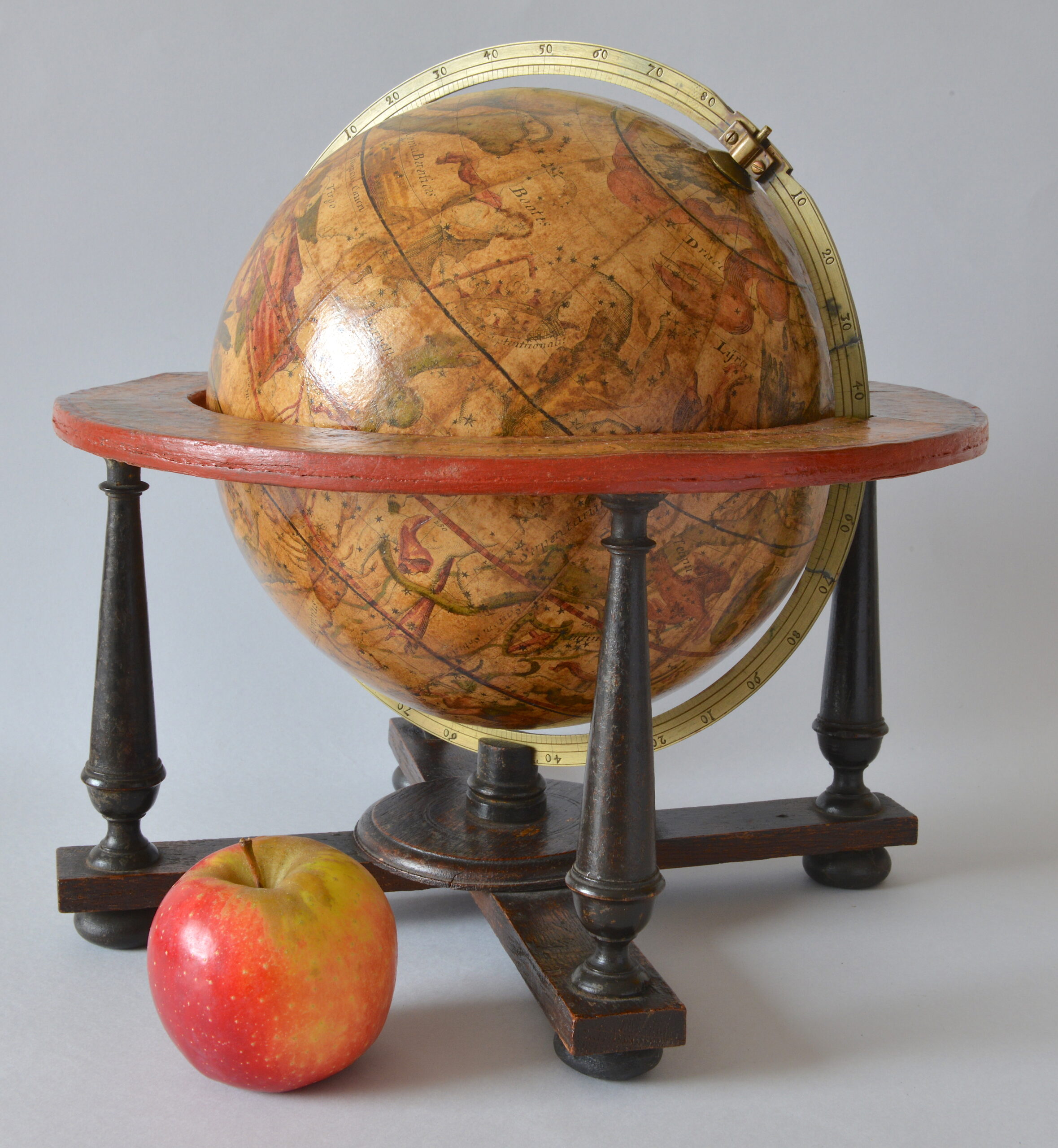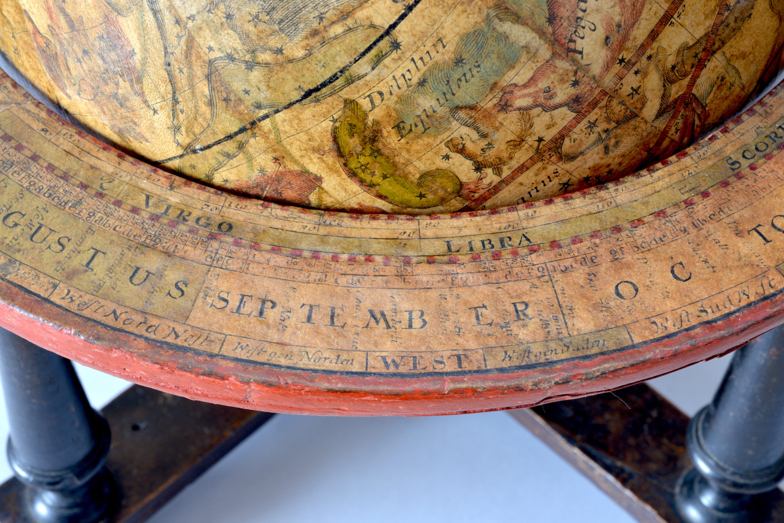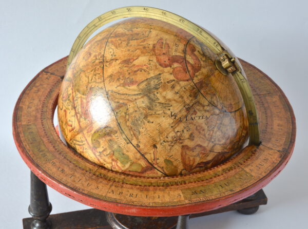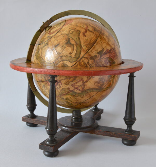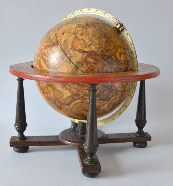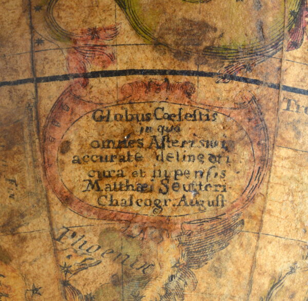 Le globe constitué de douze fuseaux collés et aquarellés portant les constellations de Ptolémée avec leur nom et les principales étoiles. On trouve également les principaux cercles : Equateur et Ecliptique en rouge et divisés en degrés, les deux Tropique et les deux cercles polaires en noir. Dans l’hémisphère sud on trouve un cartouche signé : « Globus Coeslestis in quo omnes Alterismi accurate delineati cura et m.pensis Matthaei Seutteri Chalcogr. August ».