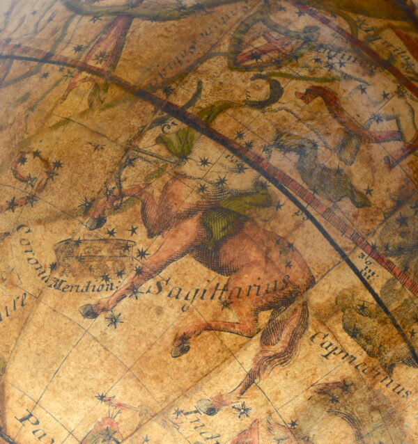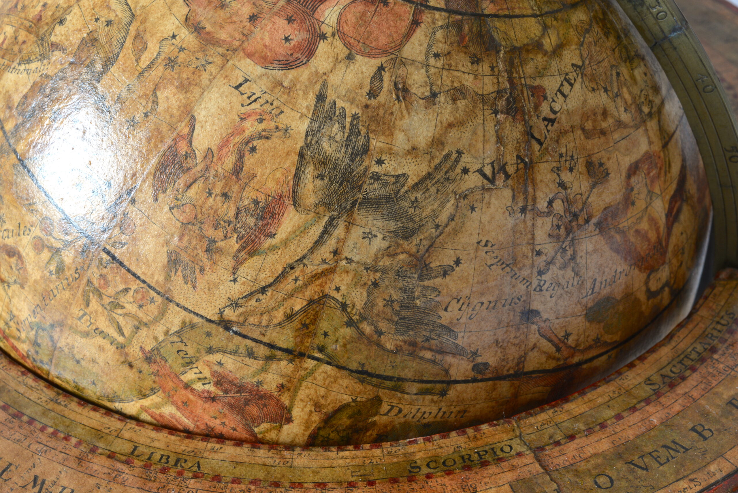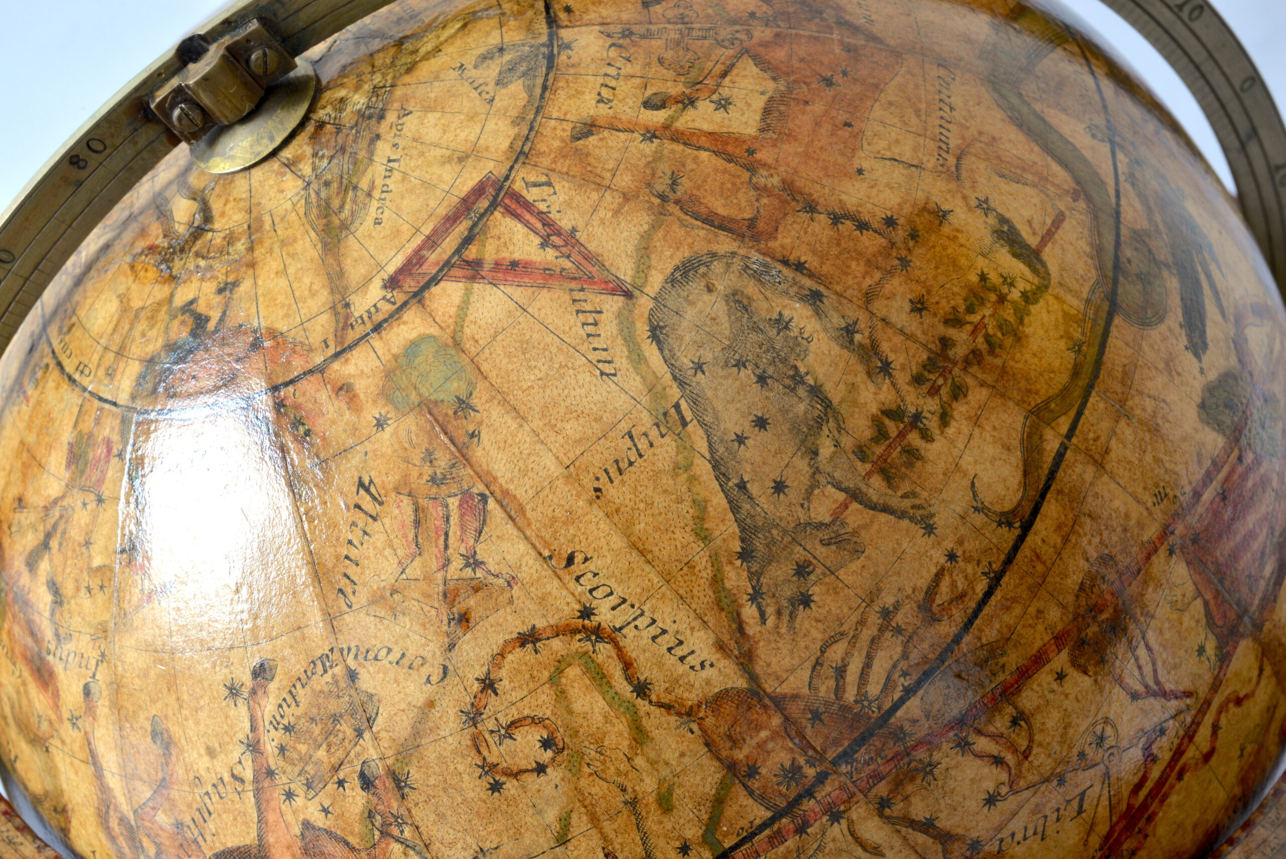 Globe céleste de bibliothèque en plâtre recouvert de fuseaux en papier aquarellé à l’intérieur d’un méridien de laiton enchâssé dans son support formé d’une table équatoriale reposant sur quatre pieds.