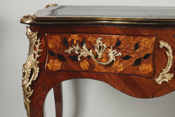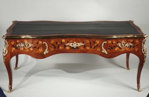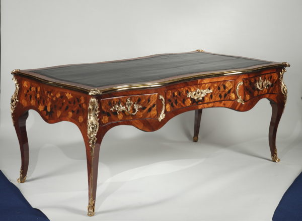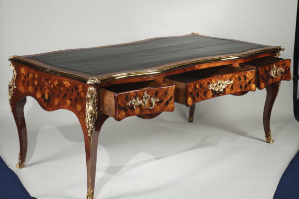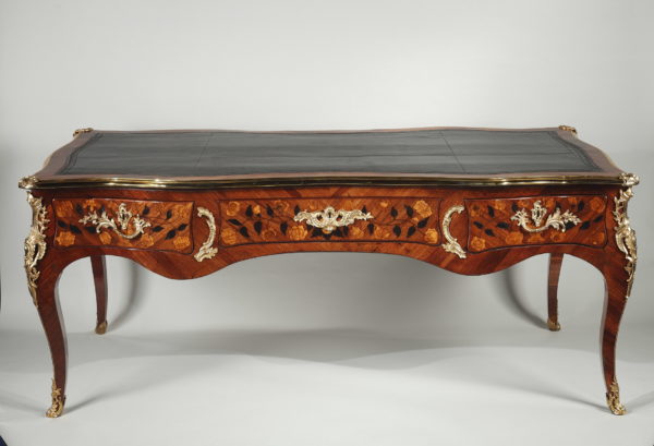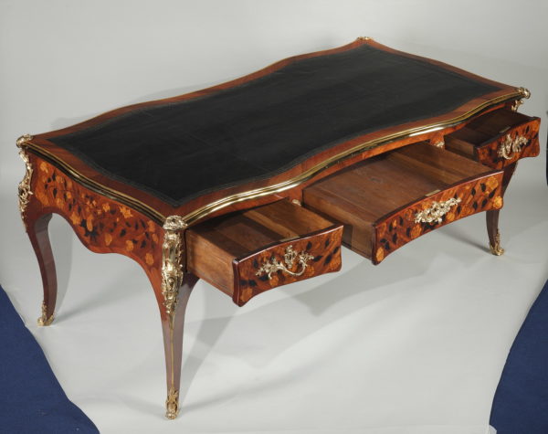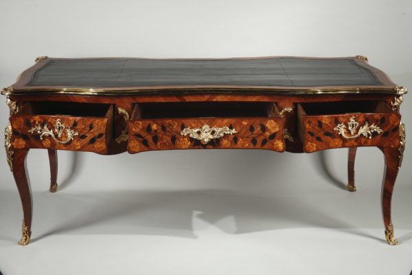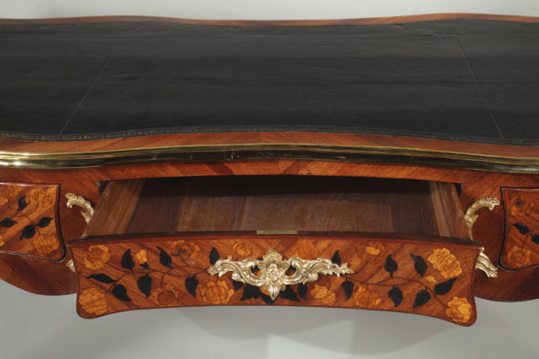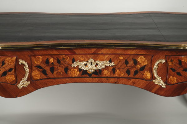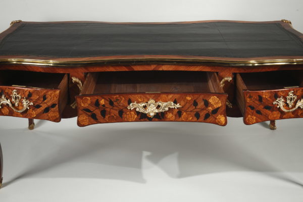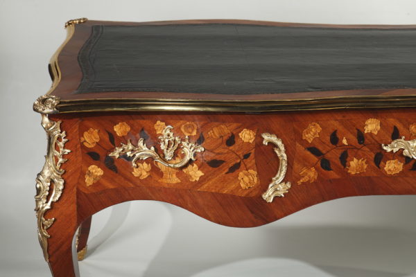 Grand bureau plat en satiné et amarante Le dessus de forme rectangulaire recouvert d’un maroquin noir et entouré d’une lingotière et de quatre agrafes en bronze doré à chaque coin, sa ceinture chantournée et marquetée de vases fleuris et autres motifs végétaux, ouvre par trois tiroirs en façade et trois tiroirs simulés de l’autre coté