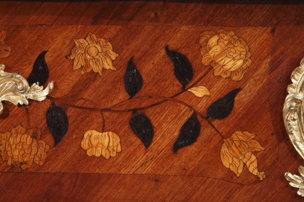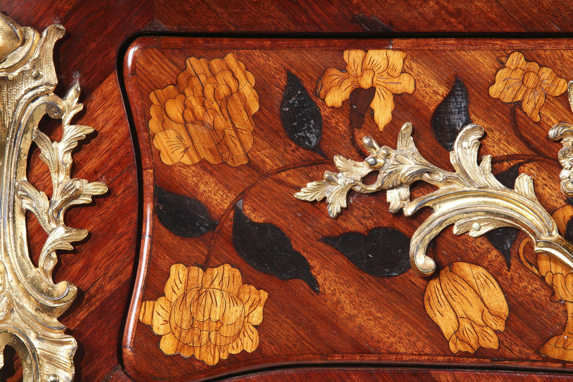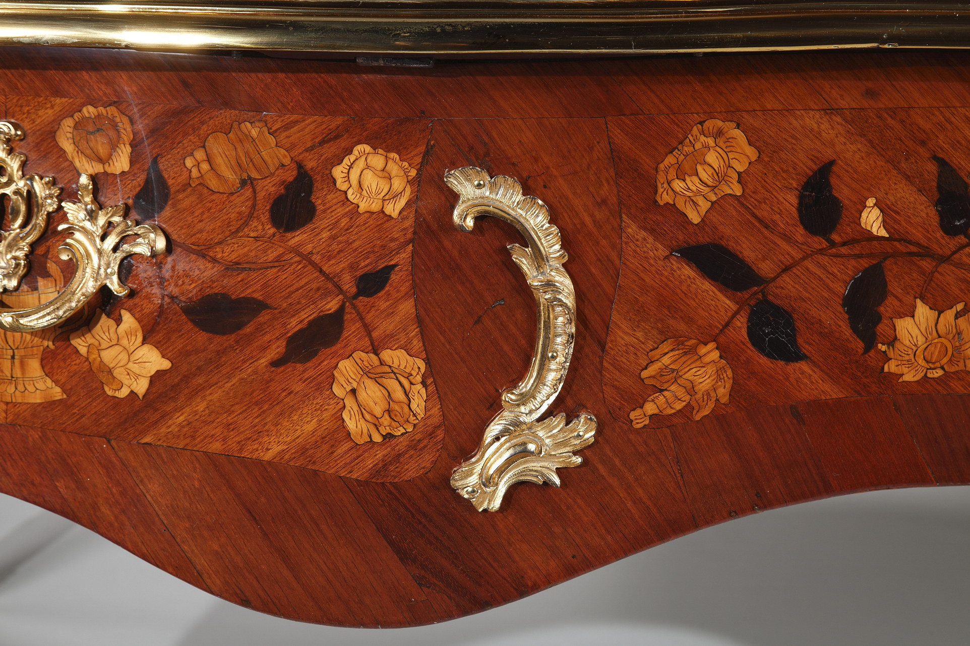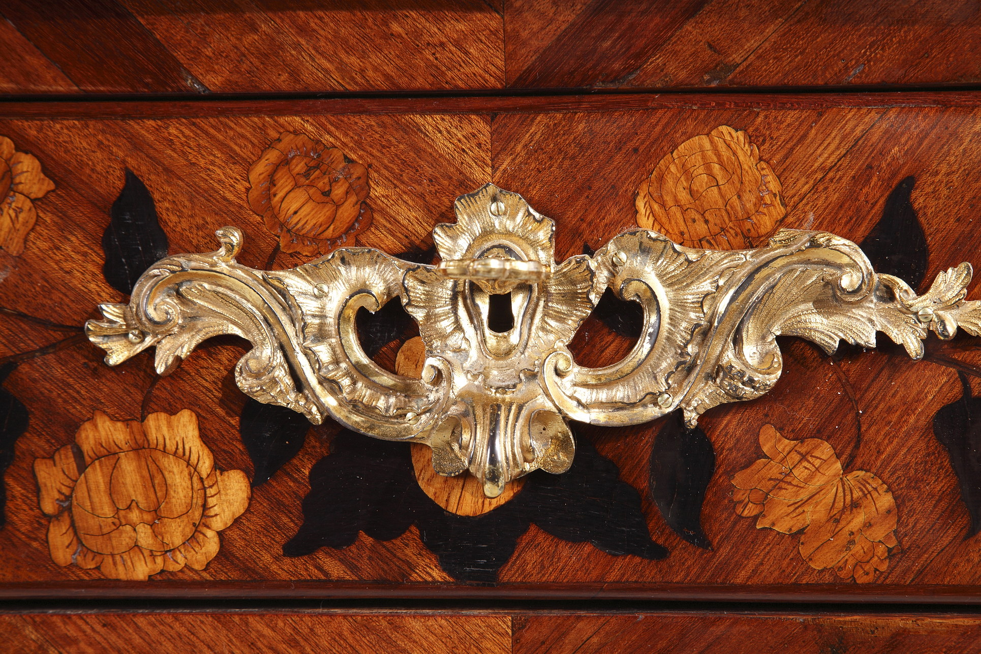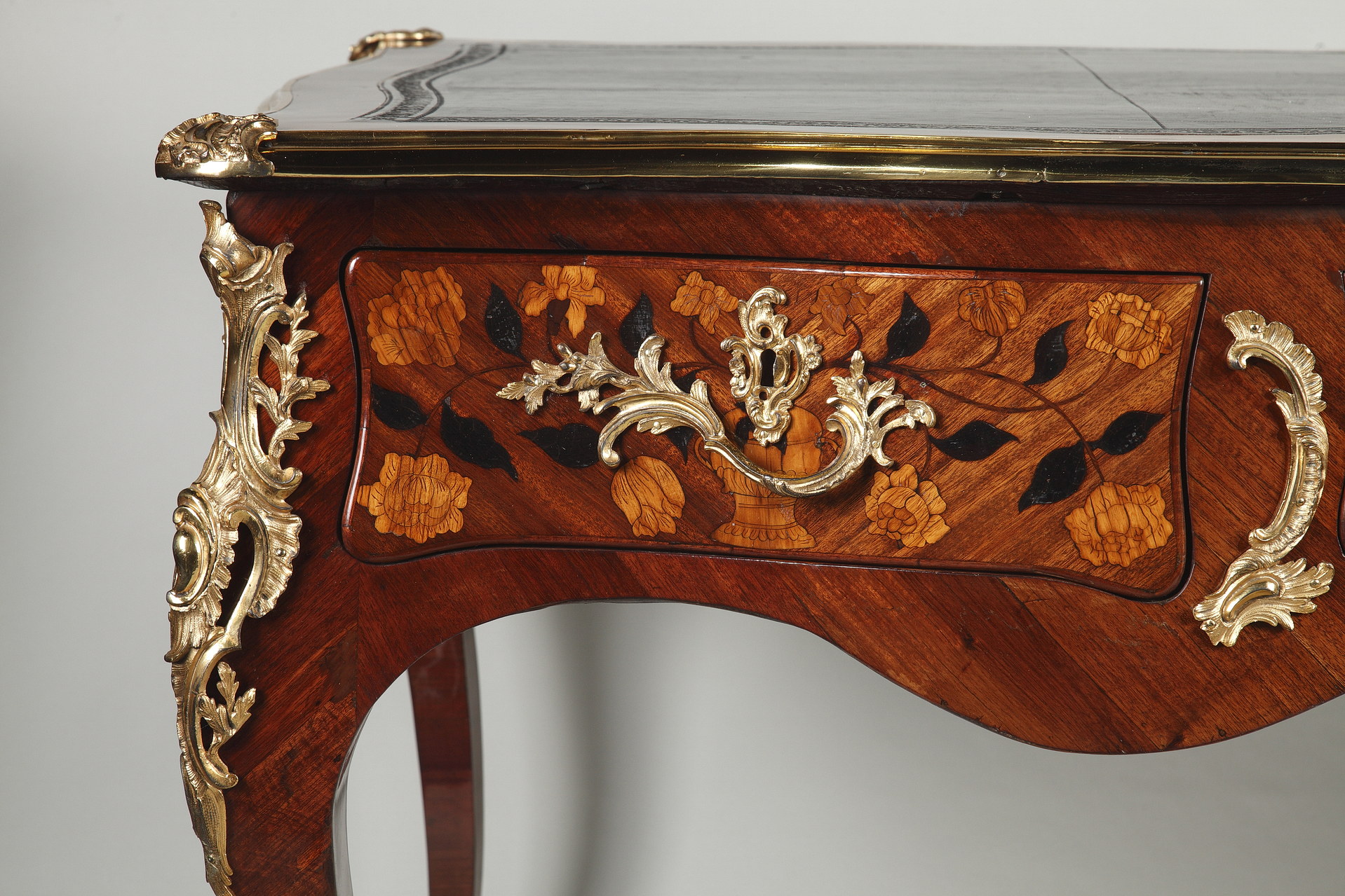 Riche garniture de bronze doré finement ciselé sur les chutes, entrées de serrures, poignées et sabots