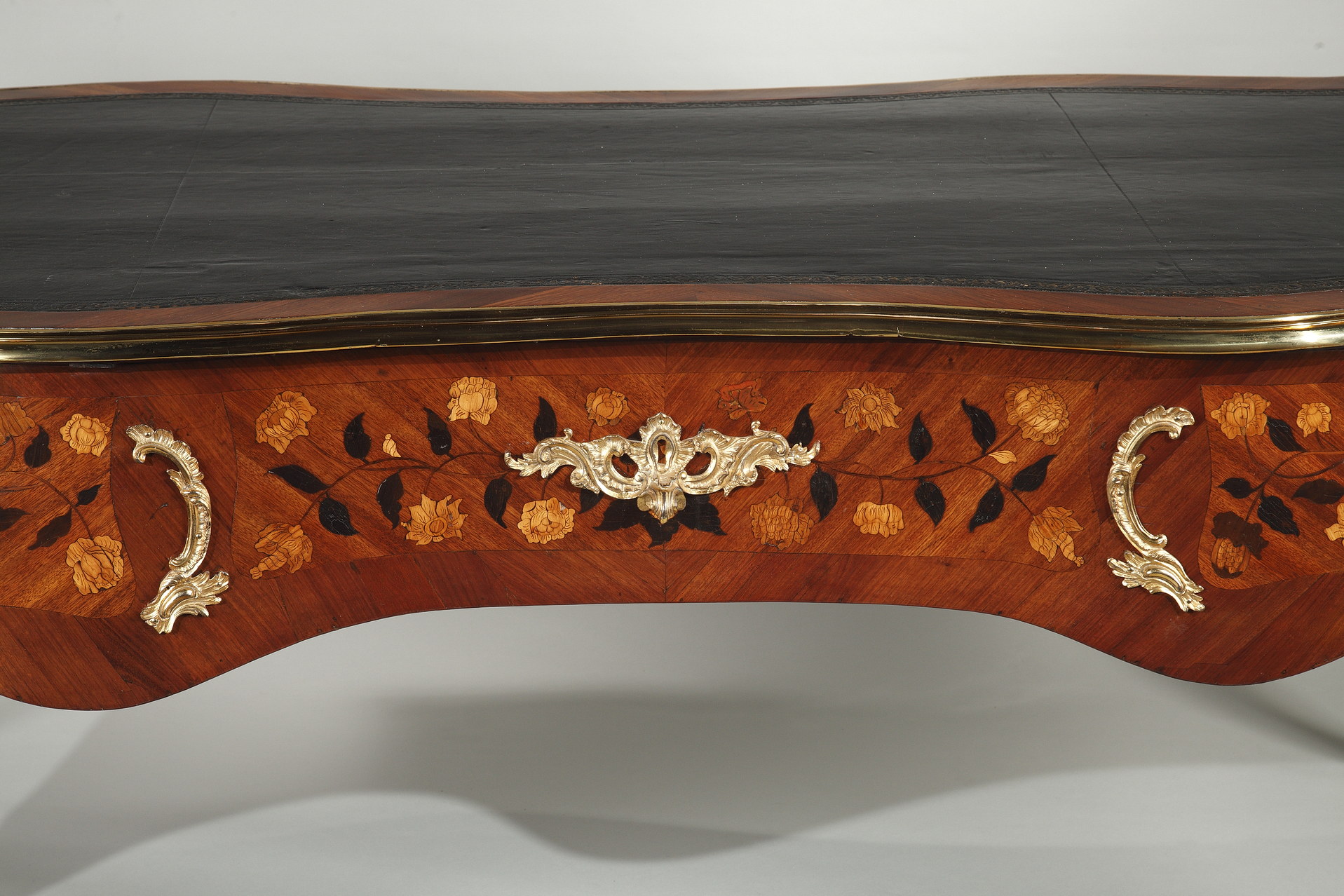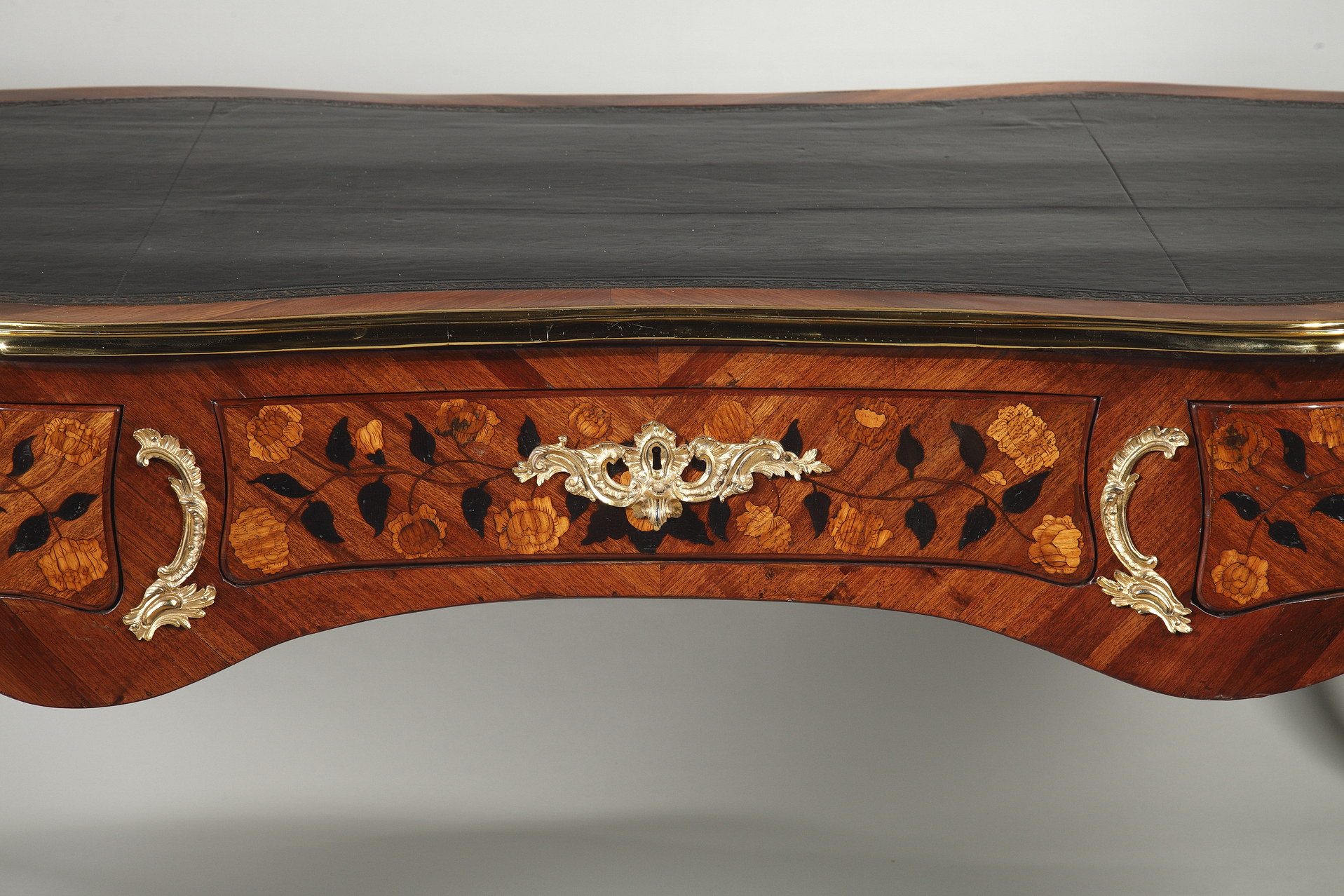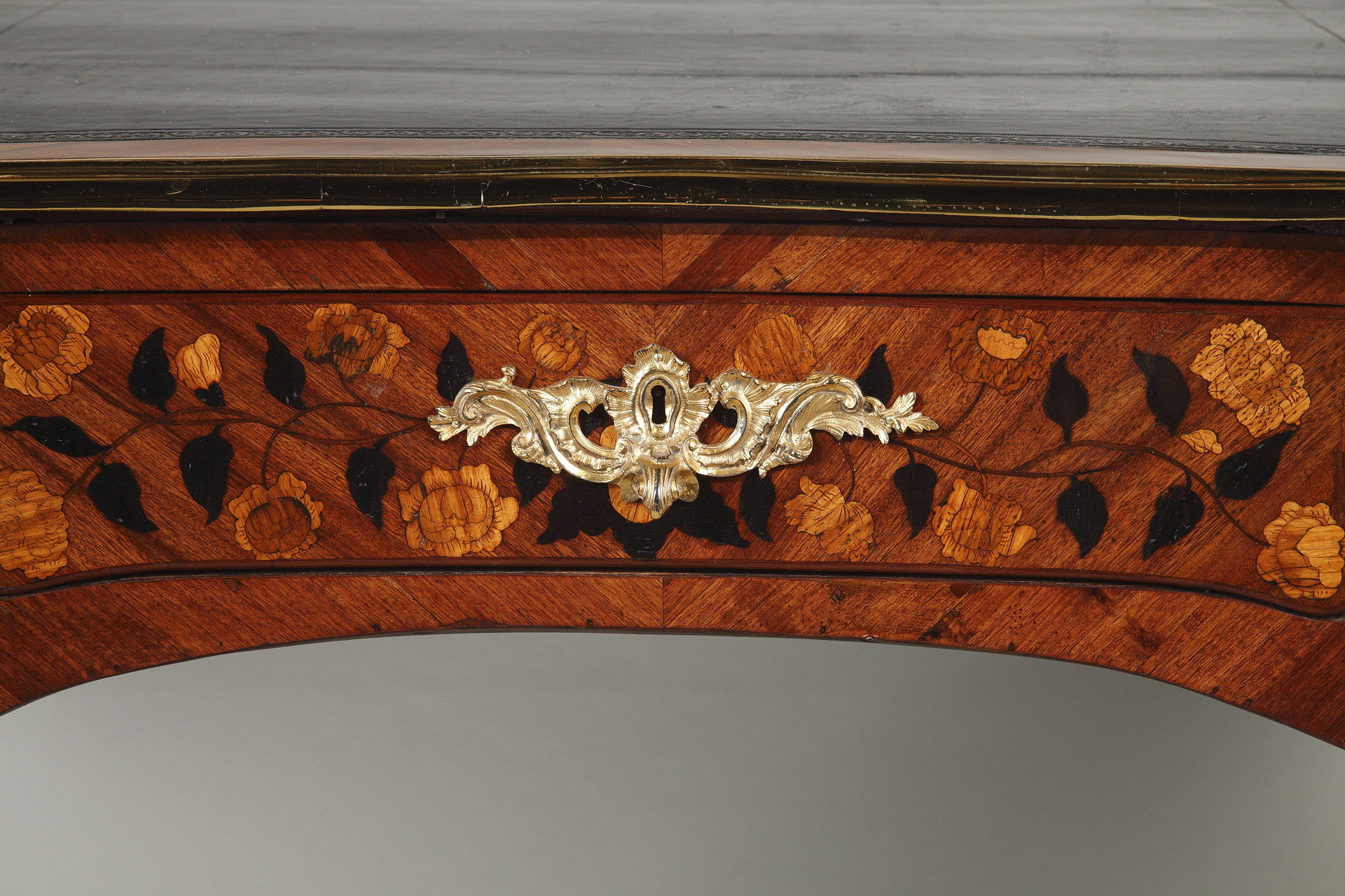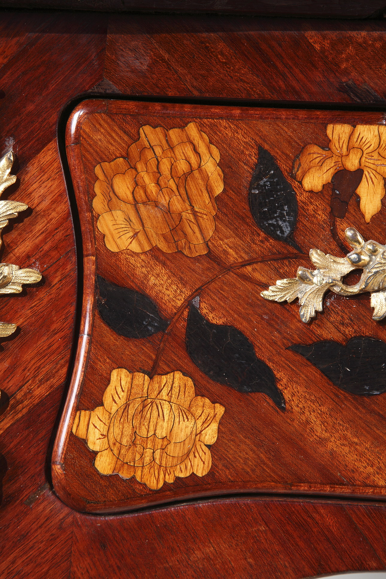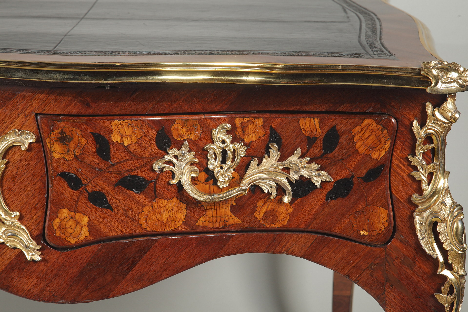 Riche garniture de bronze doré finement ciselé sur les chutes, entrées de serrures, poignées et sabots